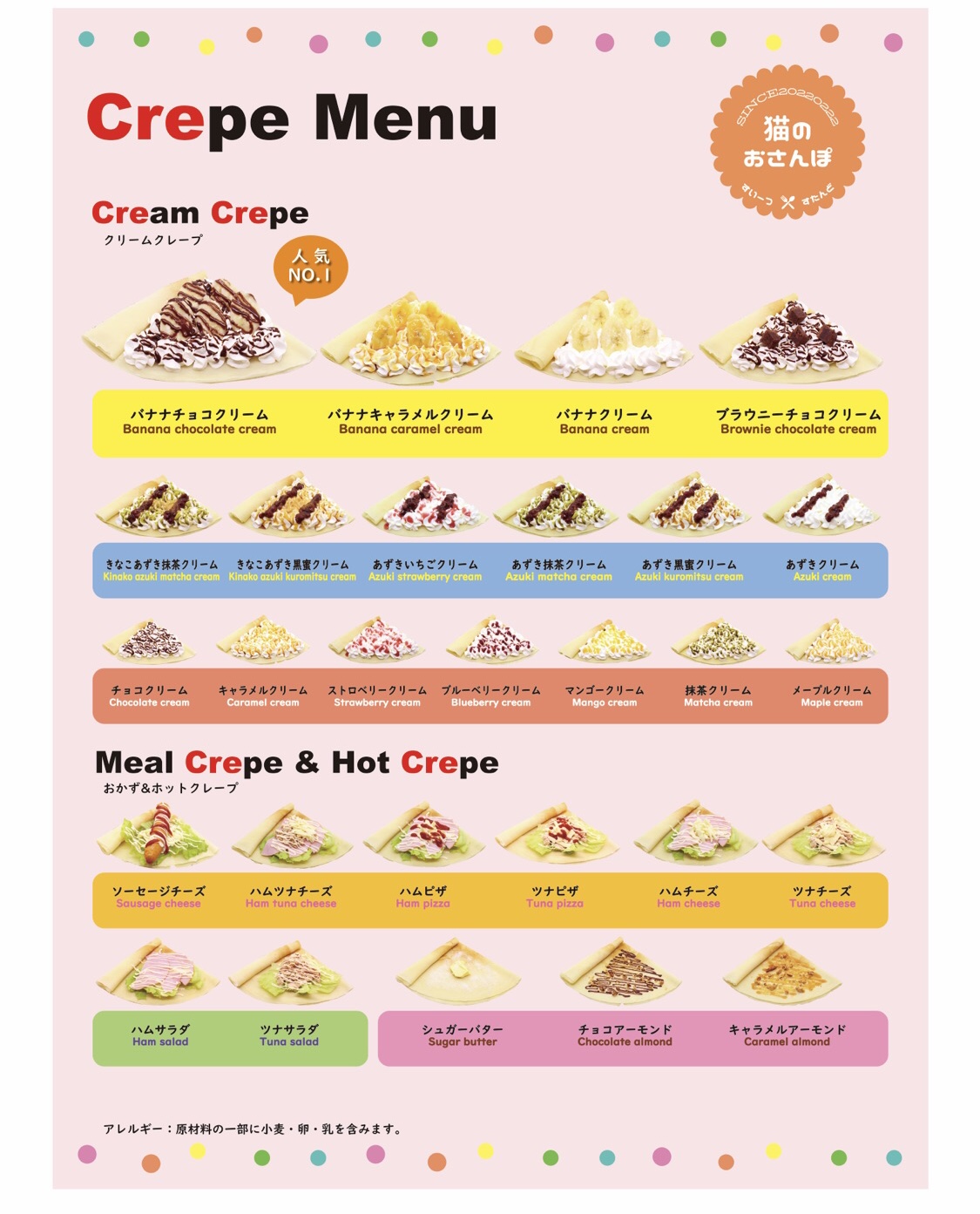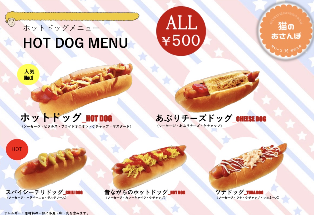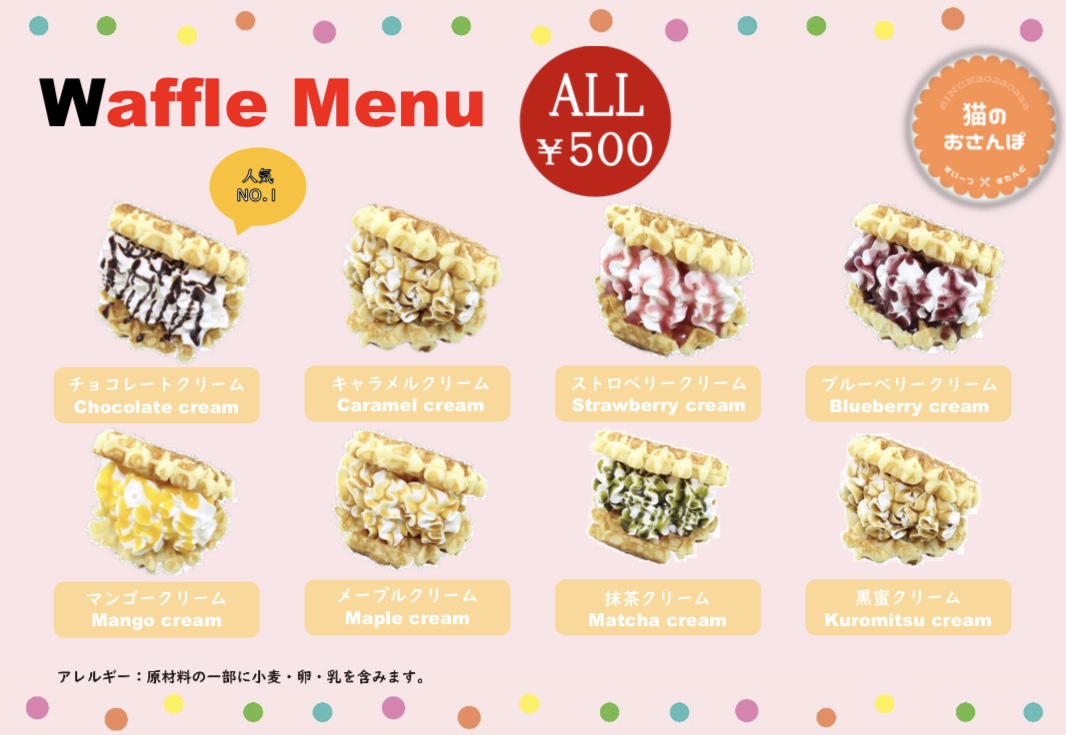 クレープ、ワッフル、ホットドック、タピオカドリンク、ソフトドリンク