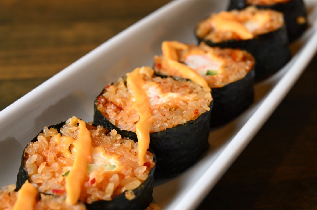 味付けご飯でチーズ、ツナ、卵を巻いた海苔巻きです