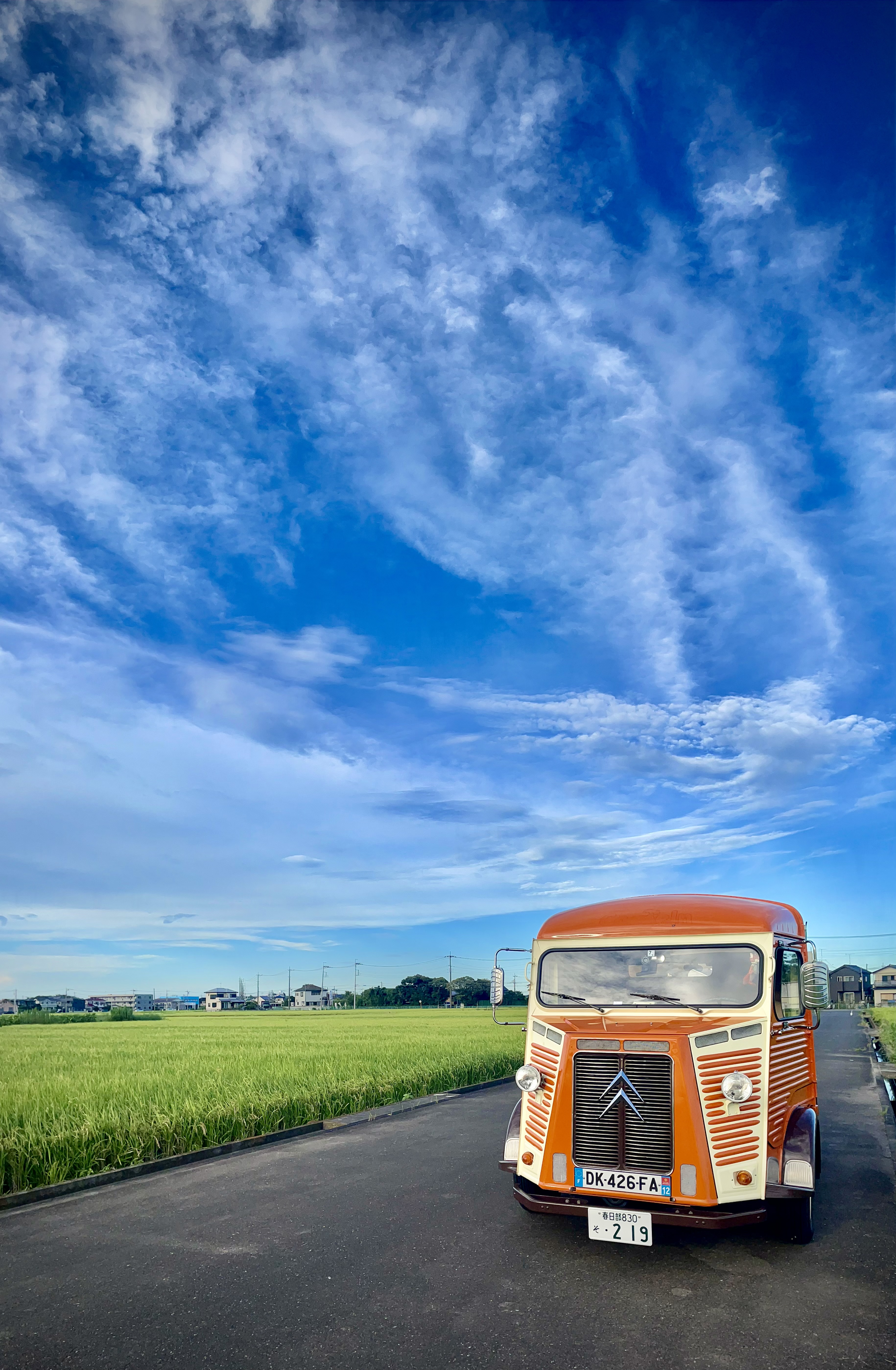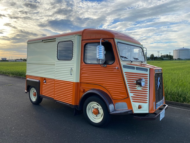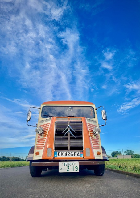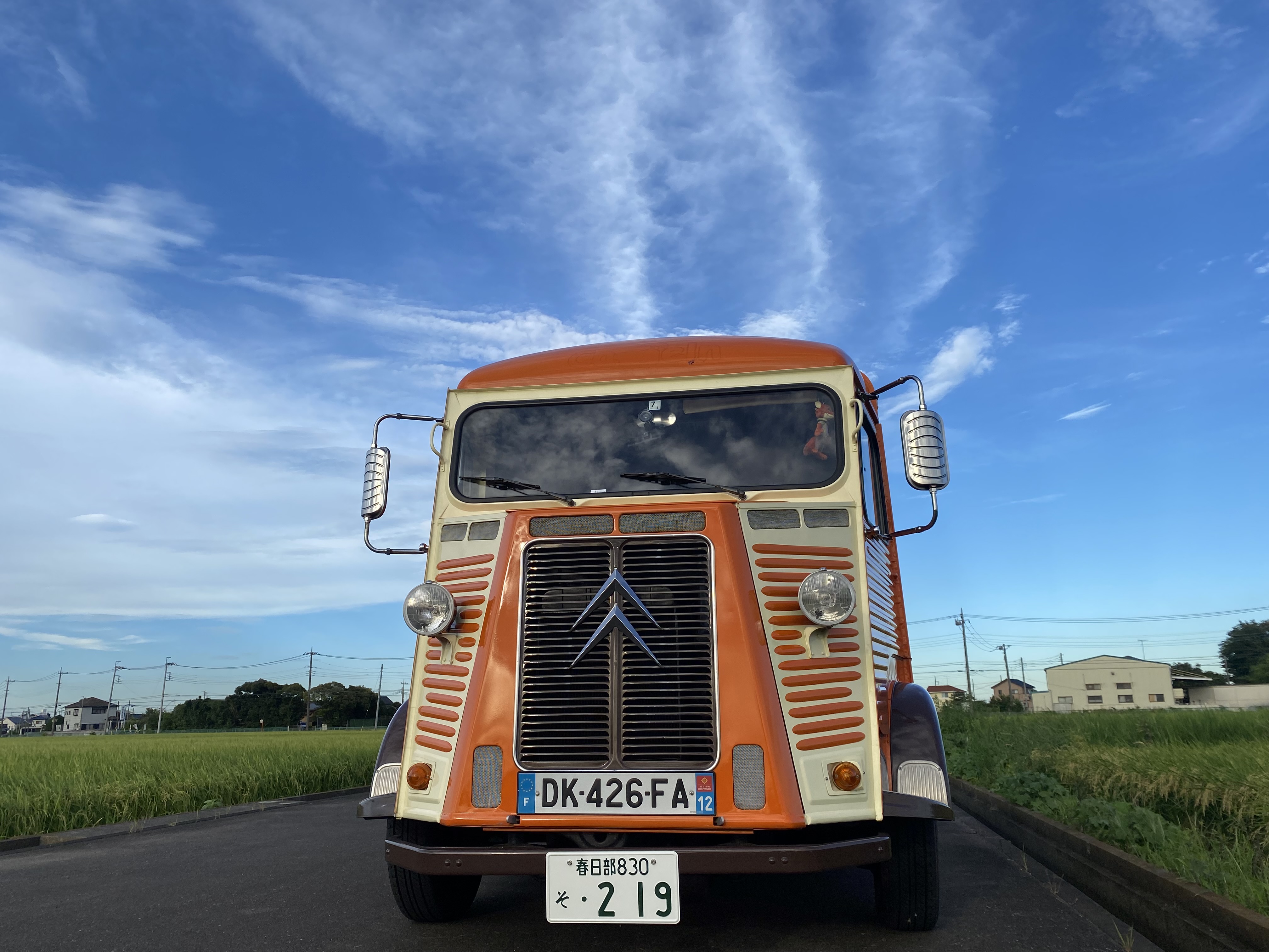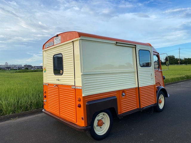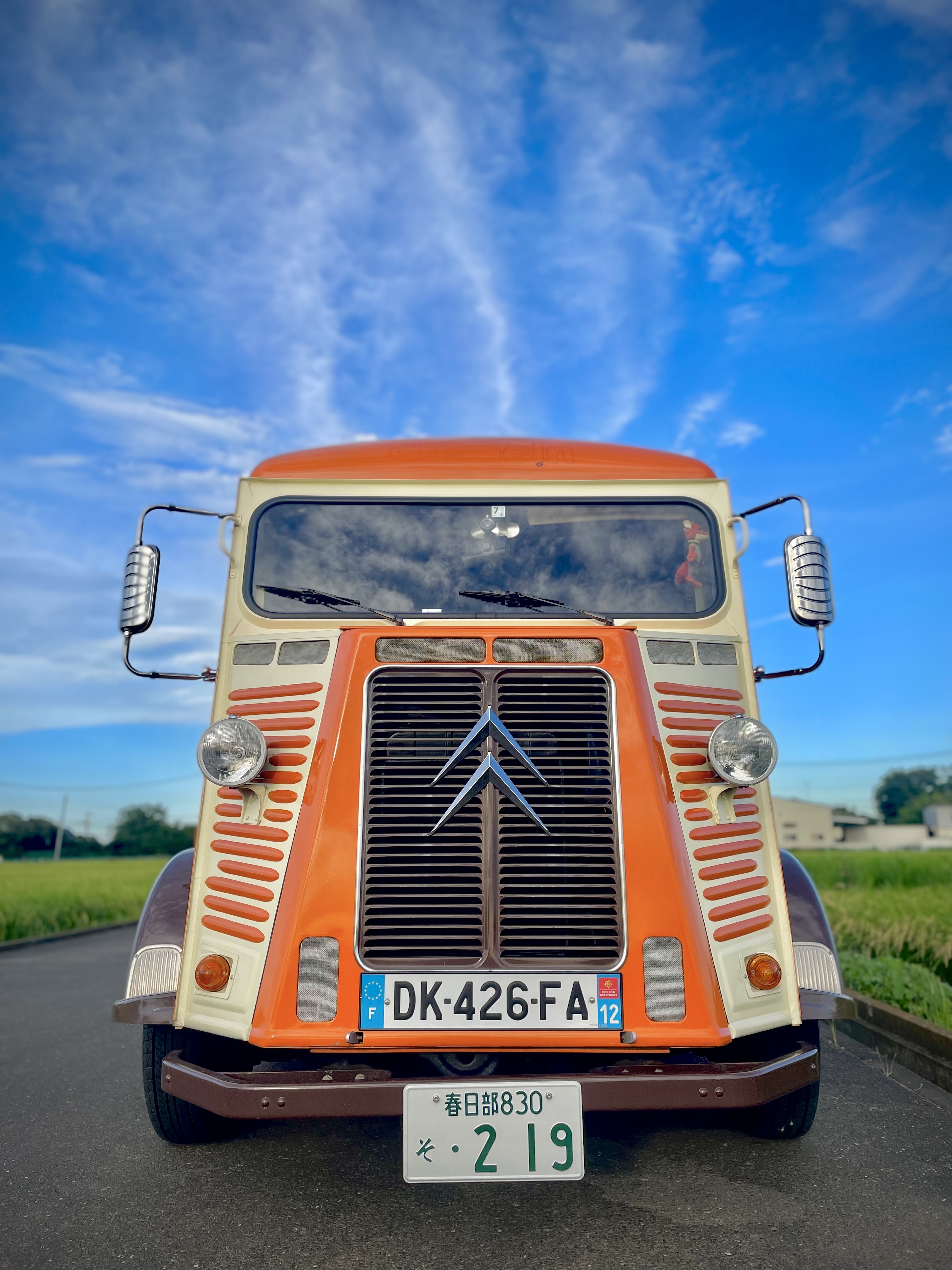 キオラコーヒーのキッチンカーは、1971年制のシトロエンHバン。50年以上前に製造されました。現在、自走できるHバンのキッチンカーは数えるほどしかありません。そのかわいらしいフォルムは子供からお年寄りまで人気です。またカラーリングもフランス、オランジーナ社が宣伝用にHバンを使った時の色を再現していて、ファミリーにも人気のある車です。