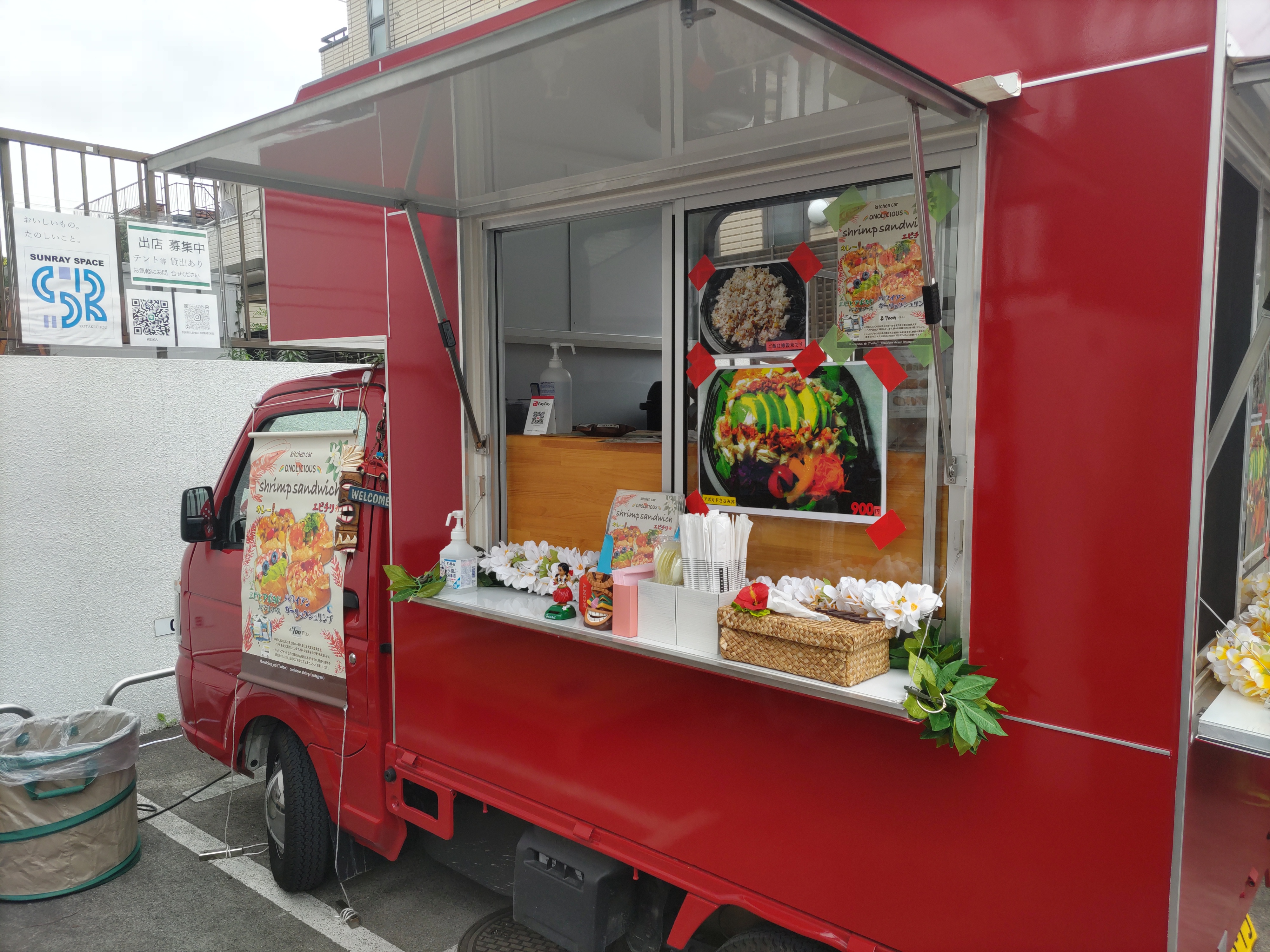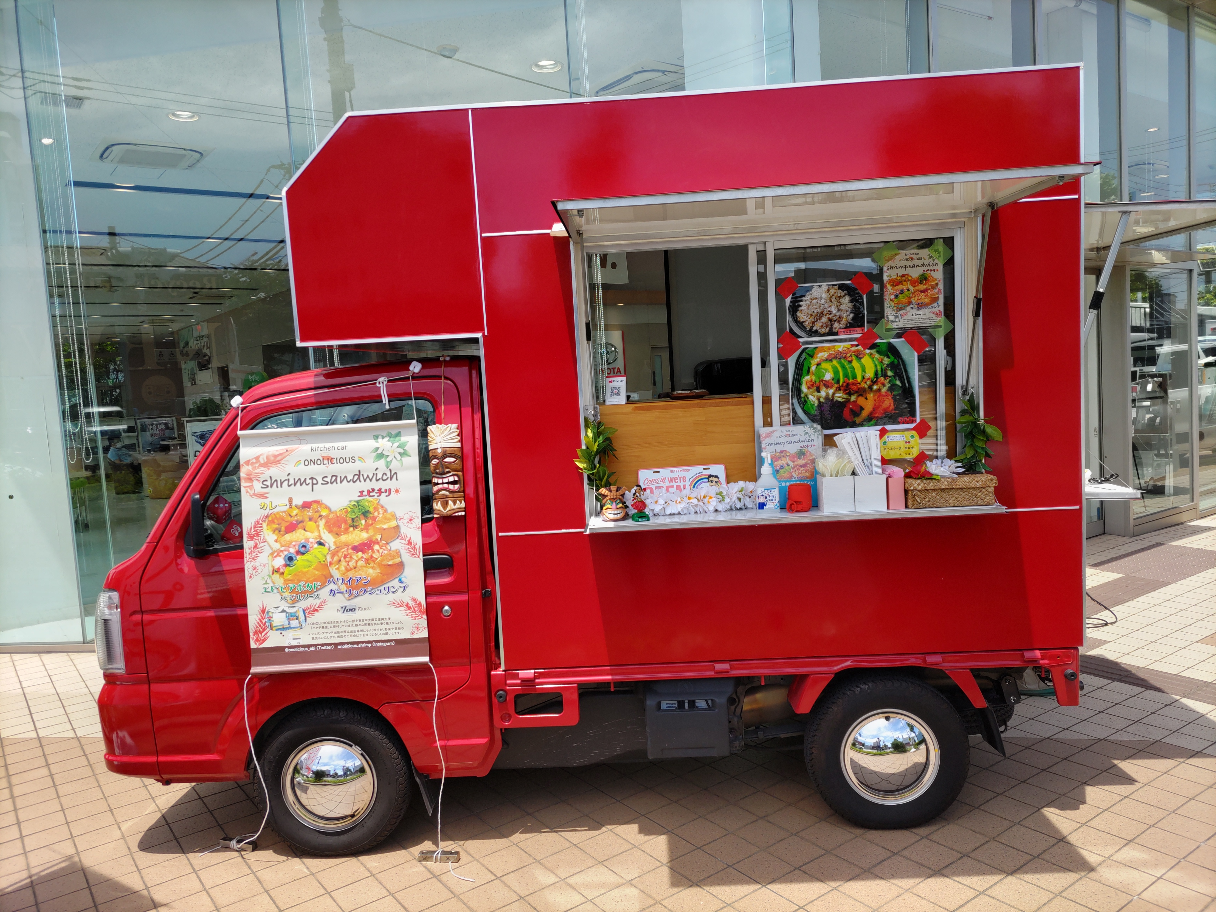 遠くからでも目立つ赤色キッチンカーで人目を引きます。