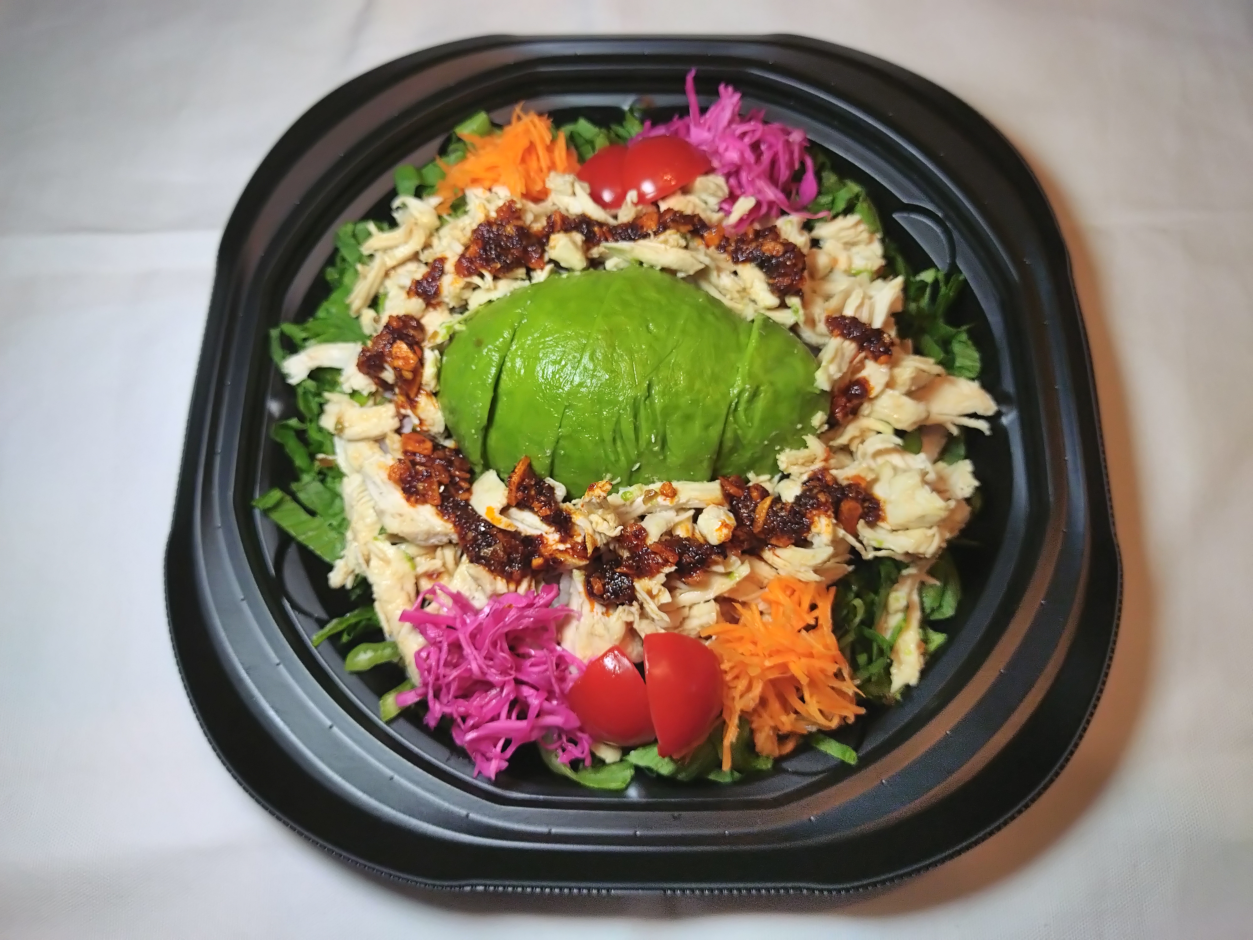 大きなアボカドとささみをさっぱり醤油ソースと食べるラー油でクセになる味に仕上げました。