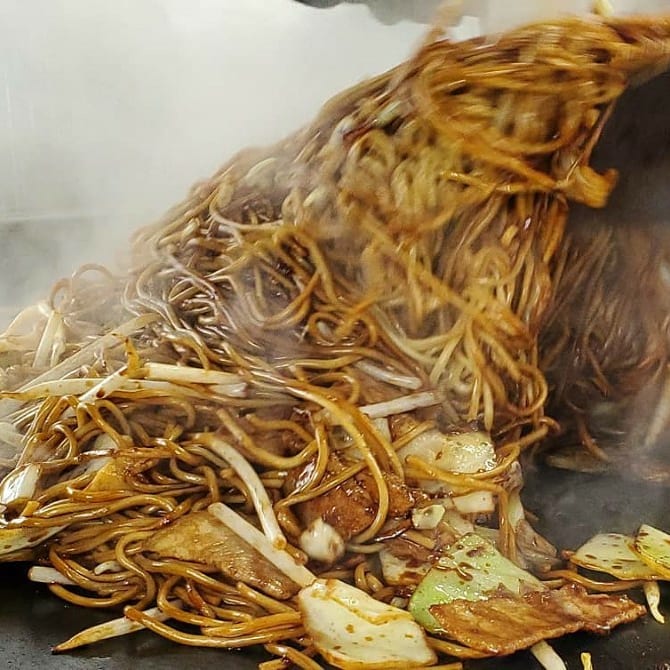 こだわりの熟成焼そば麺を作り手が麺に焼き目を付ける等のこだわりと愛情込めて焼き上げます。