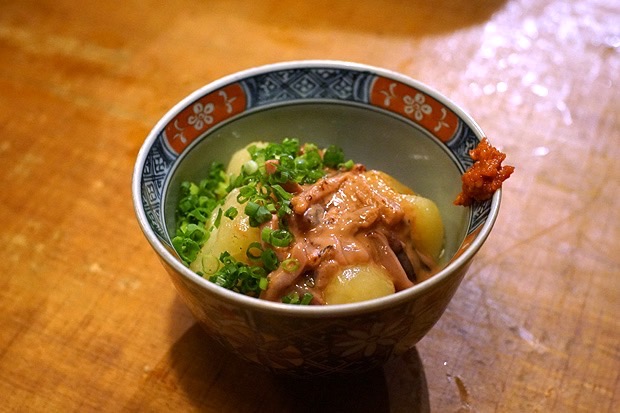 北海道産のホクホク甘いキタアカリに烏賊塩辛を乗せて炙った逸品。九州産の柚子胡椒と一緒に味わうと最高!