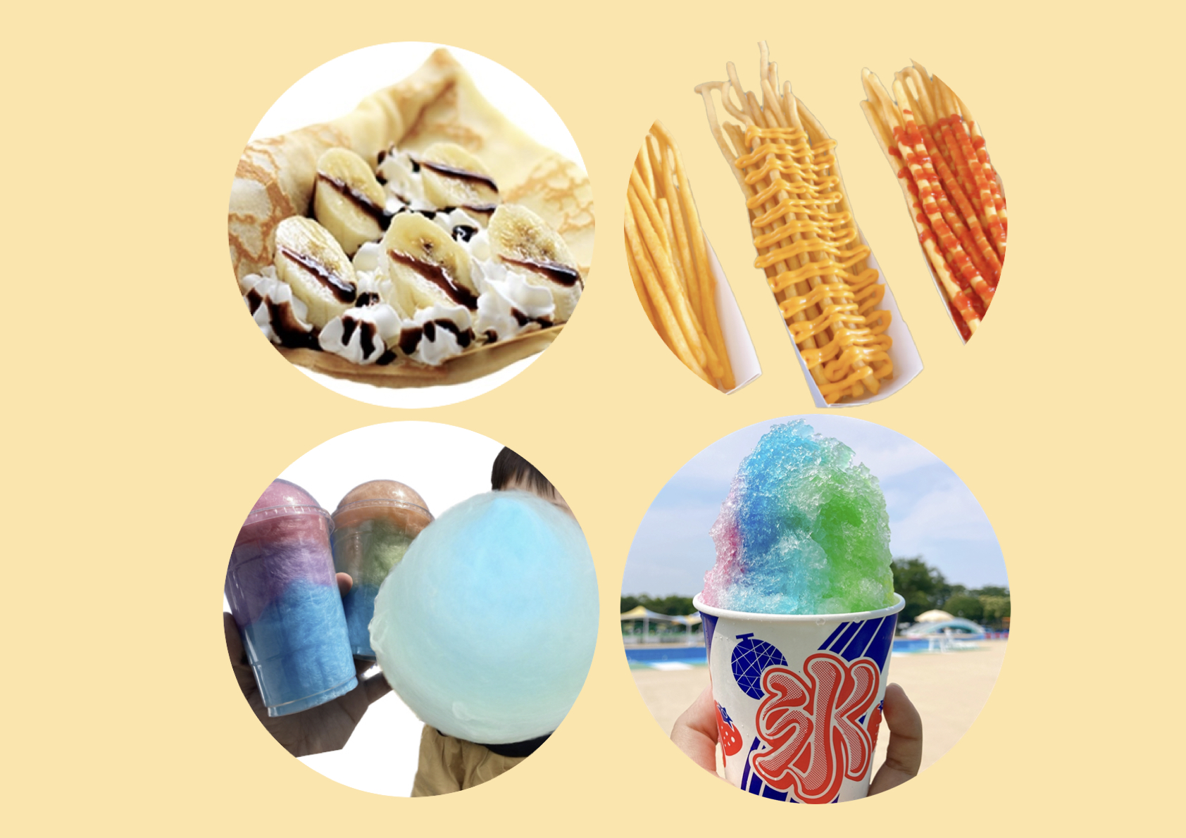 クレープ/ロングポテト/フルーツわたあめ/かき氷/他