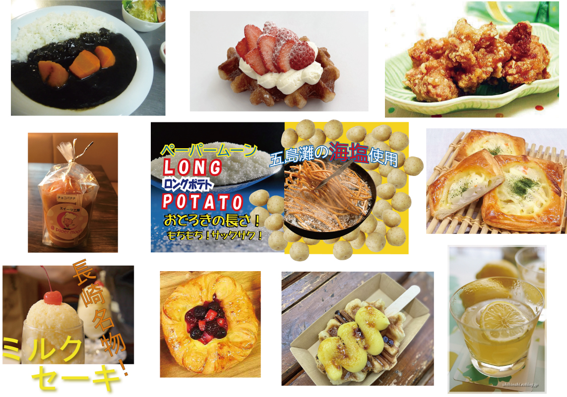 ロングポテト、から揚げ、カレー、ミニチュロス、コッペパン、ドリンク、スイーツ系