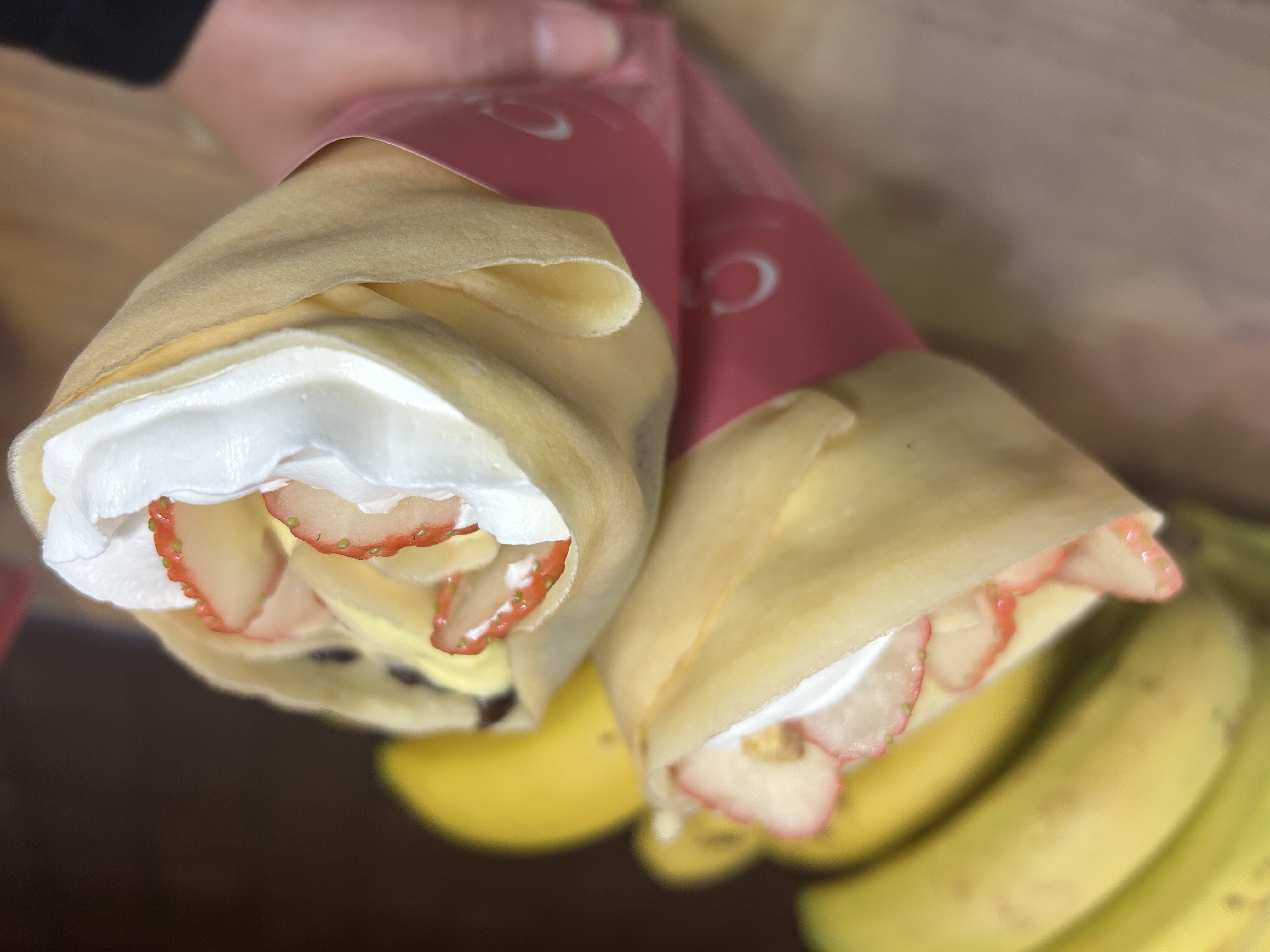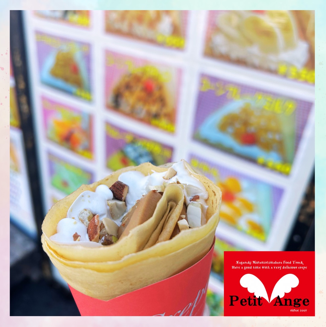 プティアンジュのクレープは、オリジナル生地でモチモチの食感が楽しめます!トッピングは定番のバナナチョコクレープをはじめ、地元南島原市産のいちごを使った季節限定クレープも人気です。