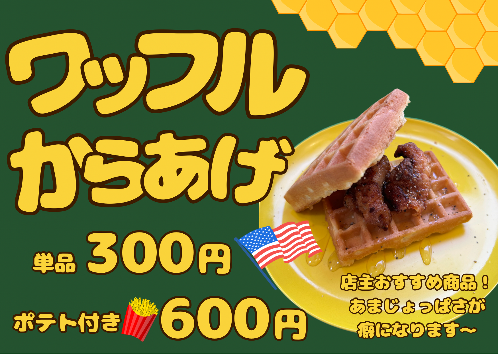 味噌で下味のついたからあげを甘いワッフルでサンドしました!