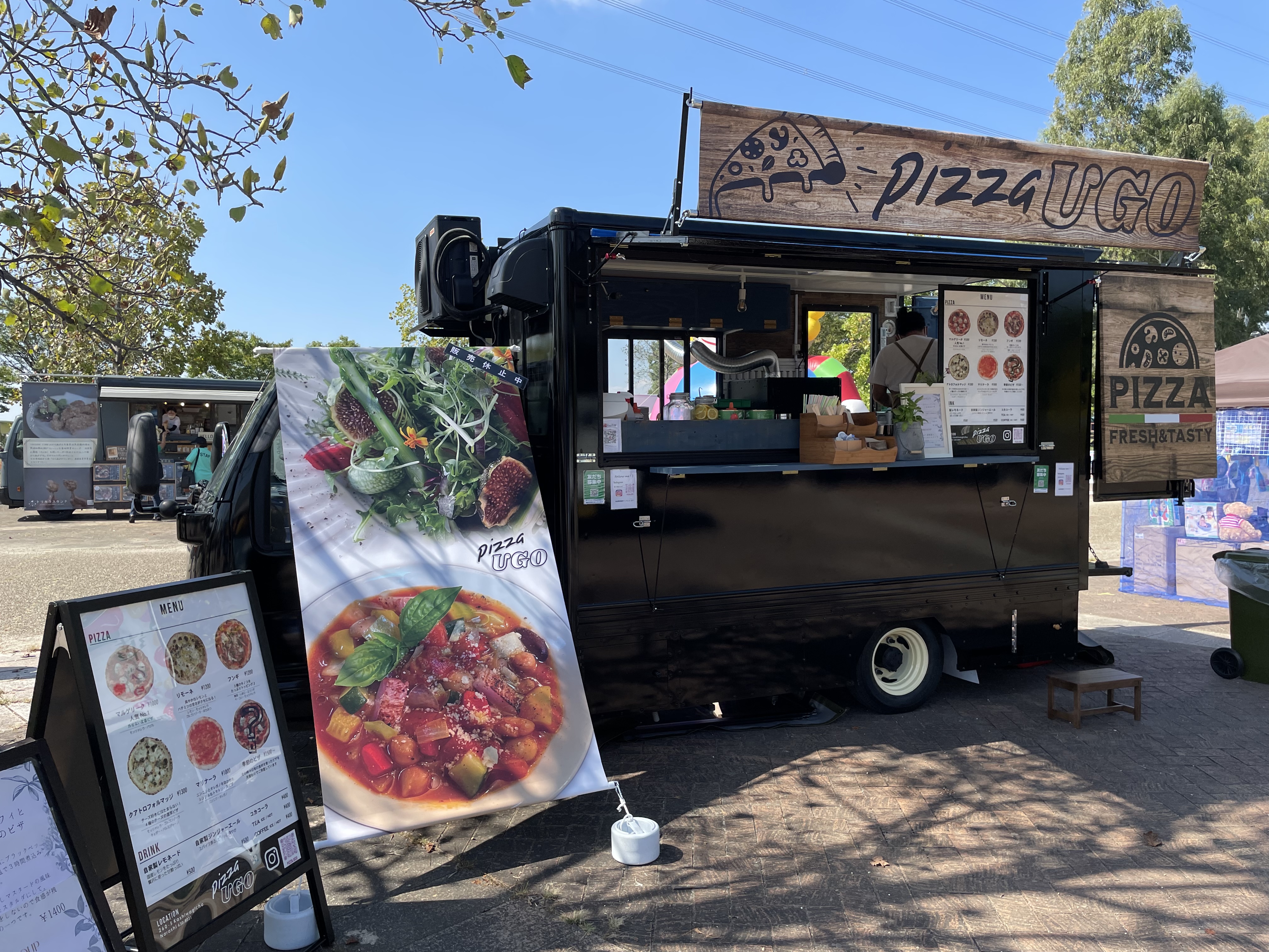 pizza UGOのキッチンカーはシンプルな黒の車。色々な看板アイテムを所持しておりますので、その場所場所にあった雰囲気にぴったりな雰囲気に合わせられます。