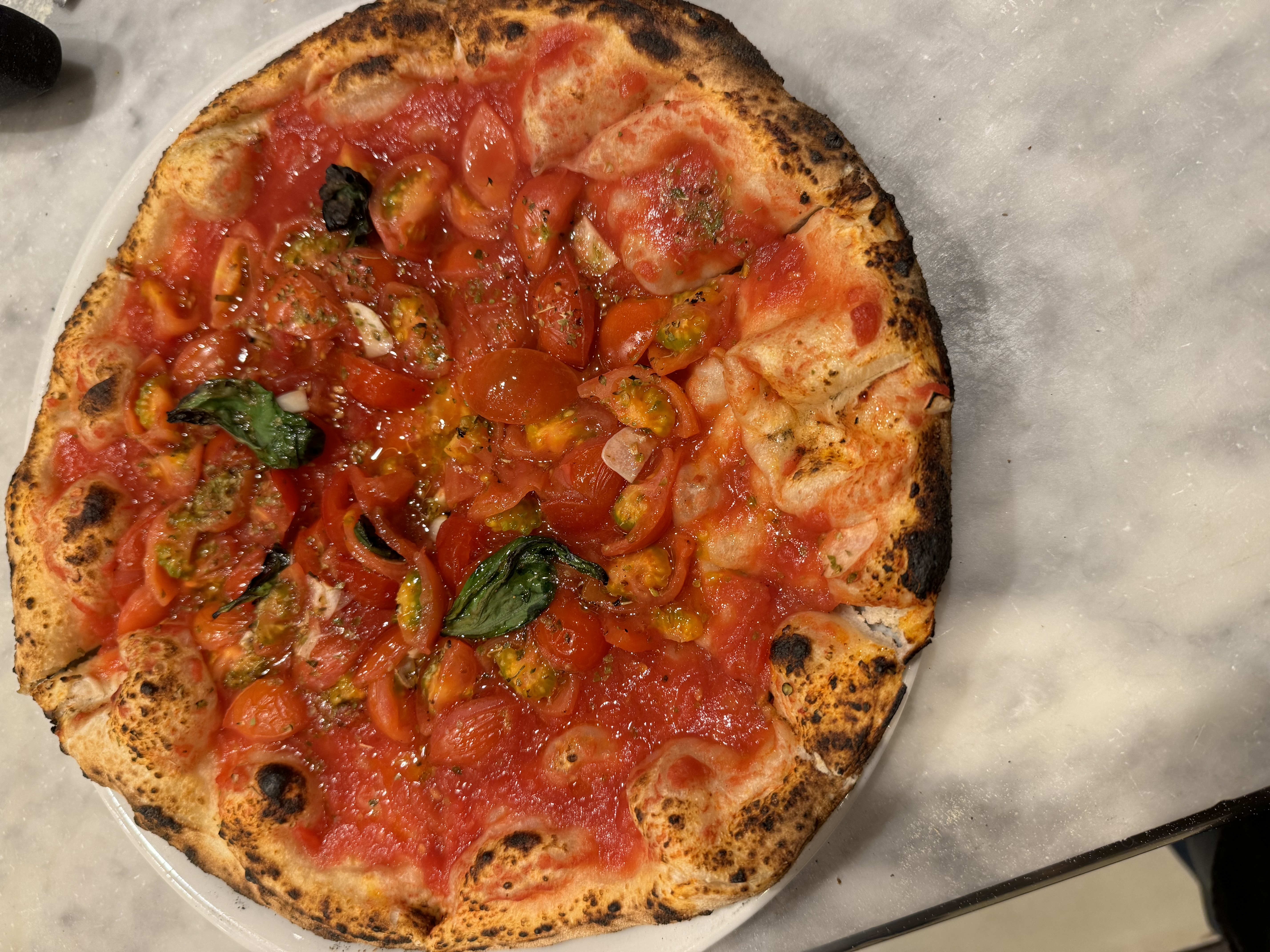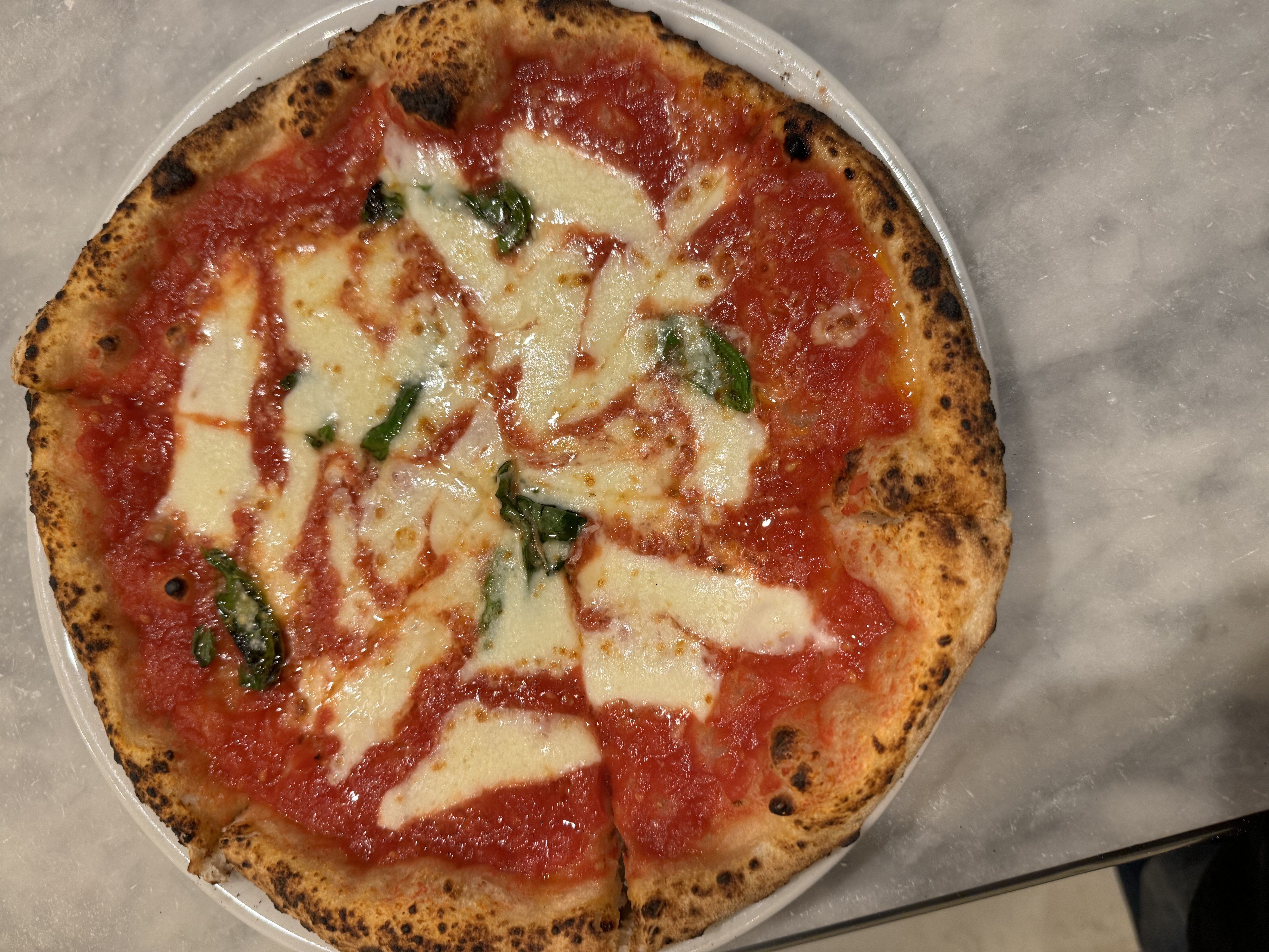 トマトソース、モッツァレラチーズ、バジル、グラナパダーノ。