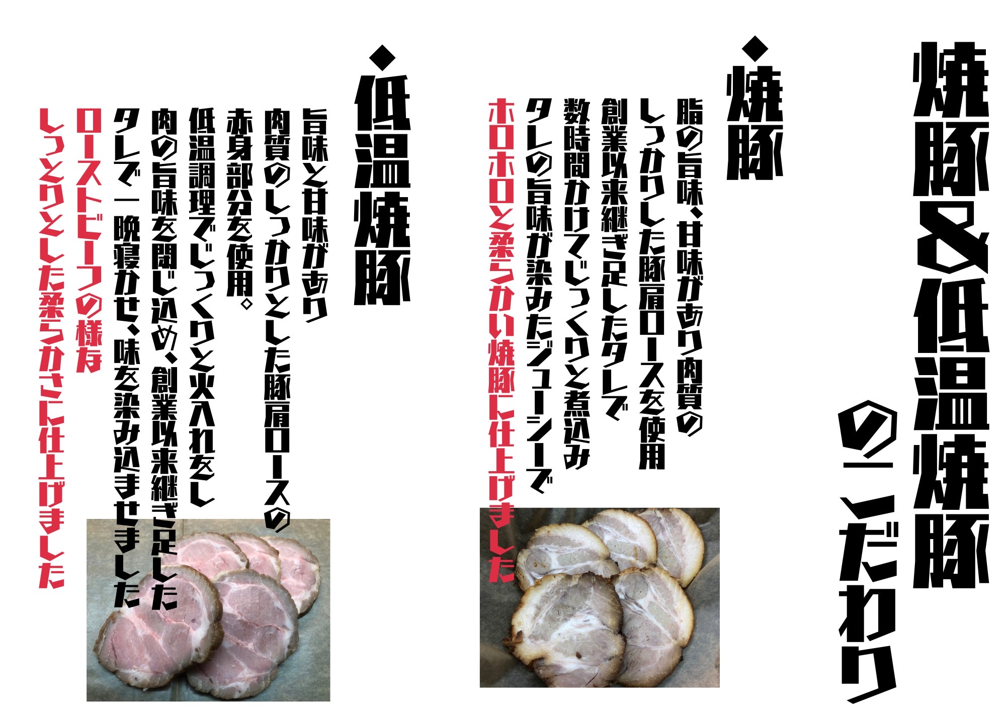 じっくり煮込んだホロホロと柔らかい焼豚と低温調理でじっくりと火入れしたローストビーフのようなしっとりとした柔らかい低温焼豚。