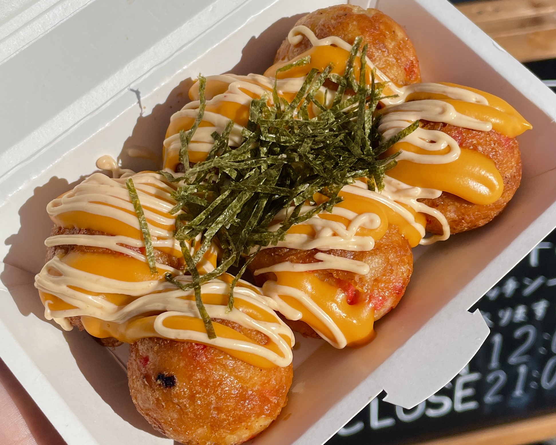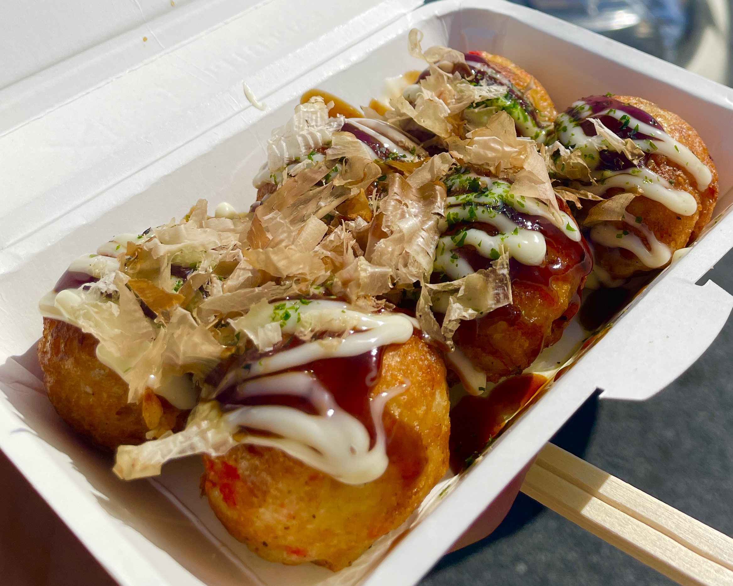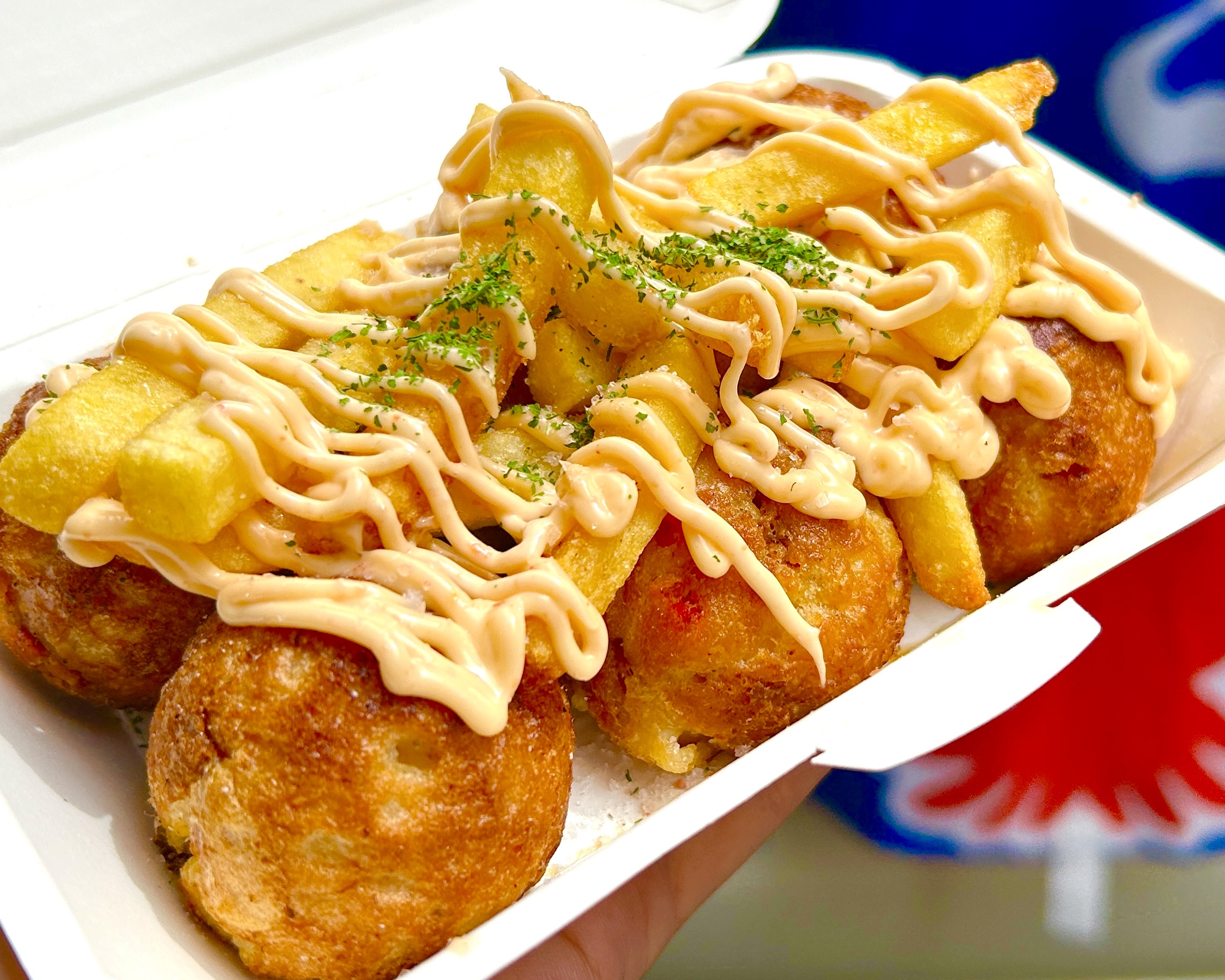 たこ焼きとフライドポテトが1パックになった満足感たっぷりの1品!