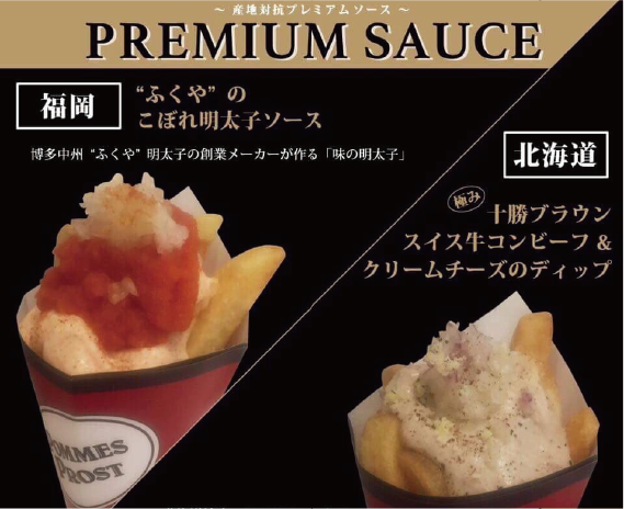 POMMES PROST の美味しさの決め手は何と言ってもオリジナルソース! イタリアン、フレンチの名店で修行を重ねたシェフが、季節に合わせたこだ わりのオリジナルソースを常に 10 種類以上用意しています。 プレミアムソースの『” ふくや” のこぼれ明太子ソース』『十勝ブラウンスイ ス牛コンビーフ & クリームチーズのディップ』は特にオススメです! 長い名前負けしない本当の美味しさを、ぜひご賞味あれ ( 笑 )