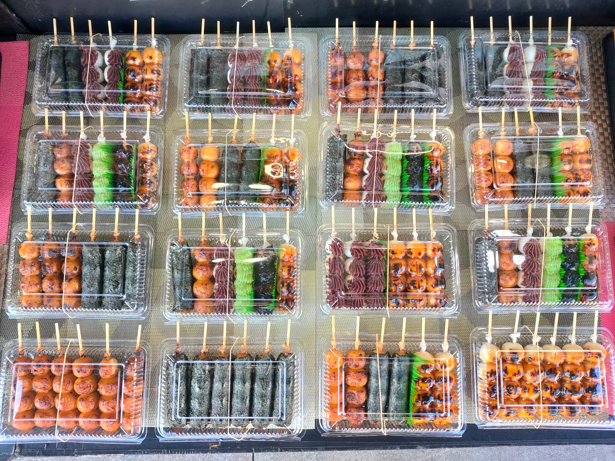 焼きたてだんご、草もち、芋ようかん、芋クリーム、わらび餅、草加せんべい、おしるこ、くまボトルジュース