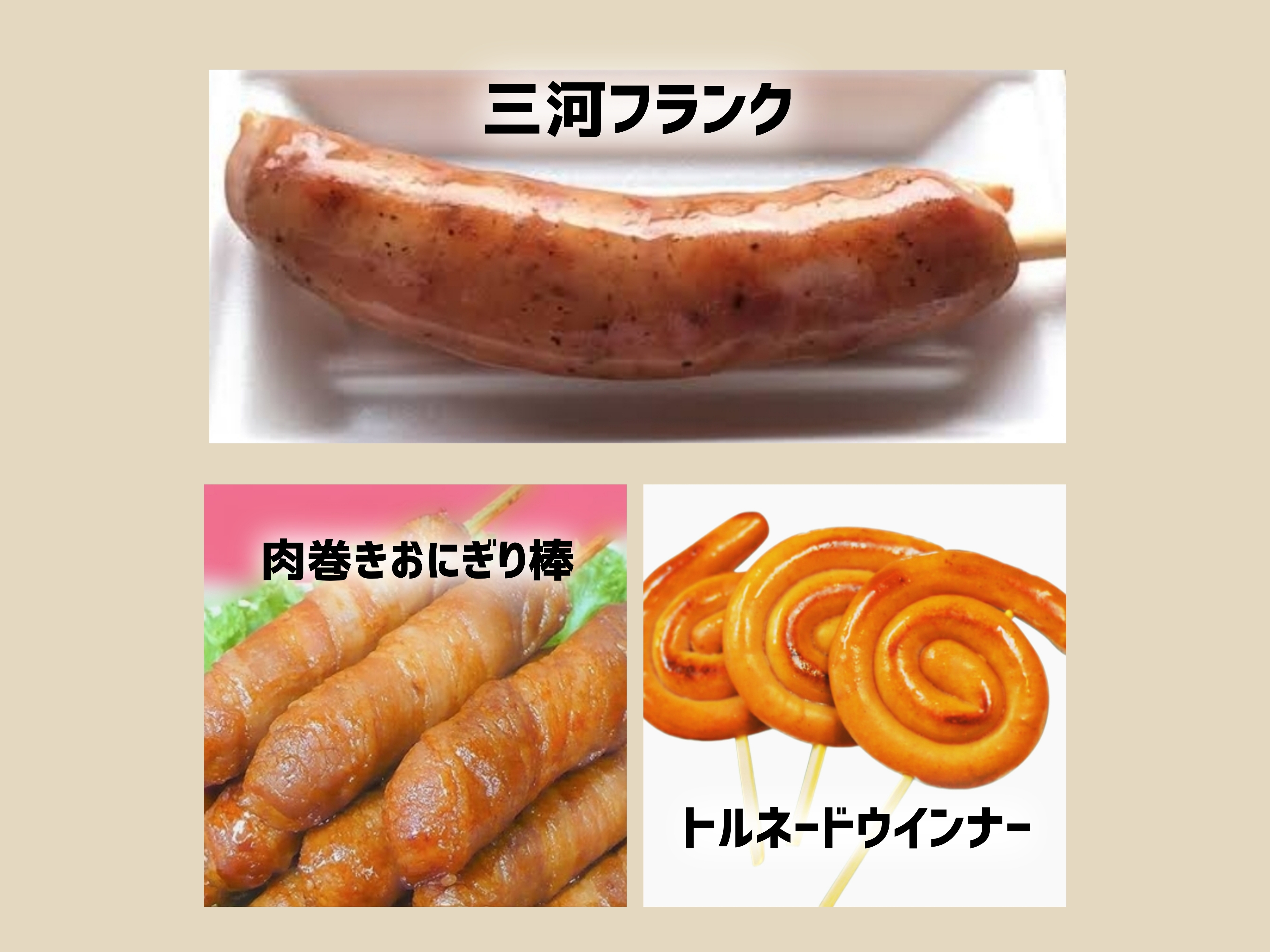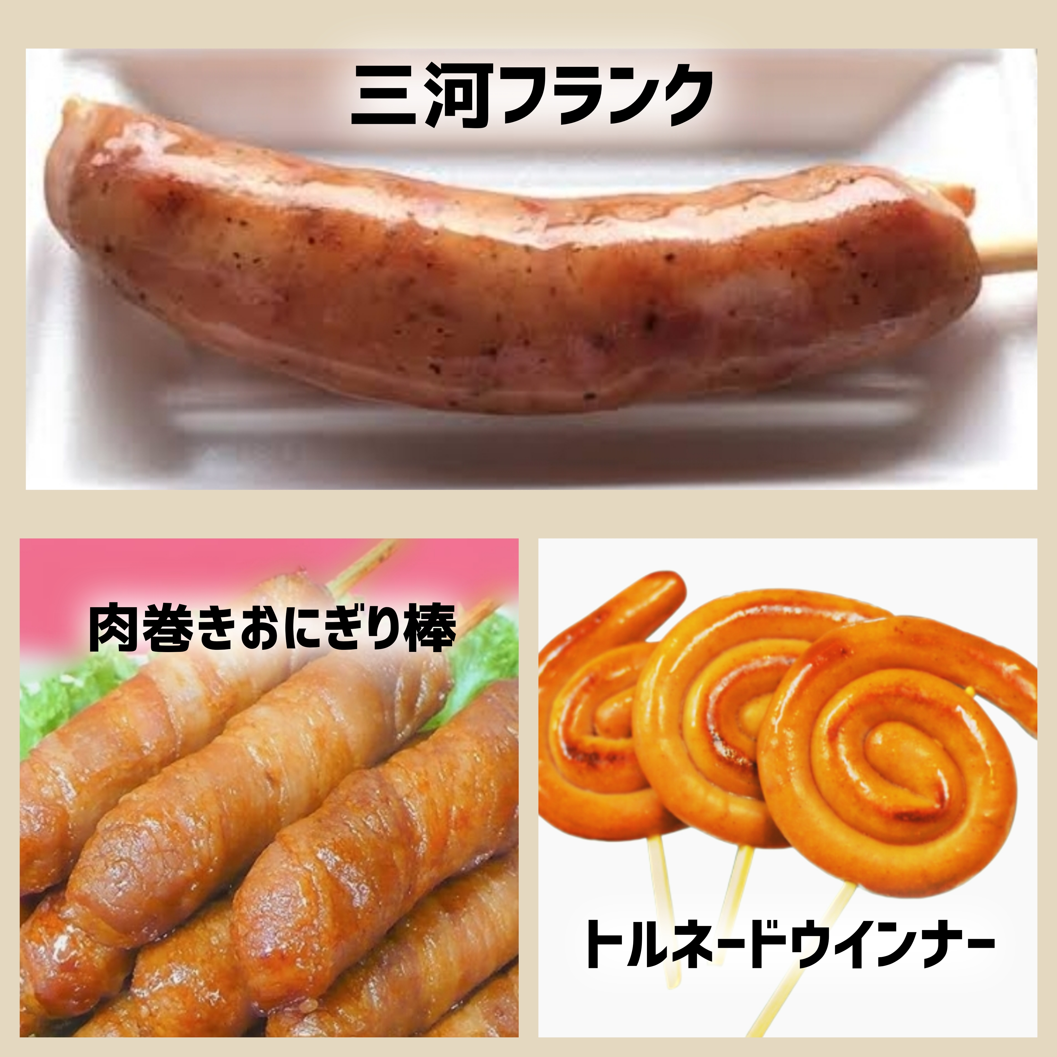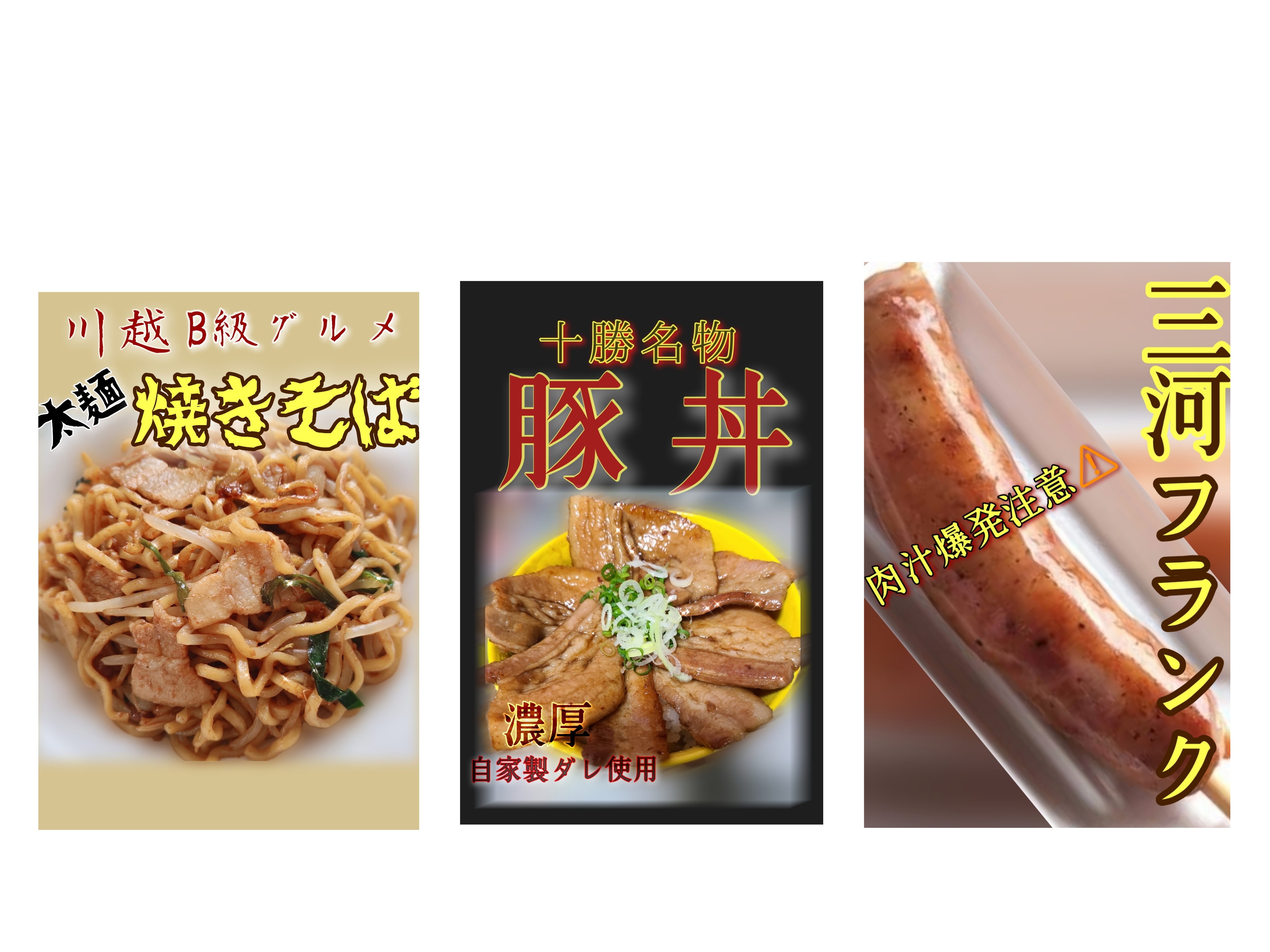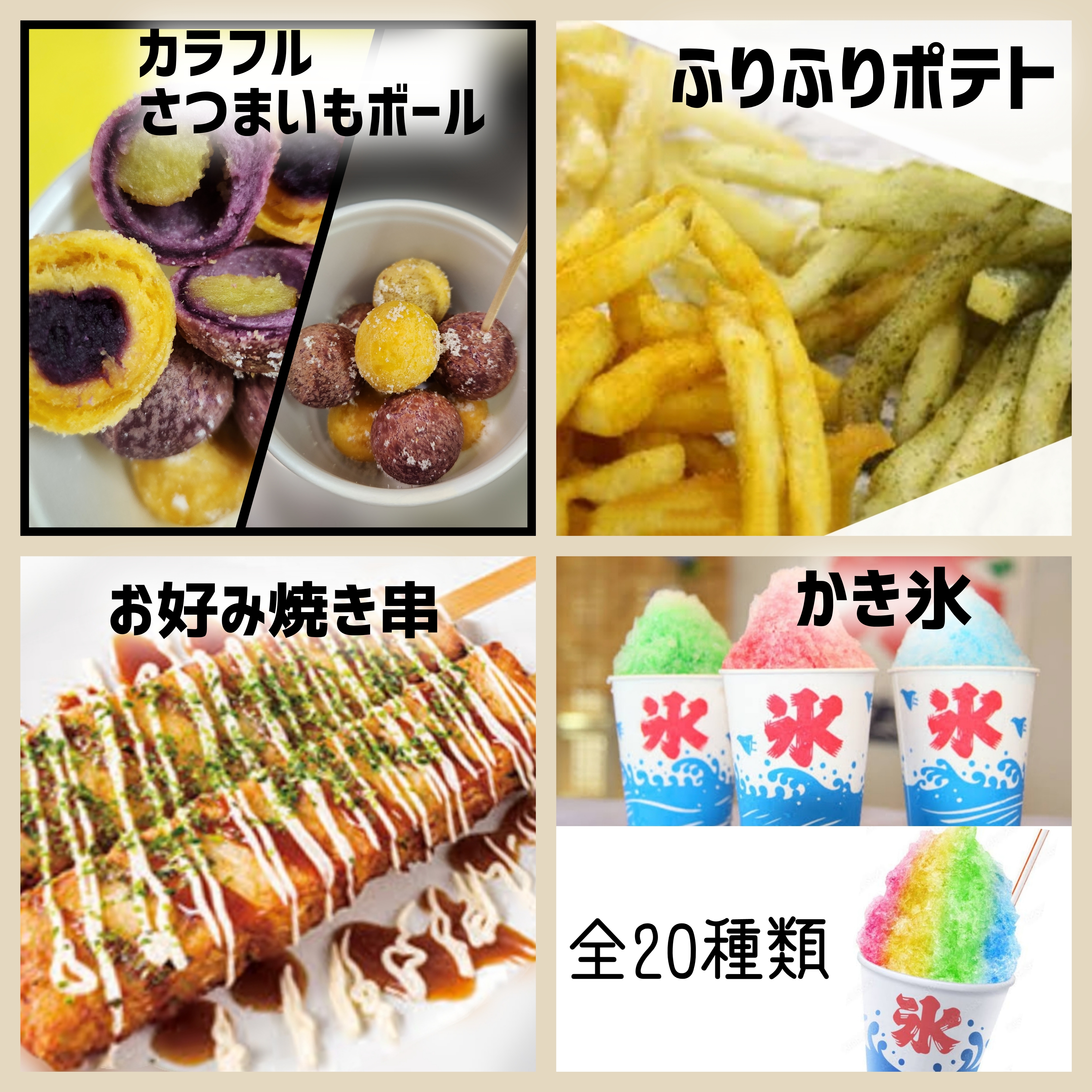 ●十勝豚丼 ●川越太麺焼きそば ●十勝豚焼きそば ●三河フランク ●宮崎肉巻きおにぎり棒 ●ふりふりポテト ●お好み焼き串 ●カラフルさつまいもボール ●トルネードウインナー ●ジャンボチキンステーキ串 ●かき氷