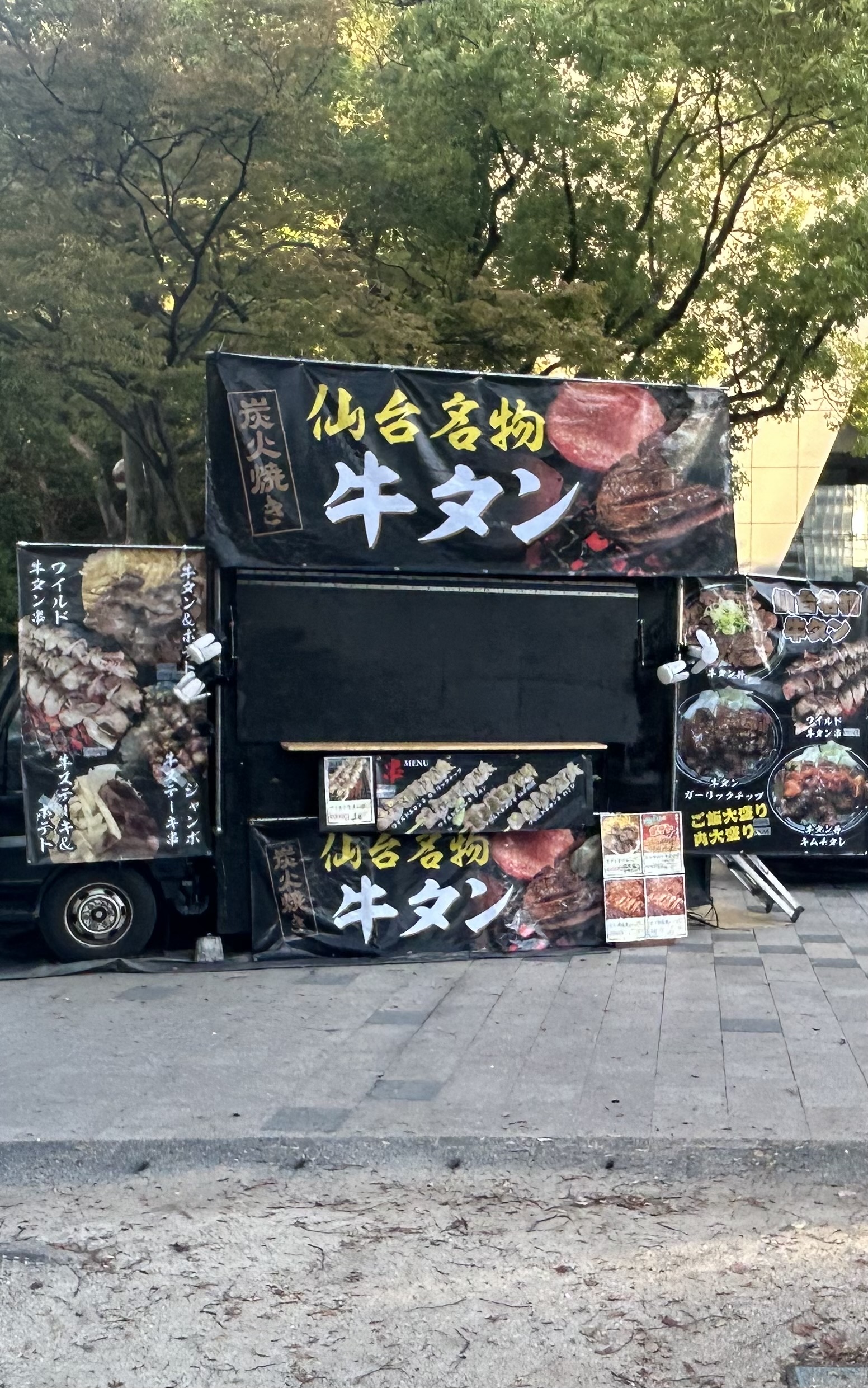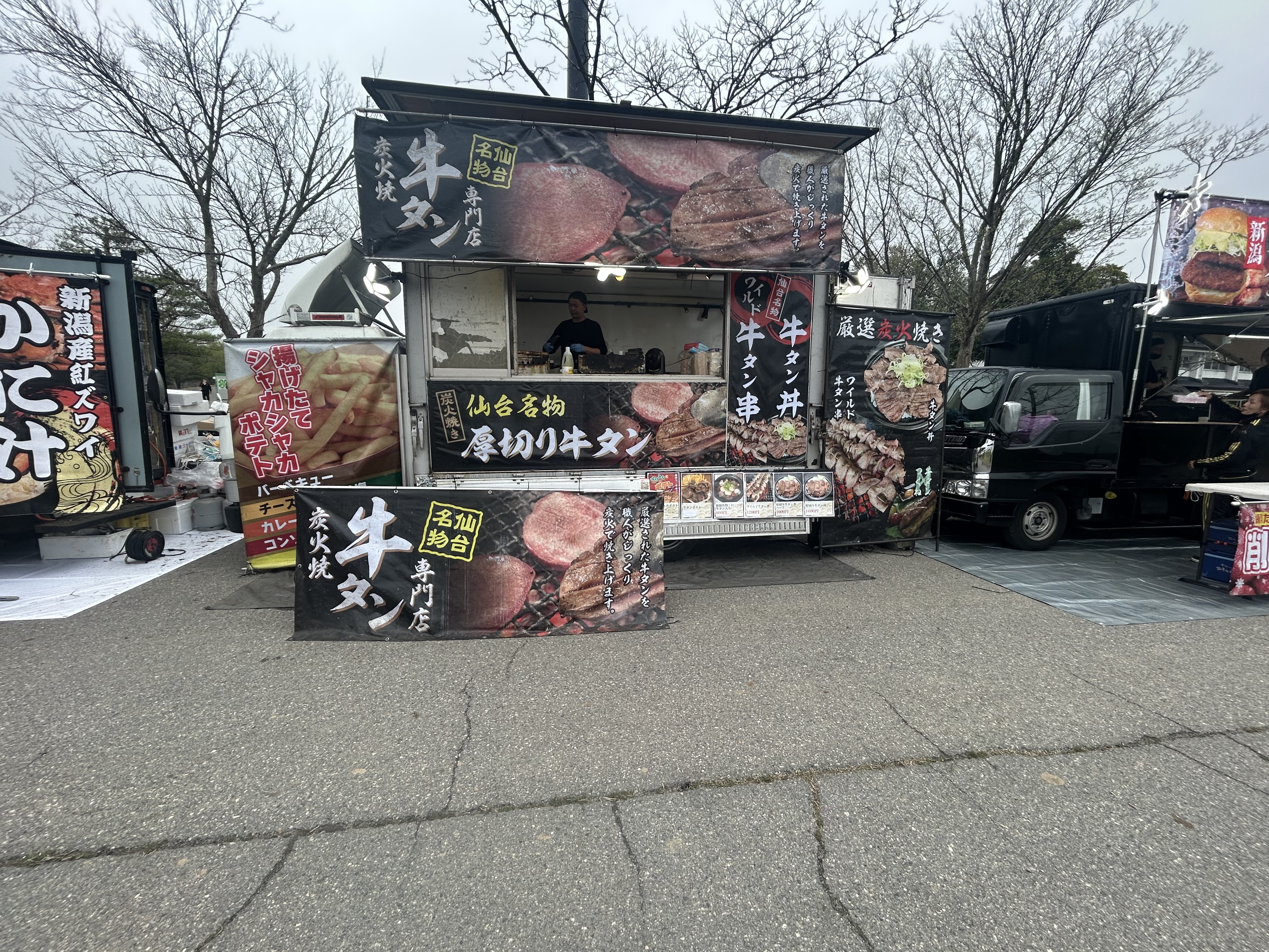 牛タン丼、牛タン串、ステーキ丼、ステーキ串、ポテト、焼きそば、蕎麦、かき氷、アルコール各種、ソフトドリンク