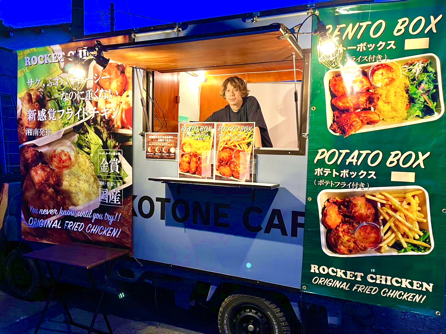 オーナーは元バンドマン、当初はKOTONE CAFEという屋号でクレープ屋さんのキッチンカーを初めましたが、すぐにロケットチキンの千葉エリアフランチャイズとして方向転換しました!