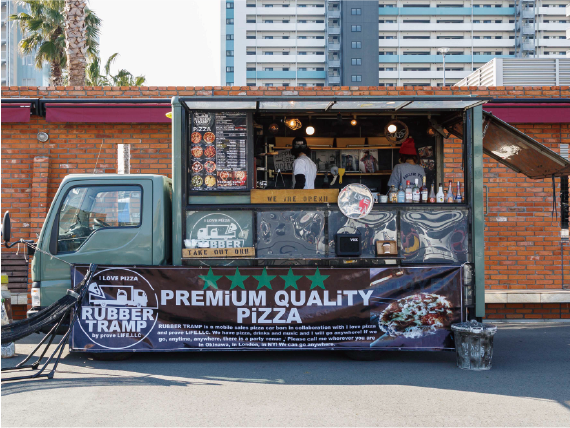 2014年に本格石窯ピザ屋 RUBBER TRAMPとして開業。車両にタイタンダッシュを使用し、販売面を大きく開放&透明にした仕様は当時RUBBER TRAMPが国内初めてでした。また2017年、2台のキッチンカーを連結させた事も多くの話題を集めました。2025年現在では、千葉市に固定店舗を2店舗、キッチンカーを3店舗運営しています。味もデザインも拘り、且つ販売する時のBGMも大切に、サービス業の全てを楽しみながら提供しています♪