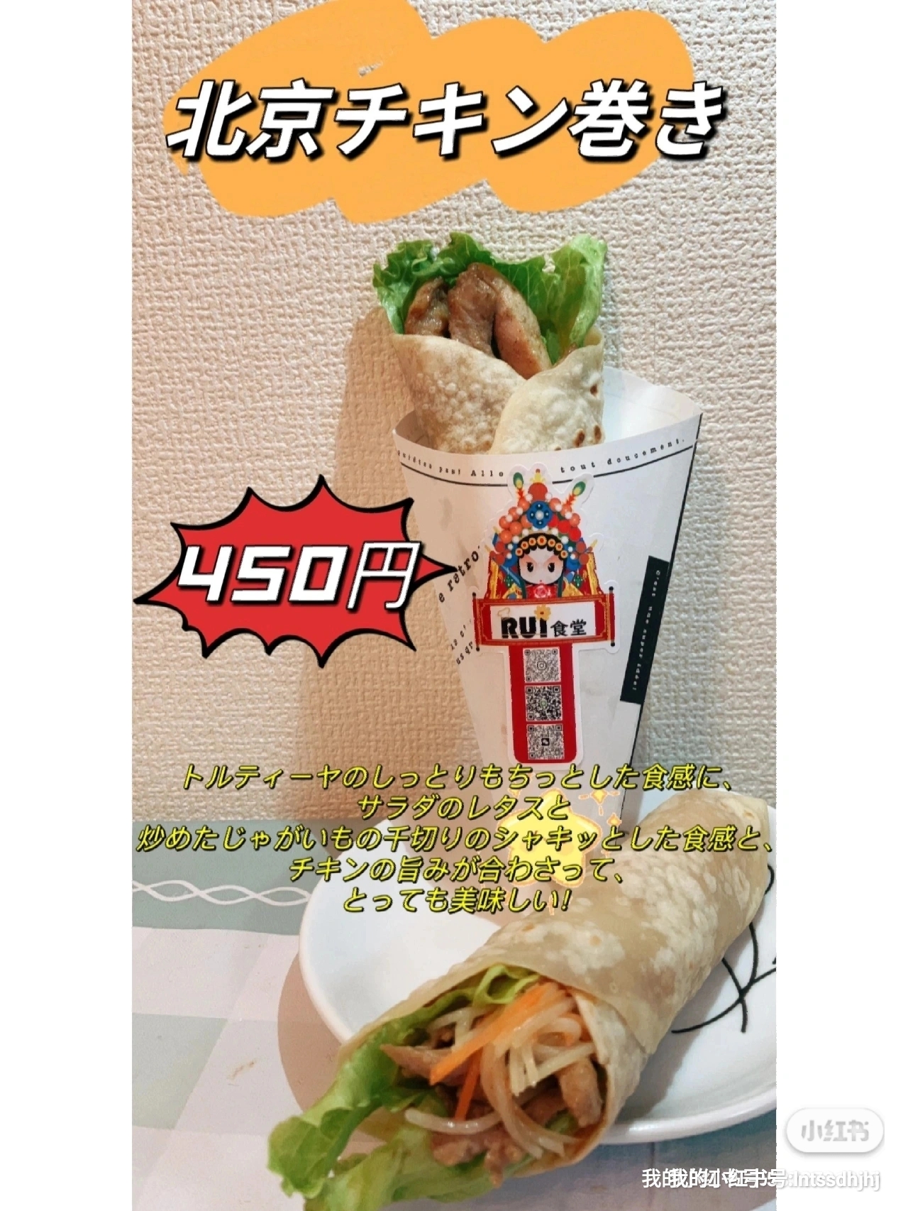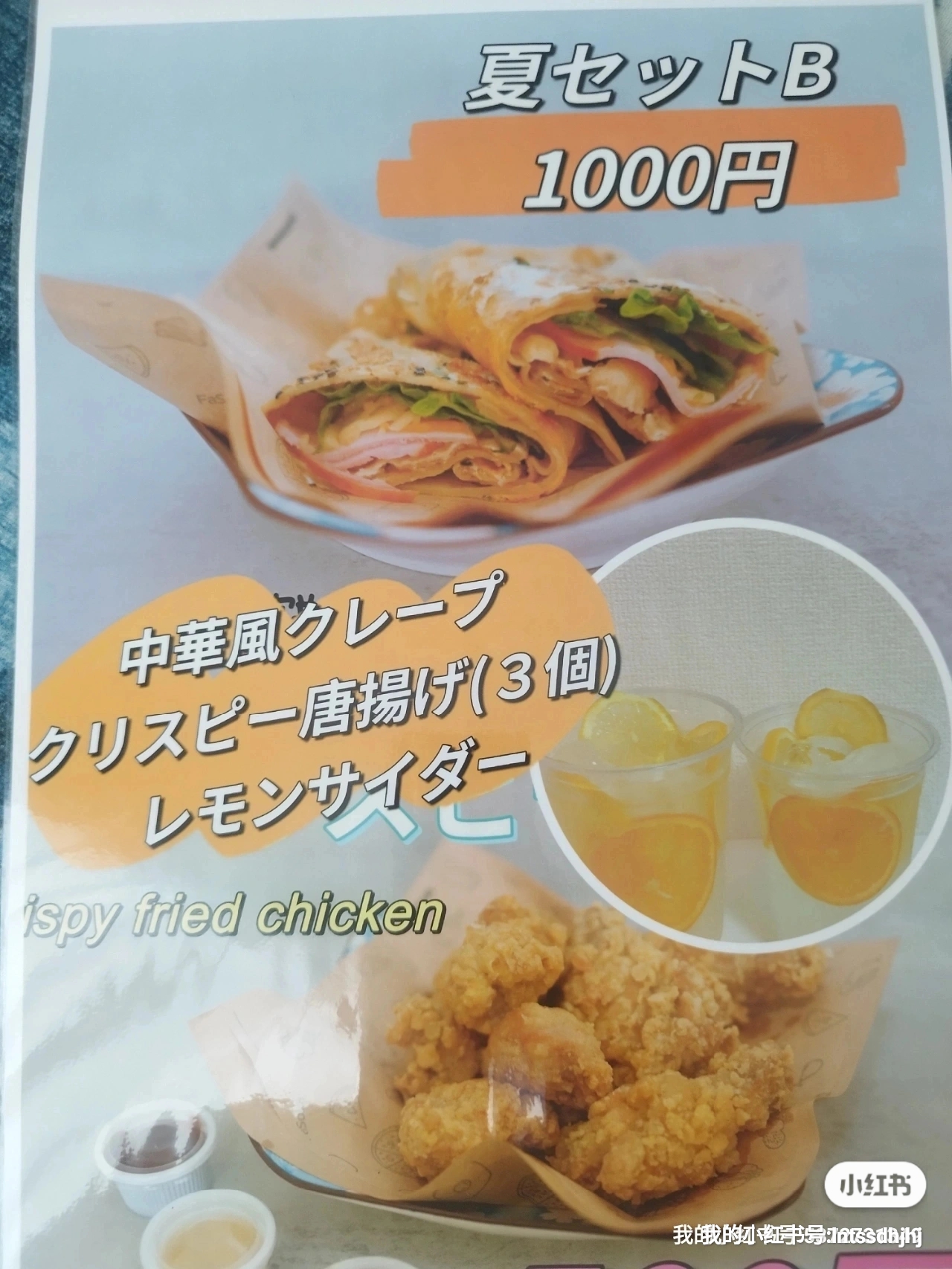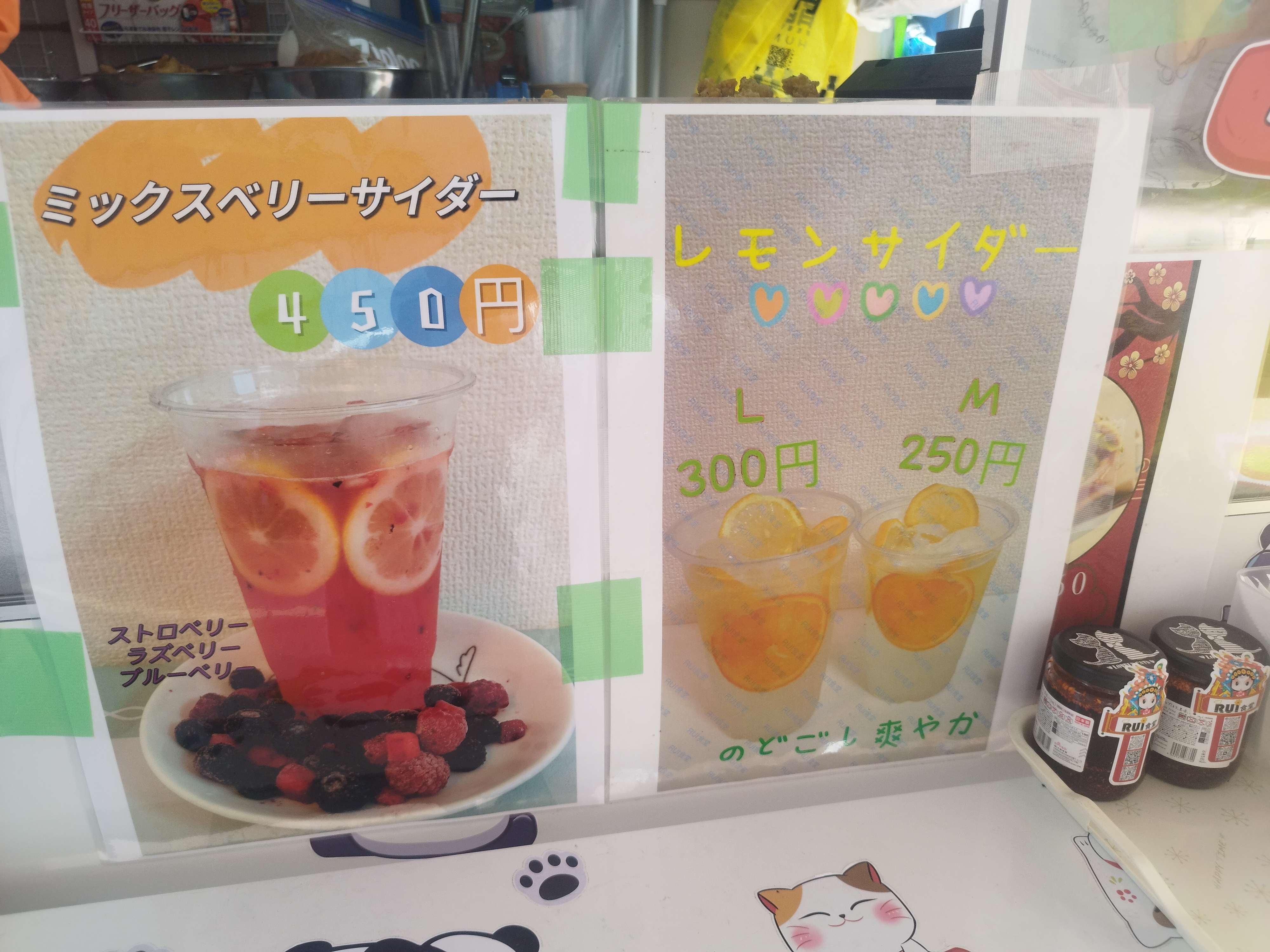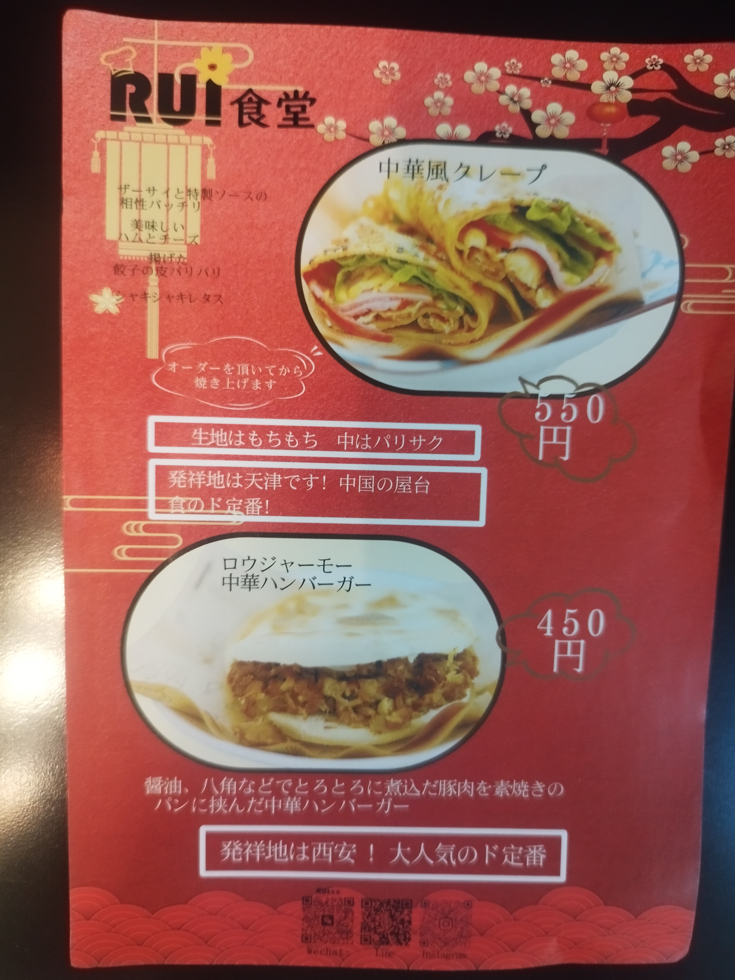 中華風クレープ、中華風ハンバガー、中華風肉まん、中華風冷麺、中華風唐揚げ、ドリンクなど