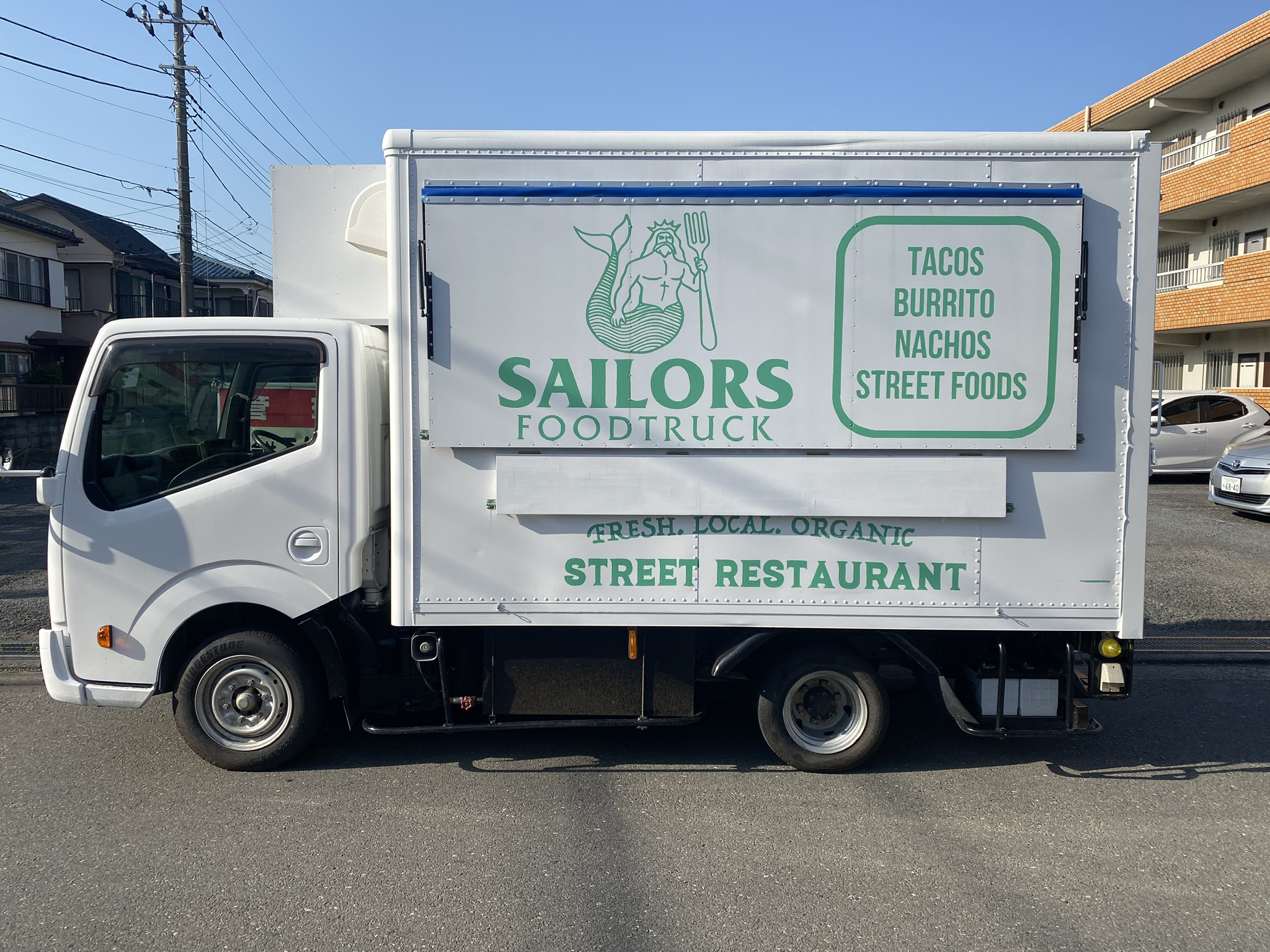 SAILORS FOODTRUCKのキッチンカーは白を基調とし、ペイントも主張しすぎず、どんな場所でも雰囲気を壊さずに出店できます!
