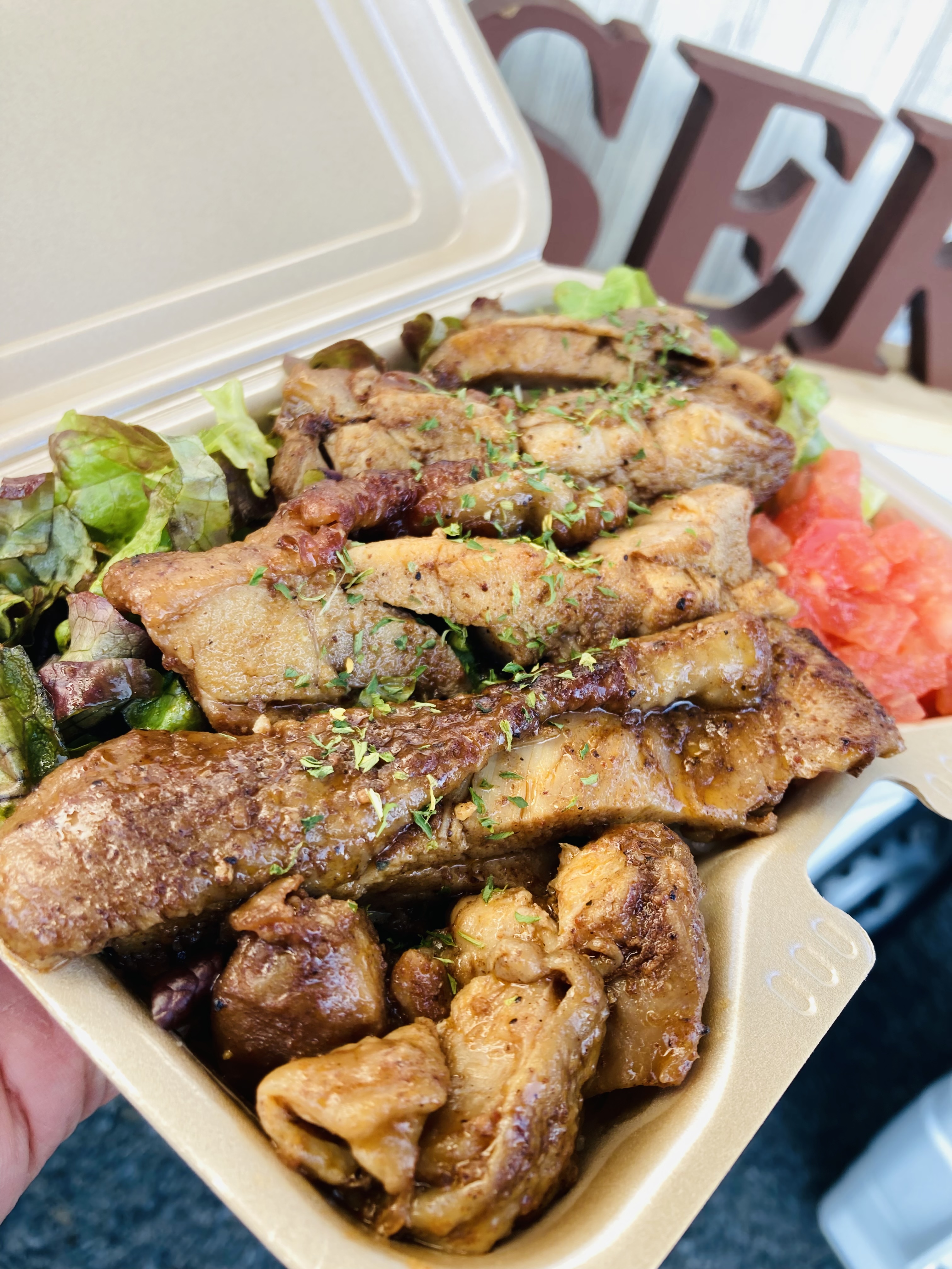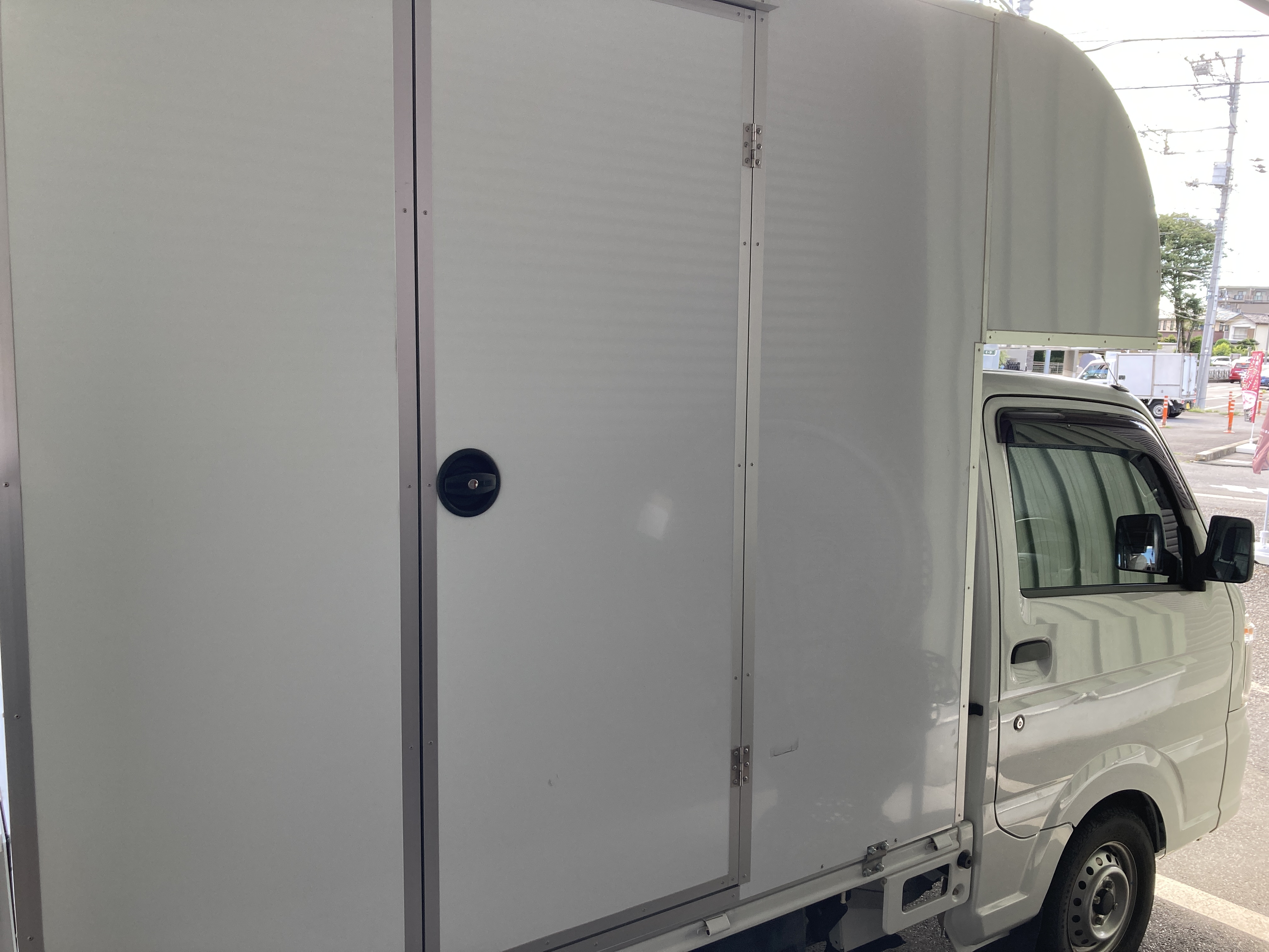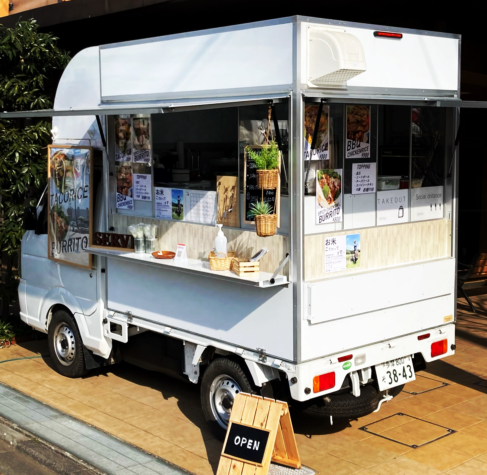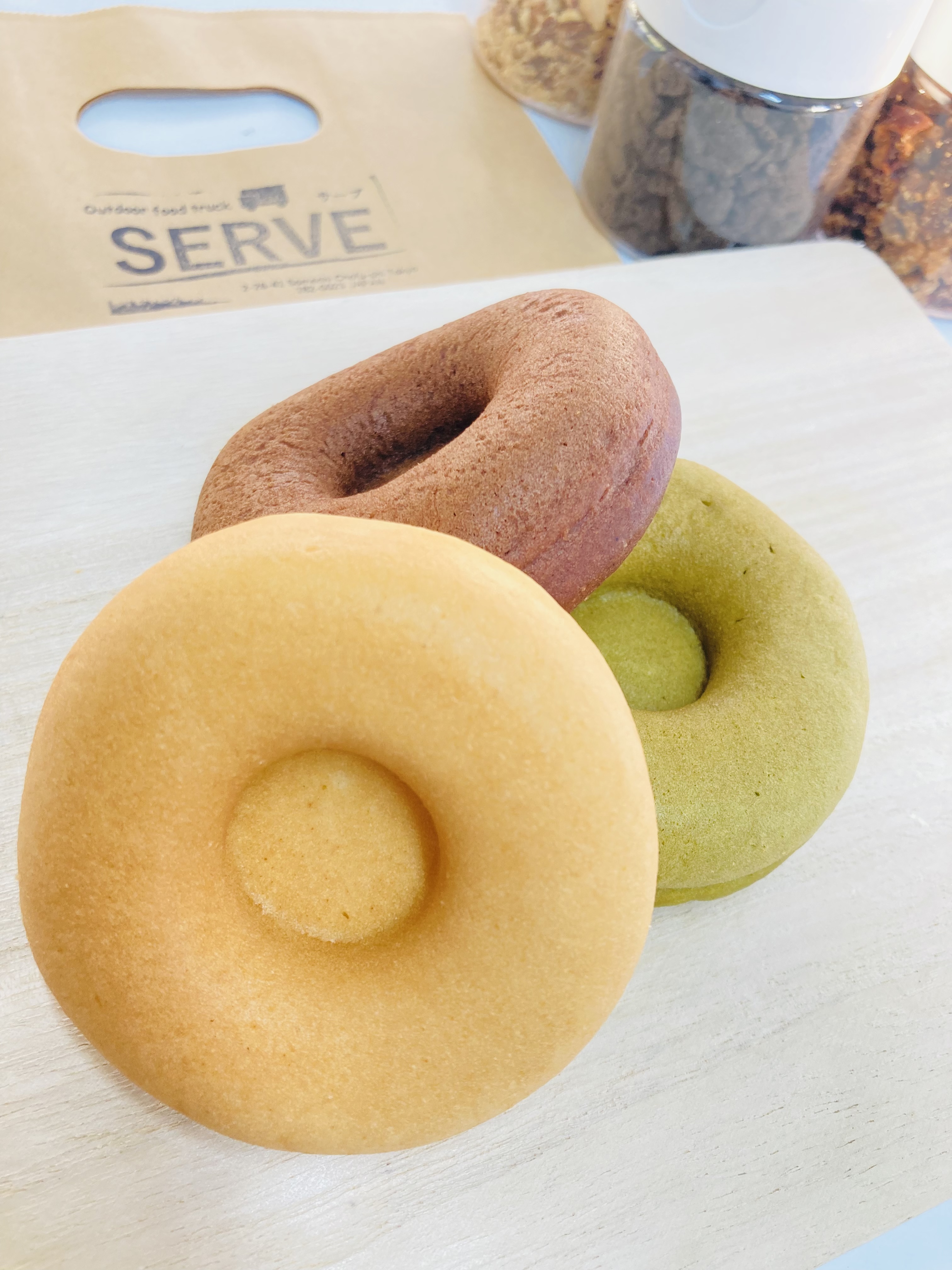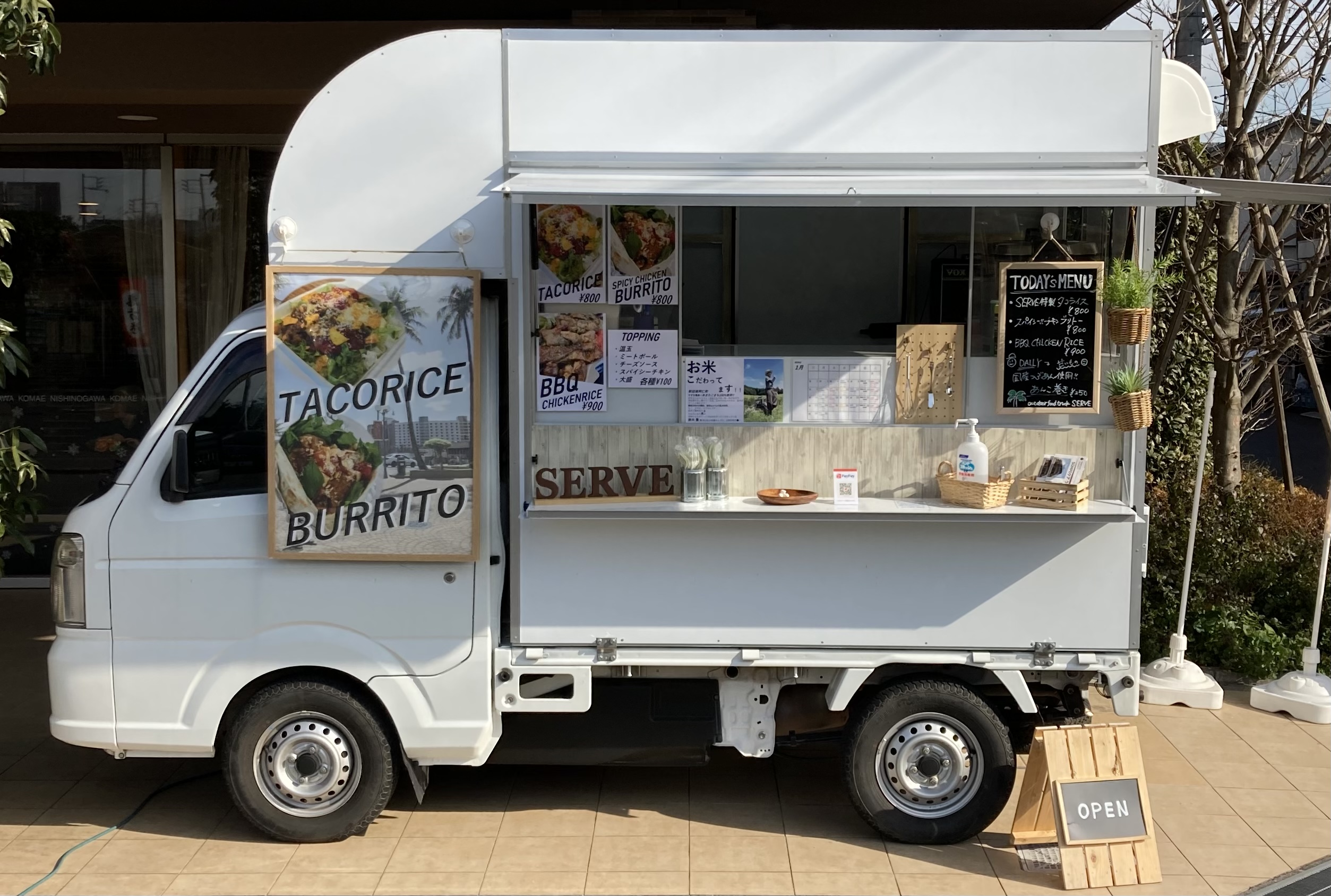 SERVEのキッチンカーはとてもシンプルな作りの軽トラック型なのでどんな場所でもうスッキリとハマります!商材はランチメニューがメインですか、スウィーツも販売しております!スウィーツの米粉の焼きドーナツはグルテンフリーで、主婦層、お子様にとても人気のある商品です!