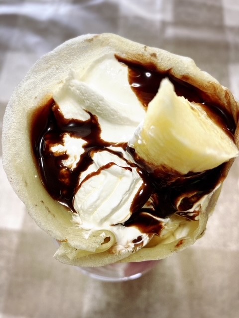 クレープの品評会で優勝したこともある美味しいモチモチ生地のクレープです。お客さんの目の前で焼いて提供します。匠の技を堪能してください。