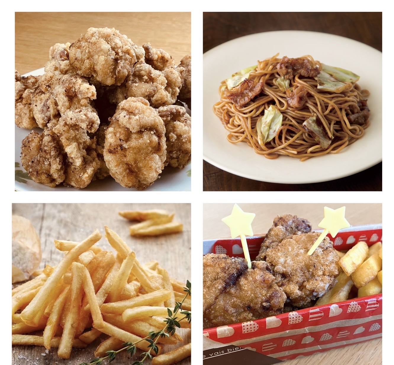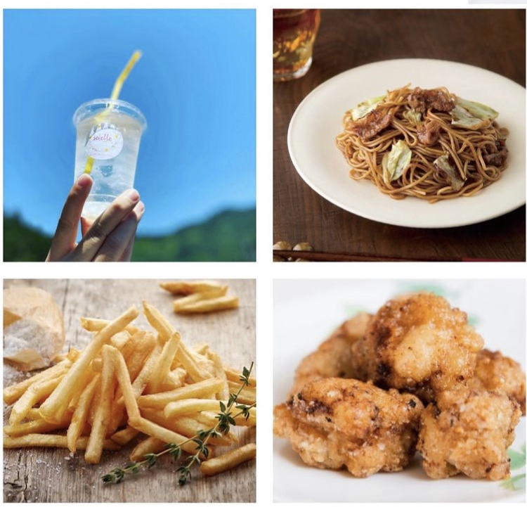 小麦粉卵不使用拘り唐揚げ、オーガニックフライドポテト、牛乳・卵不使用のオーガニック豆乳アイスクリーム、さっぱり油淋鶏丼、ストレートジュース、大磯屋製麵所の全粒粉ソース焼きそば