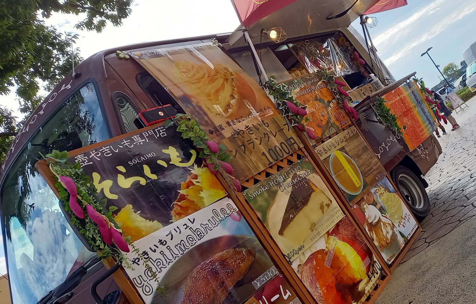当店のキッチンカーはやきいも屋さんらしく店主のデザインした「お芋ちゃん」を基調としてオシャレでハッピーになれるような外観になっています。それでいて茶色ベースの配色なので落ち着いたシーンでも心に安らぎを与えるようなデザインになっています。