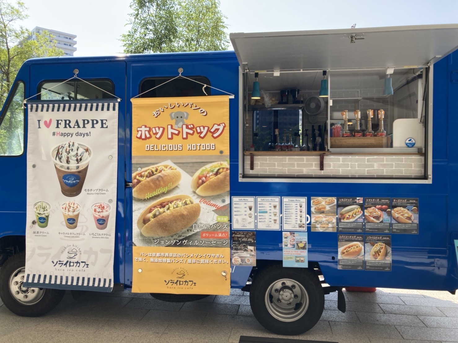 コーヒー、ホットドッグ、パニーニ、ポテト、チュロス、フラッペ、ドリンク、チキンオーバーライス
