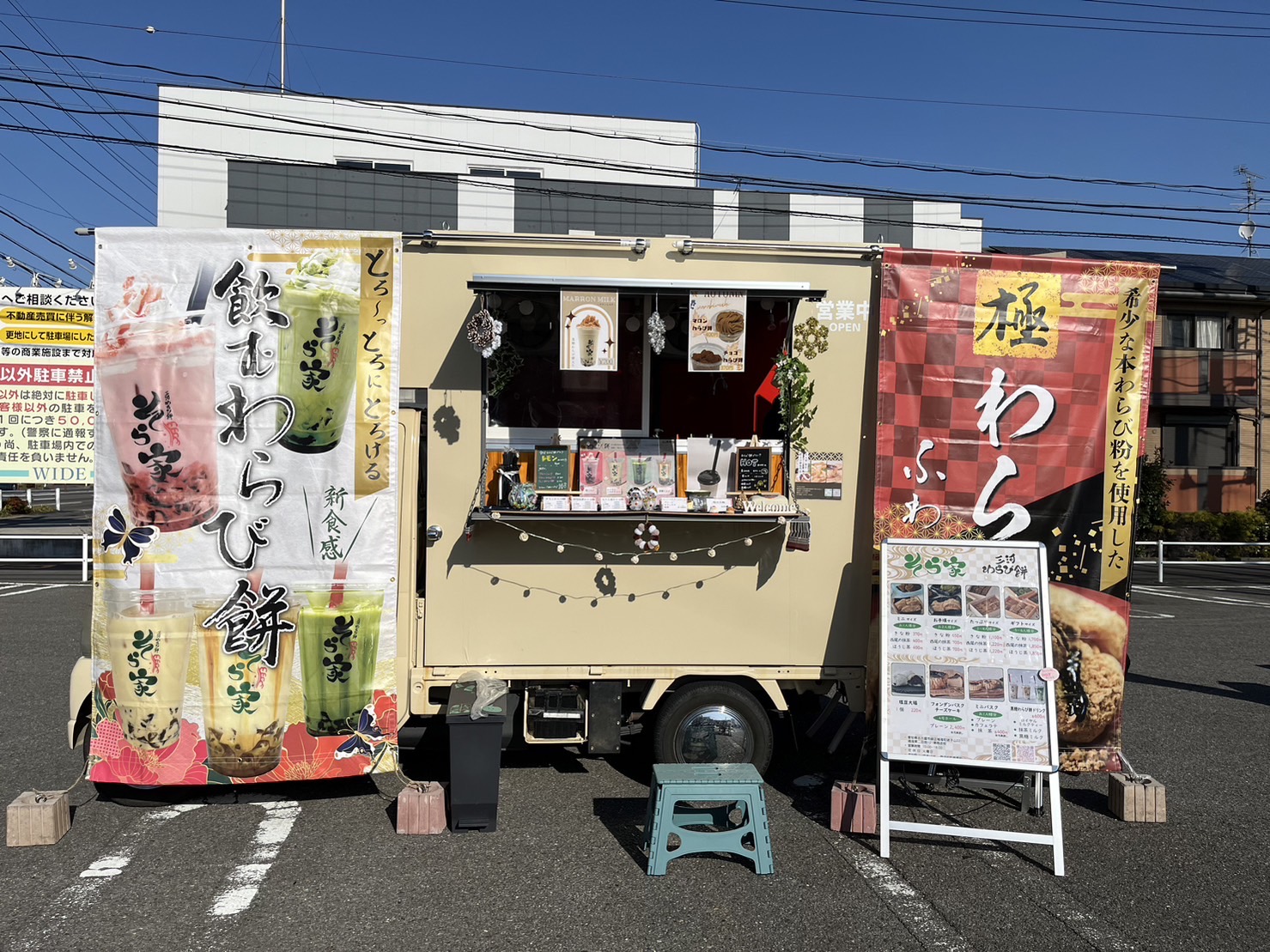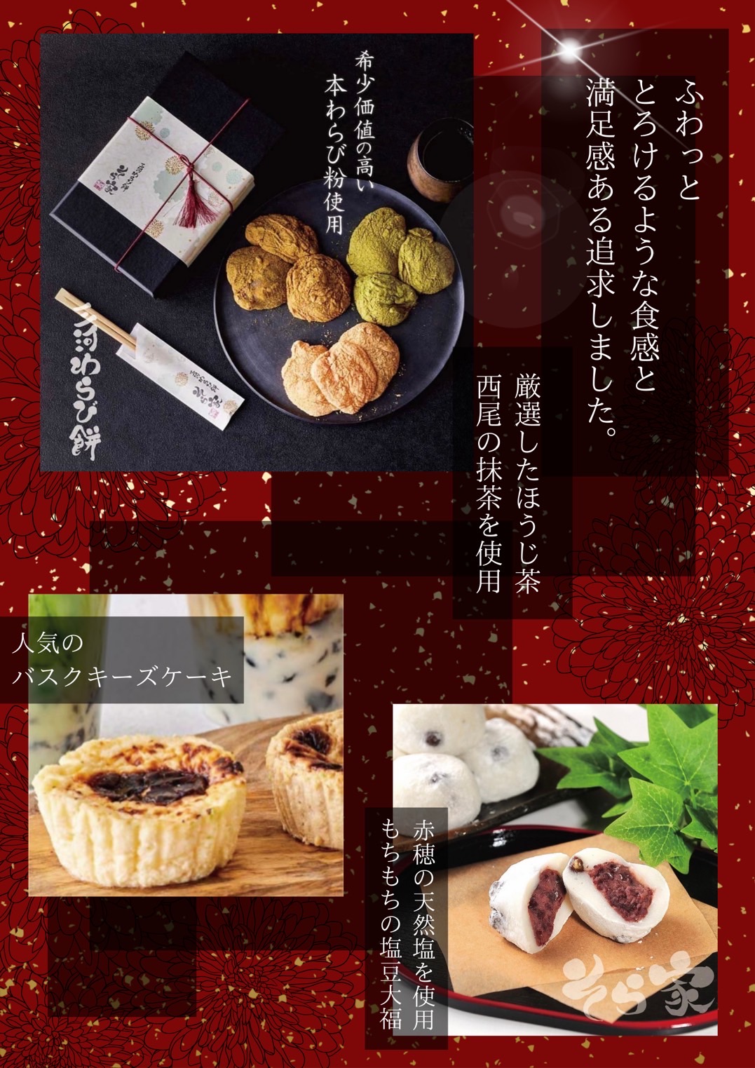 わらび餅、わらび餅ドリンク、塩豆大福、ミニバスクチーズケーキ、胡麻ぜんざい、みたらし団子
