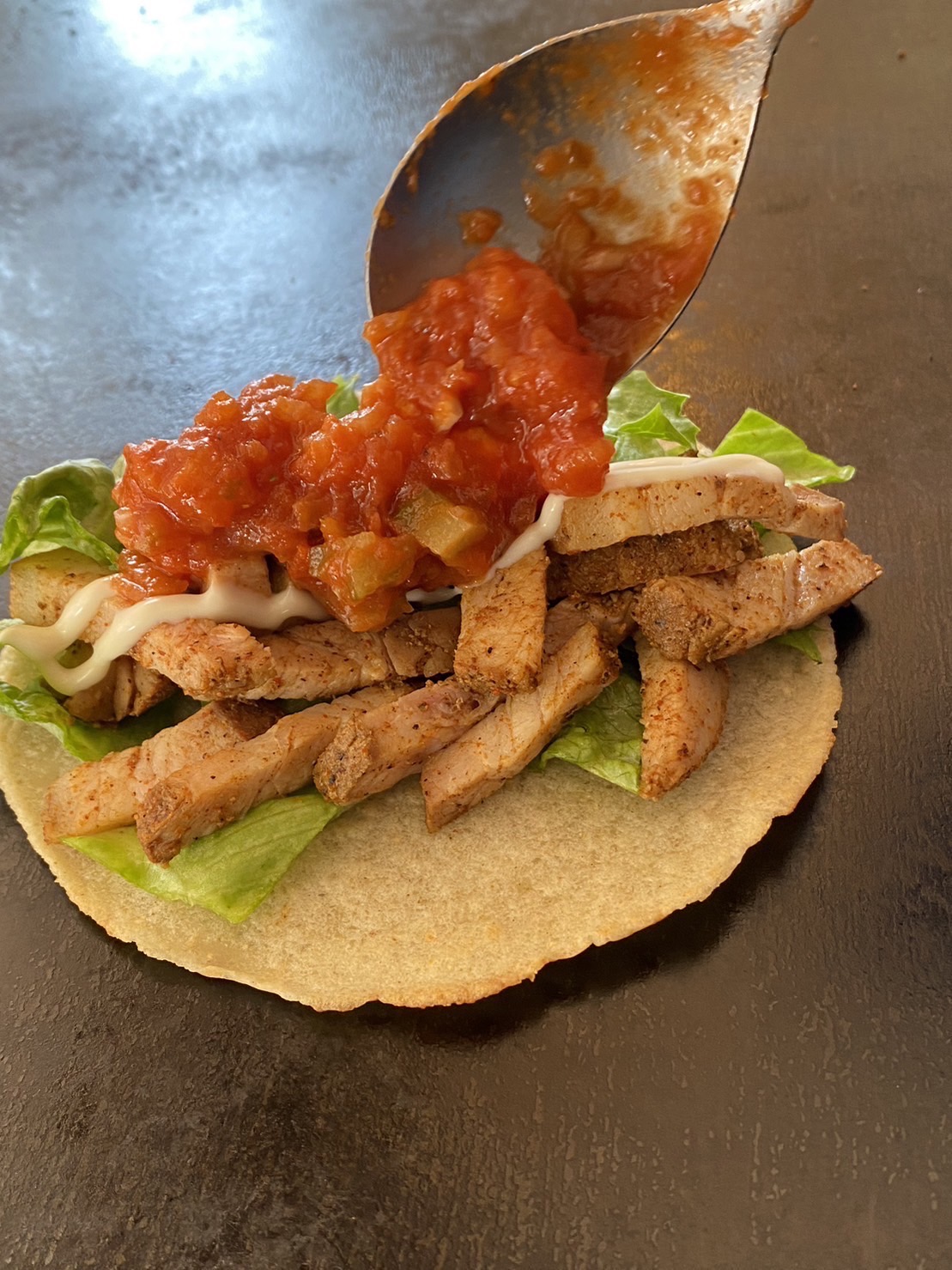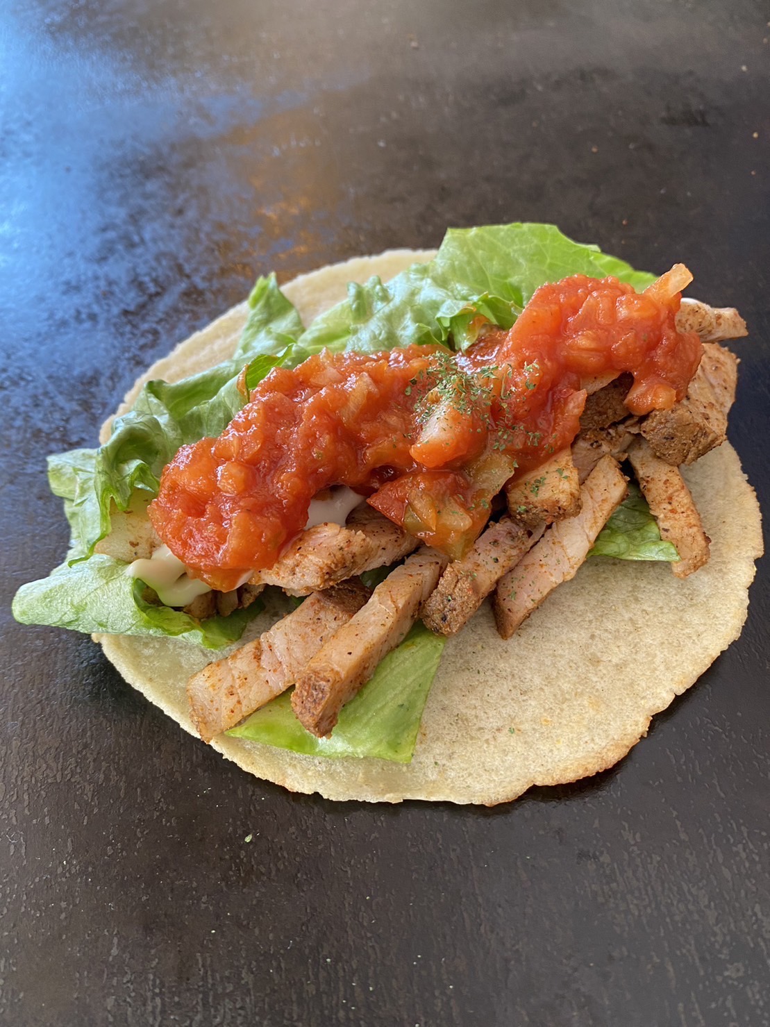 前日からしっかりとスパイスで味付けした豚バラ肉は、キッチンカーの鉄板焼きしてタコスにたっぷり入っています!