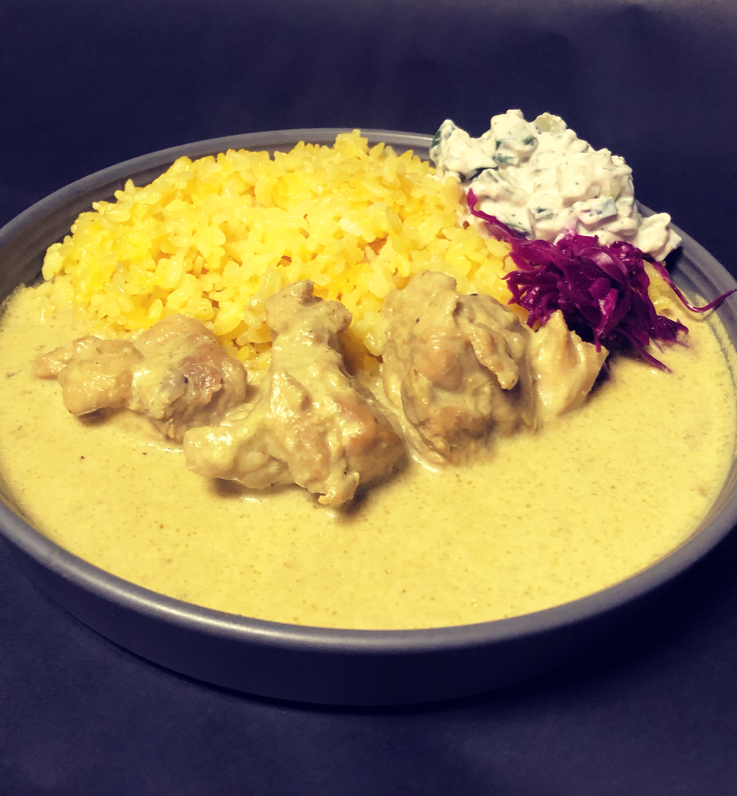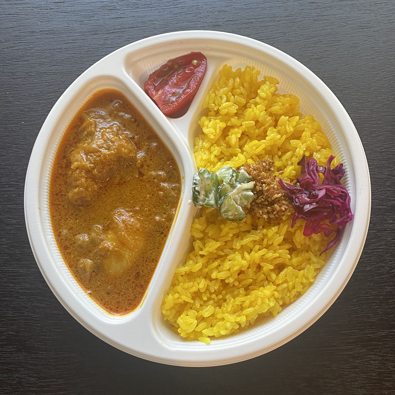 チャツネやライタなどインドアジアでよく食べるメニューを副菜としてトッピング。混ぜると2度美味しいスパイスカレーです。