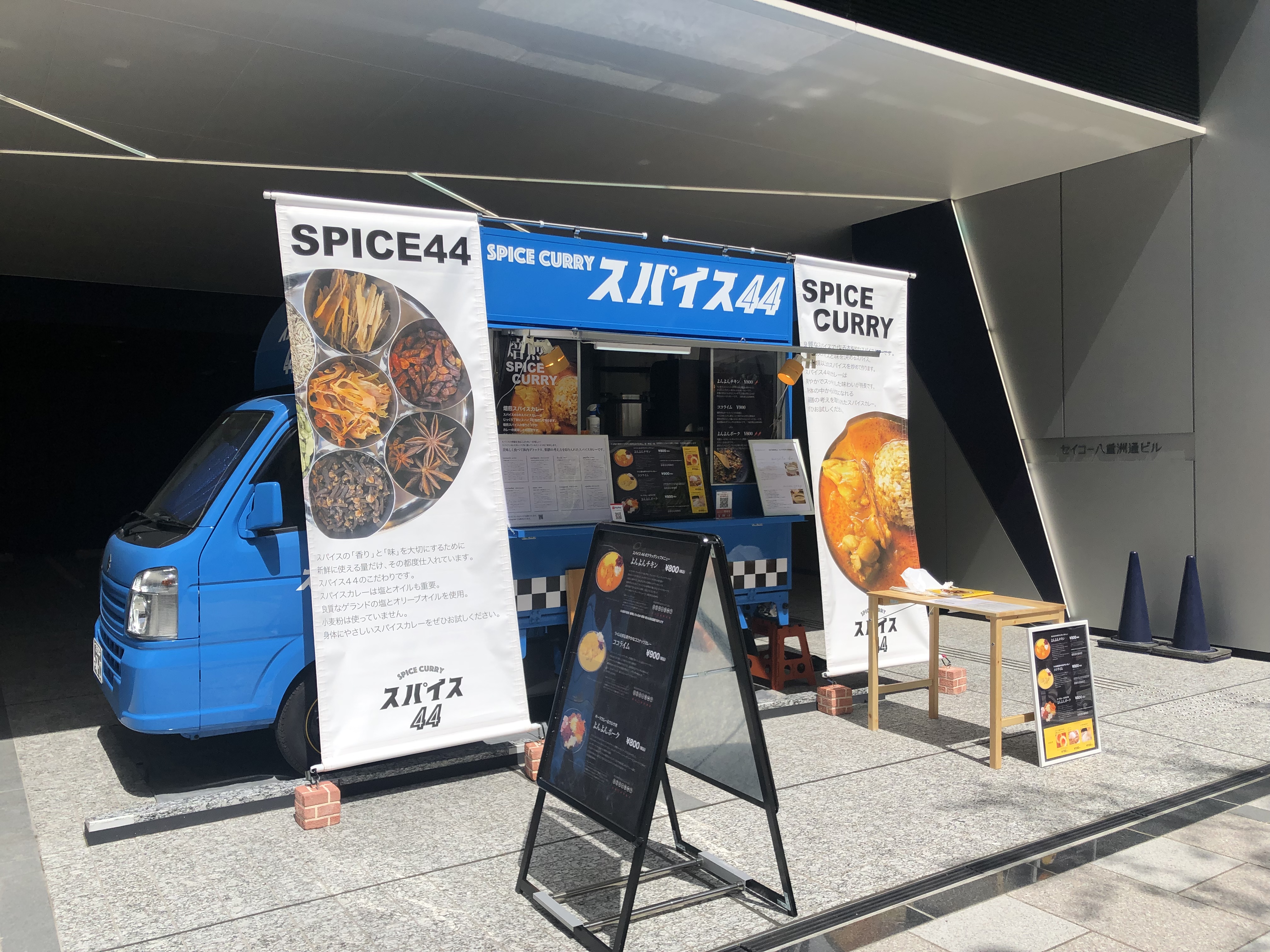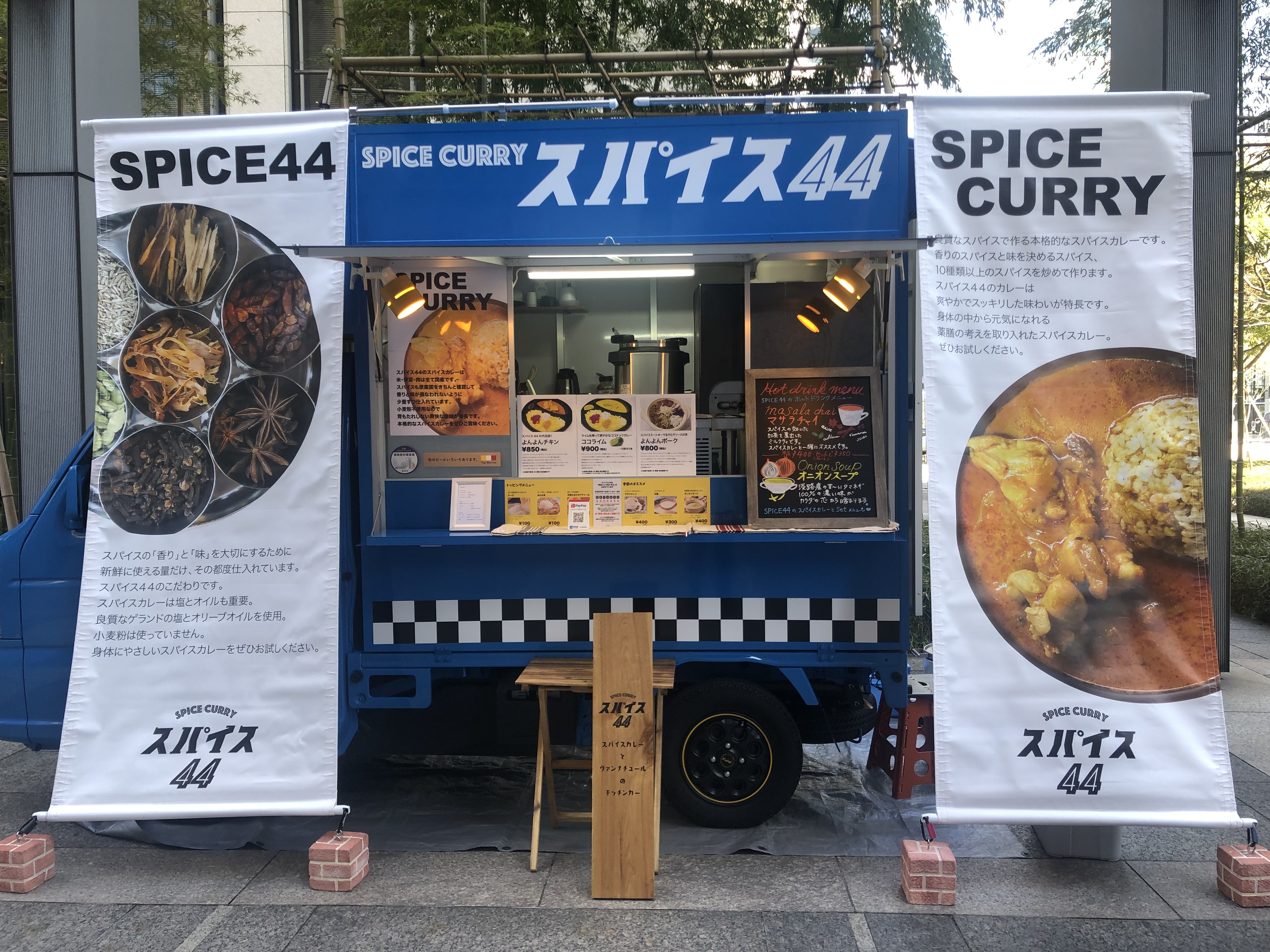 スパイス44のキッチンカーはコンパクトながらスタイリッシュなデザインです。自然の中でも街の中でも映えるカラーリングと一眼でわかりやすいデザイン性のあるタペストリーでスッキリとした佇まいで、景観を壊しません。