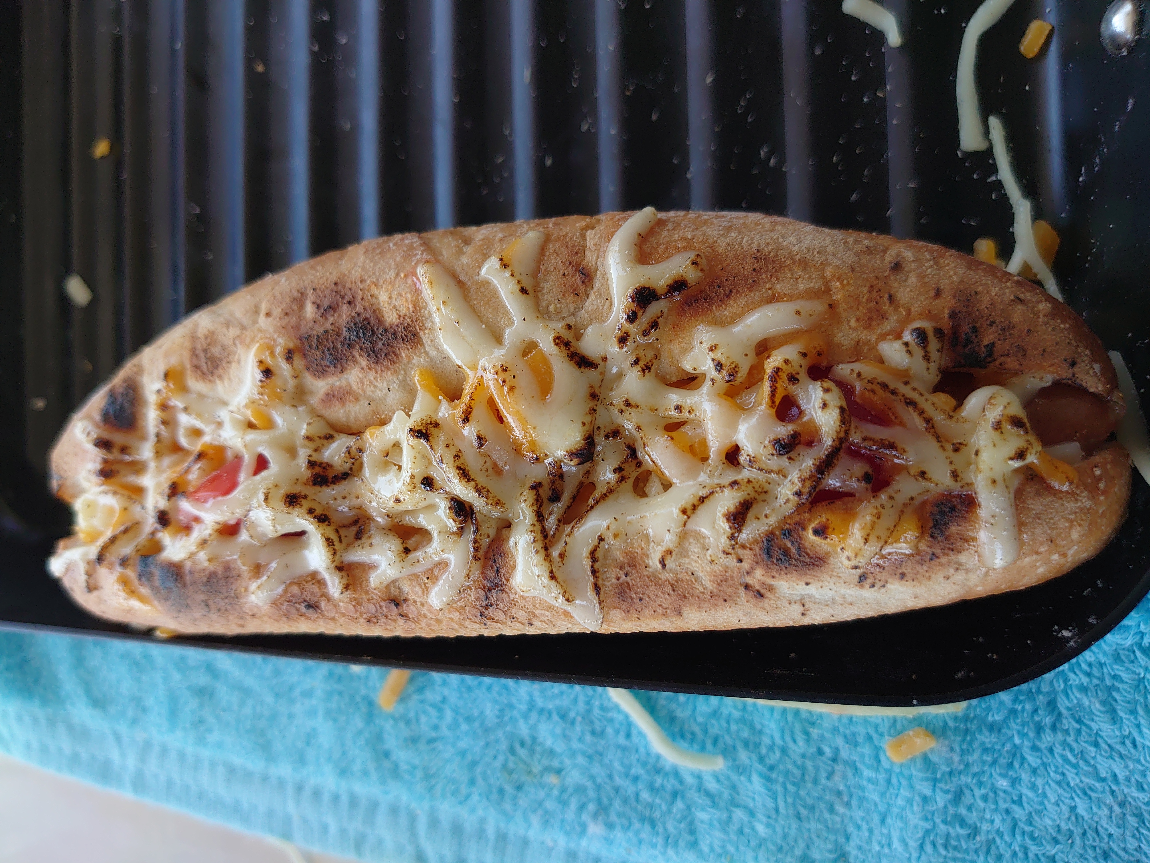 フランスパンを焼いた中にウインナーとチーズを入れて食べやすくなっています。