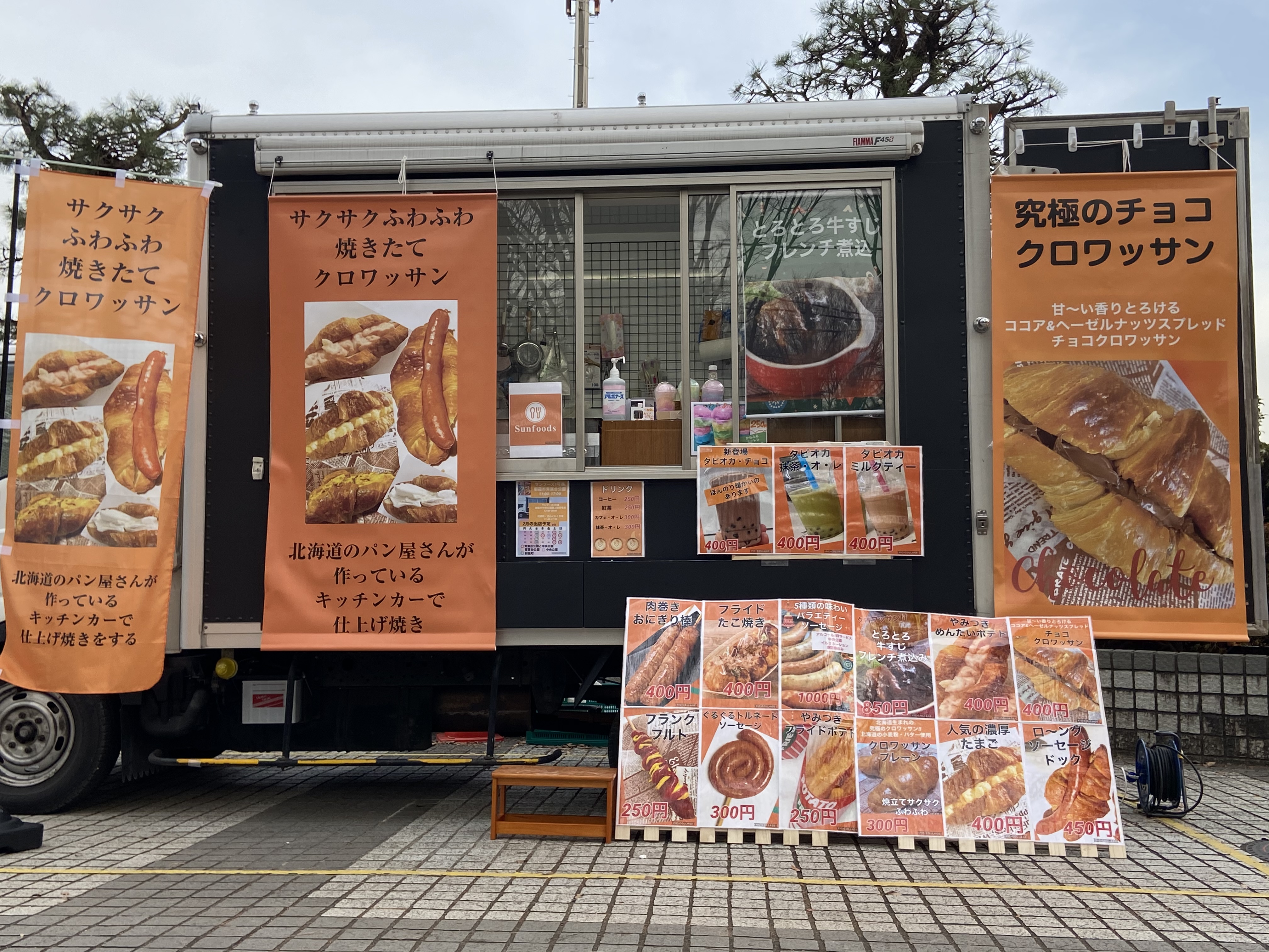 メインは北海道のパン屋さんが作っているサンフーズキッチンカーでしか食べられないあつあつサクサクふわふわのクロワッサンですが、その他牛すじカレー、バラエティーソーセージ、フライドポテト、タピオカドリンク、かき氷、そして商標登録済のオリジナルドリンク『シャリカフェ®️いちごミルク果肉入り🍓』などなど30種類以上の商品をご提供できます。