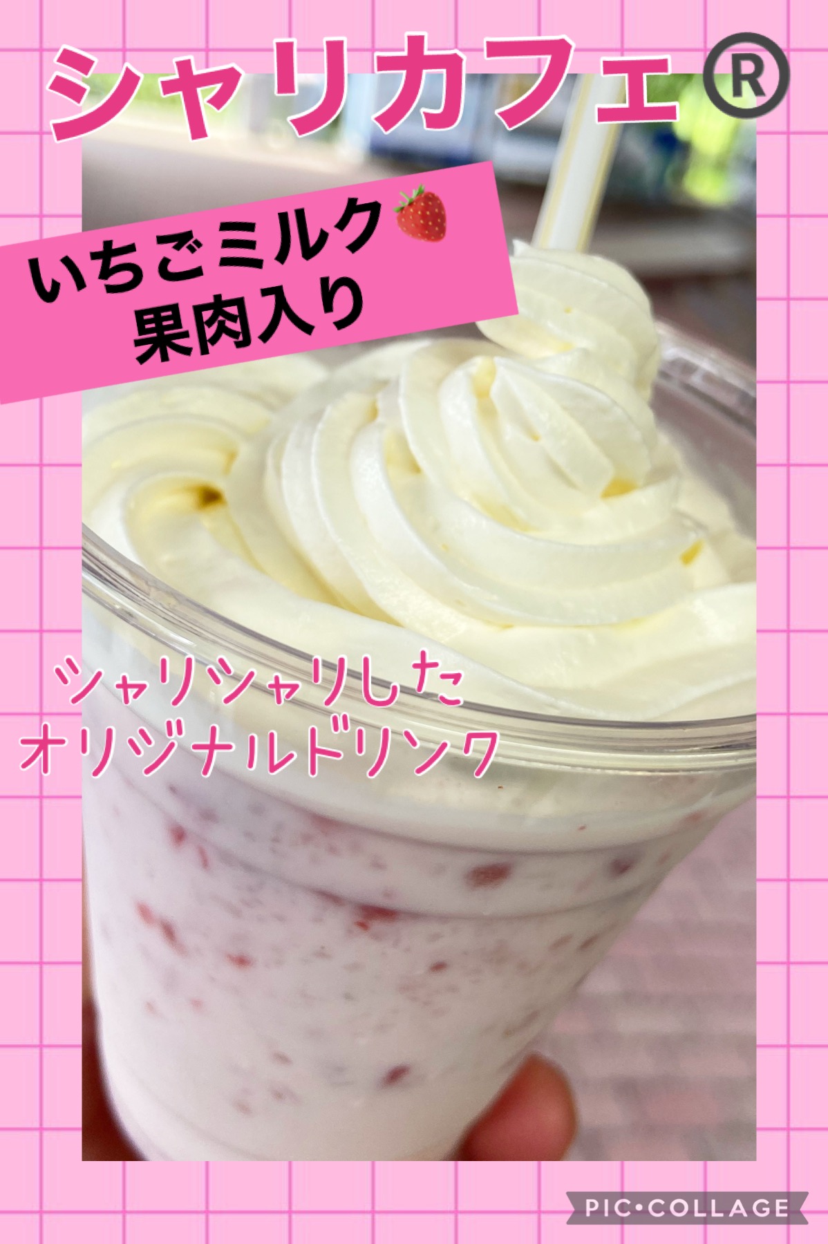 シャリシャリっと、そしてミルキーないちご味のいちご果肉入りオリジナルドリンク。たっぷりの生クリームトッピング。只今ブレイク中。