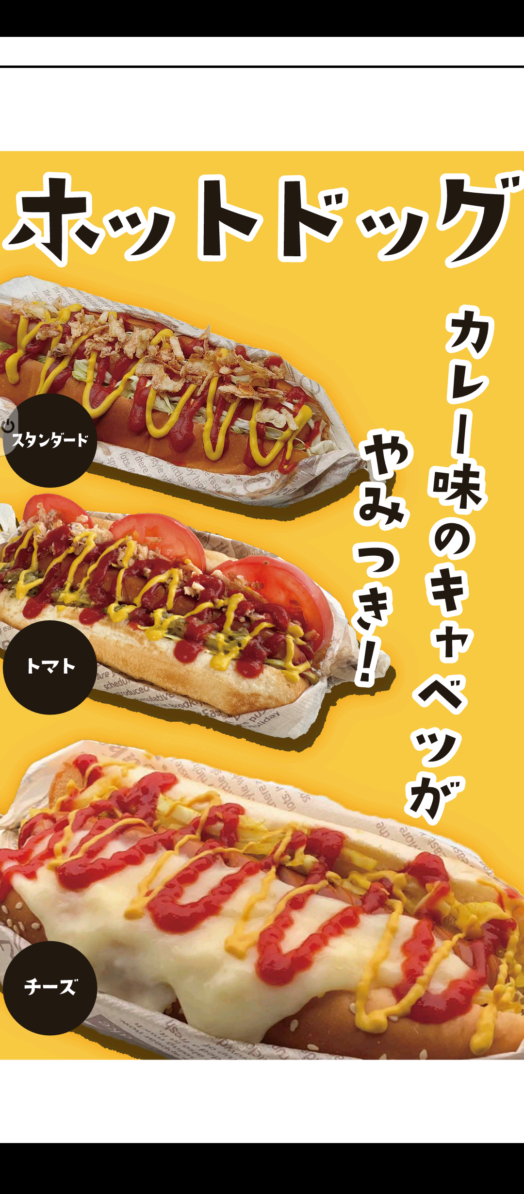 少し焼いたパンにカレー味のキャベツと熱々のロングウインナーを挟み込み、トマトや、とろとろチーズなどをトッピングしたホットドックは、一度食べるとやみつきに!