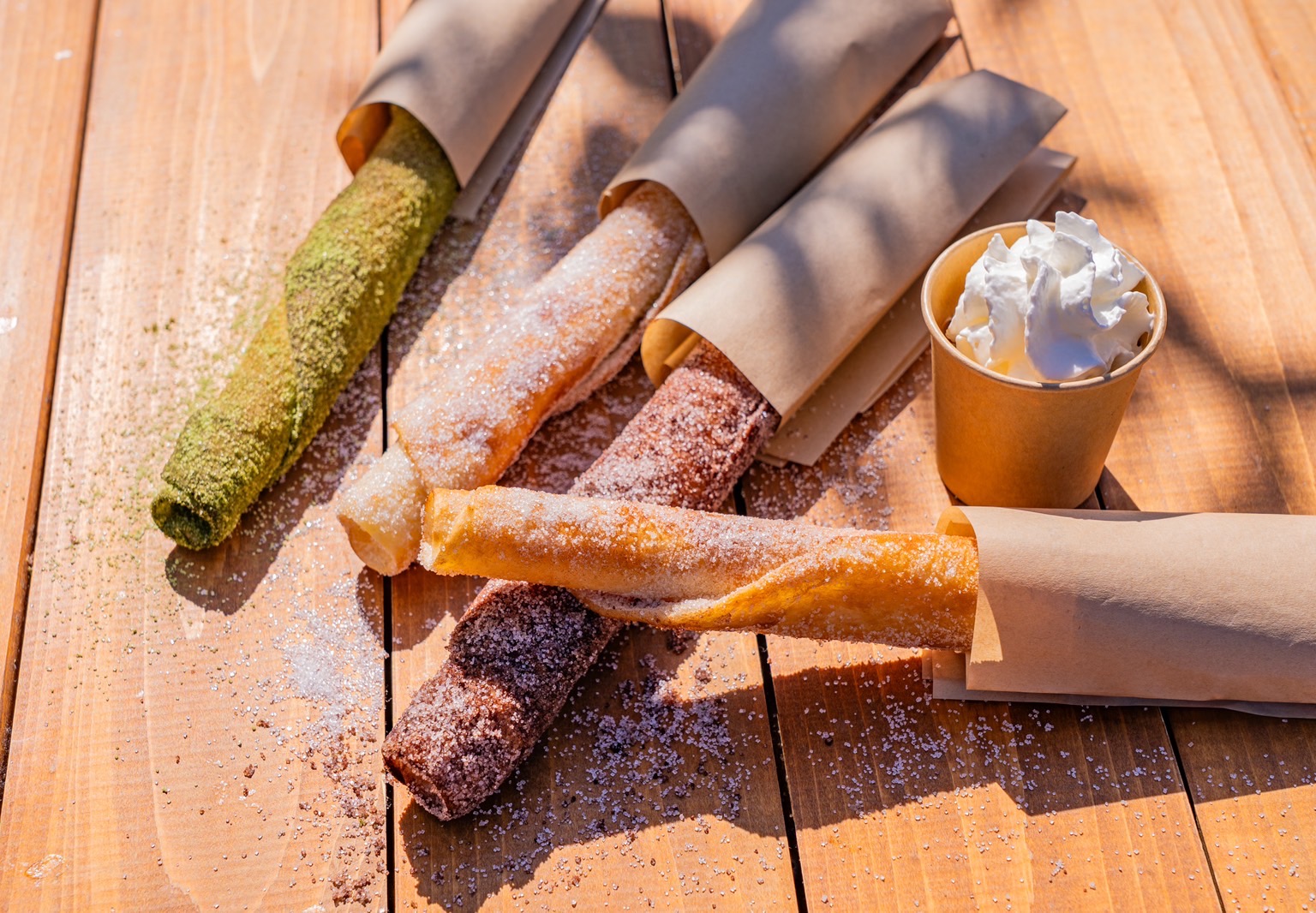 トルティーヤを巻いて揚げたおやつ系トルティーヤの【チュロティーヤ】薄いトルティーヤだからこそ、揚げると周りはサクサクに。揚げパンのようなチュロスのような新感覚なおやつトルティーヤです!当店でしか食べられないチュロティーヤをぜひお召し上がりください!