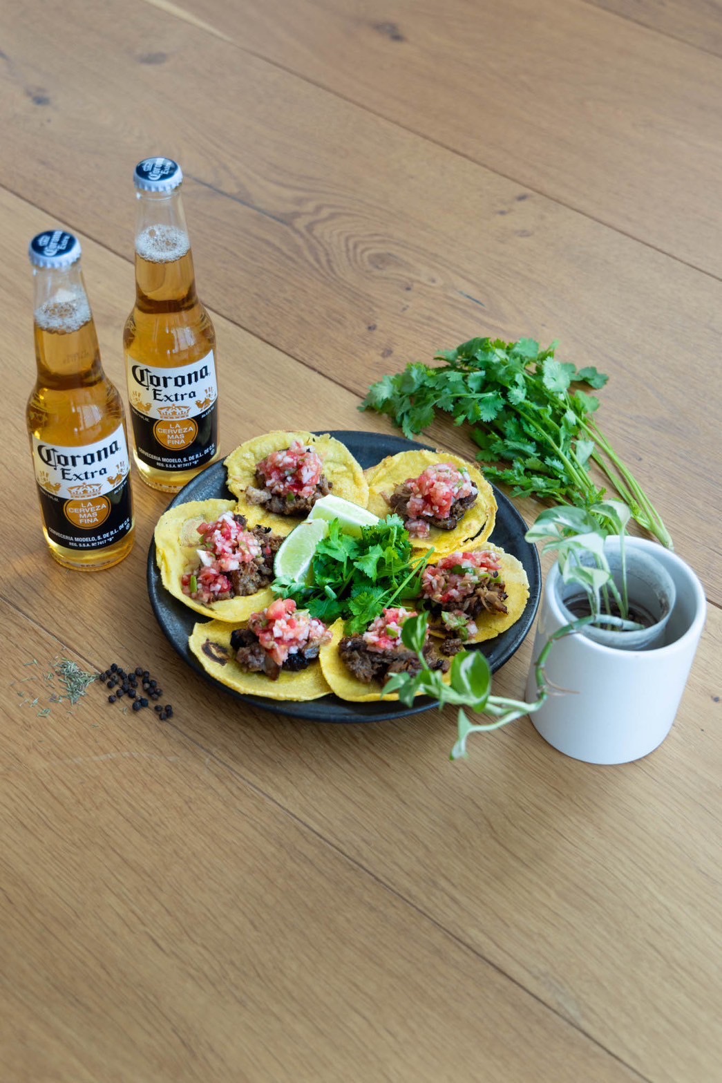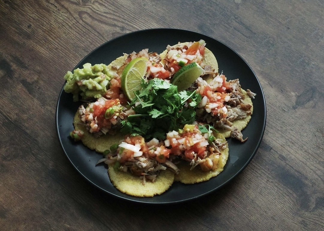 看板メニューは、果実を隠し味にした自家製サルサと、じっくり煮込んだ豚肉(カルニータス)を使用した本格タコス。