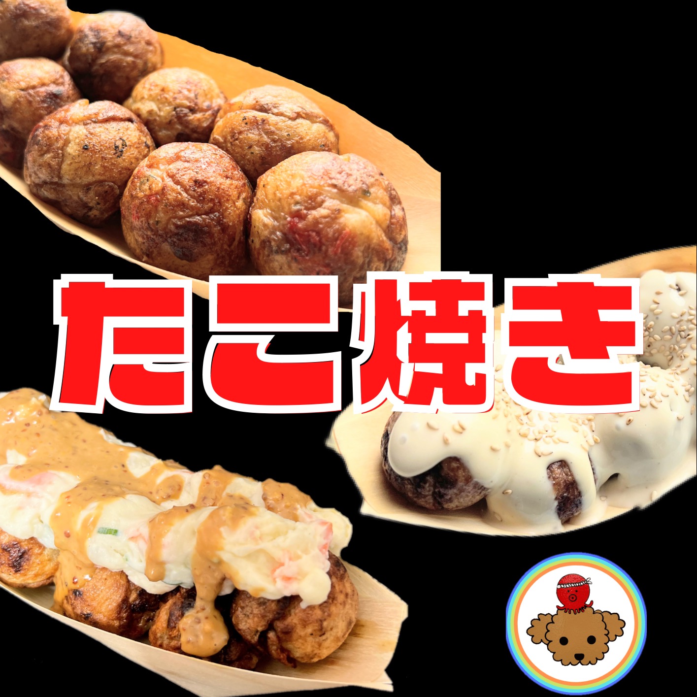 たこやき、マヨダク、創作たこ焼き、ドリンク、かき氷(夏季)、どて丼(冬季)、わんちゃん専用たこ焼き