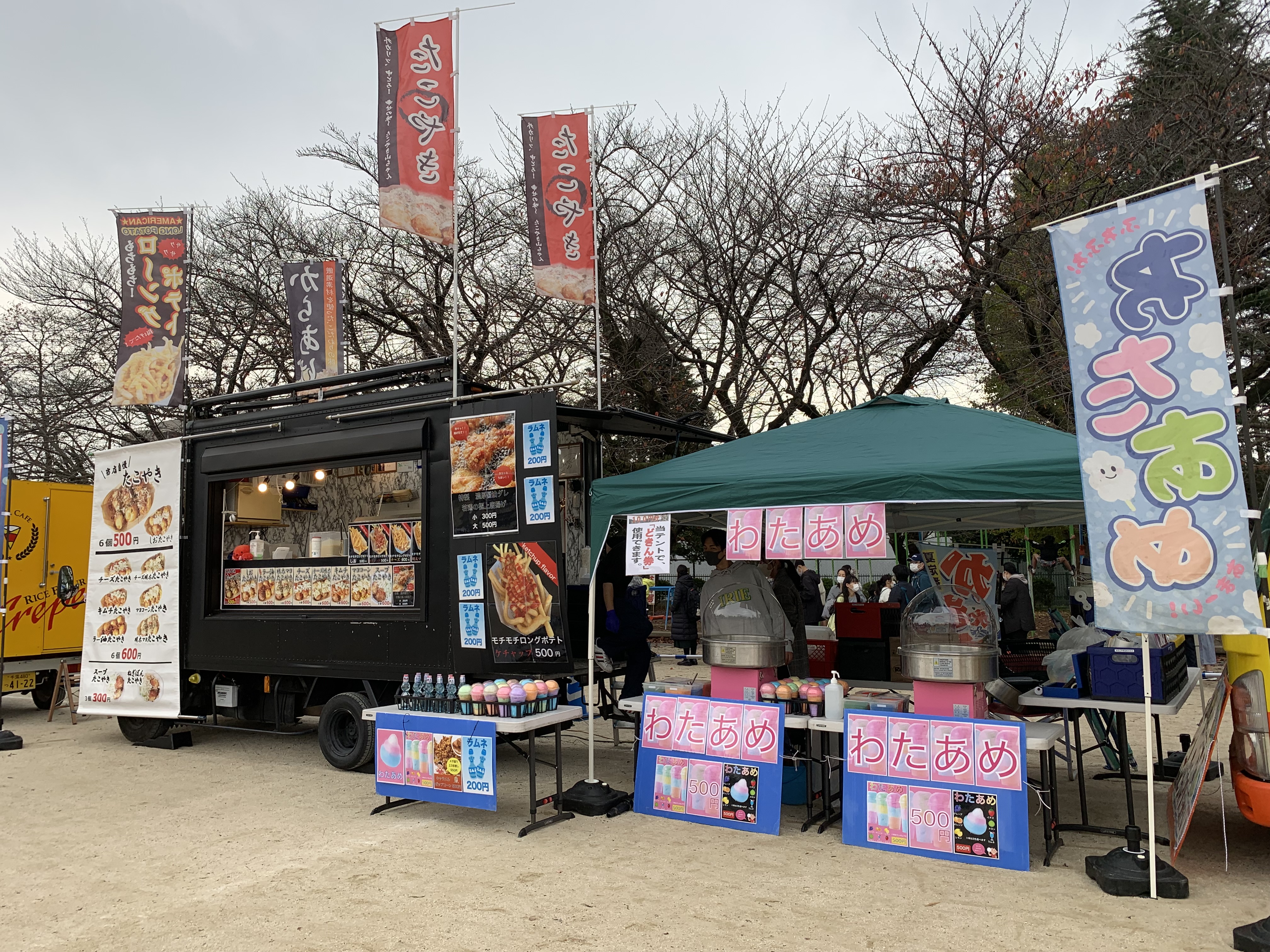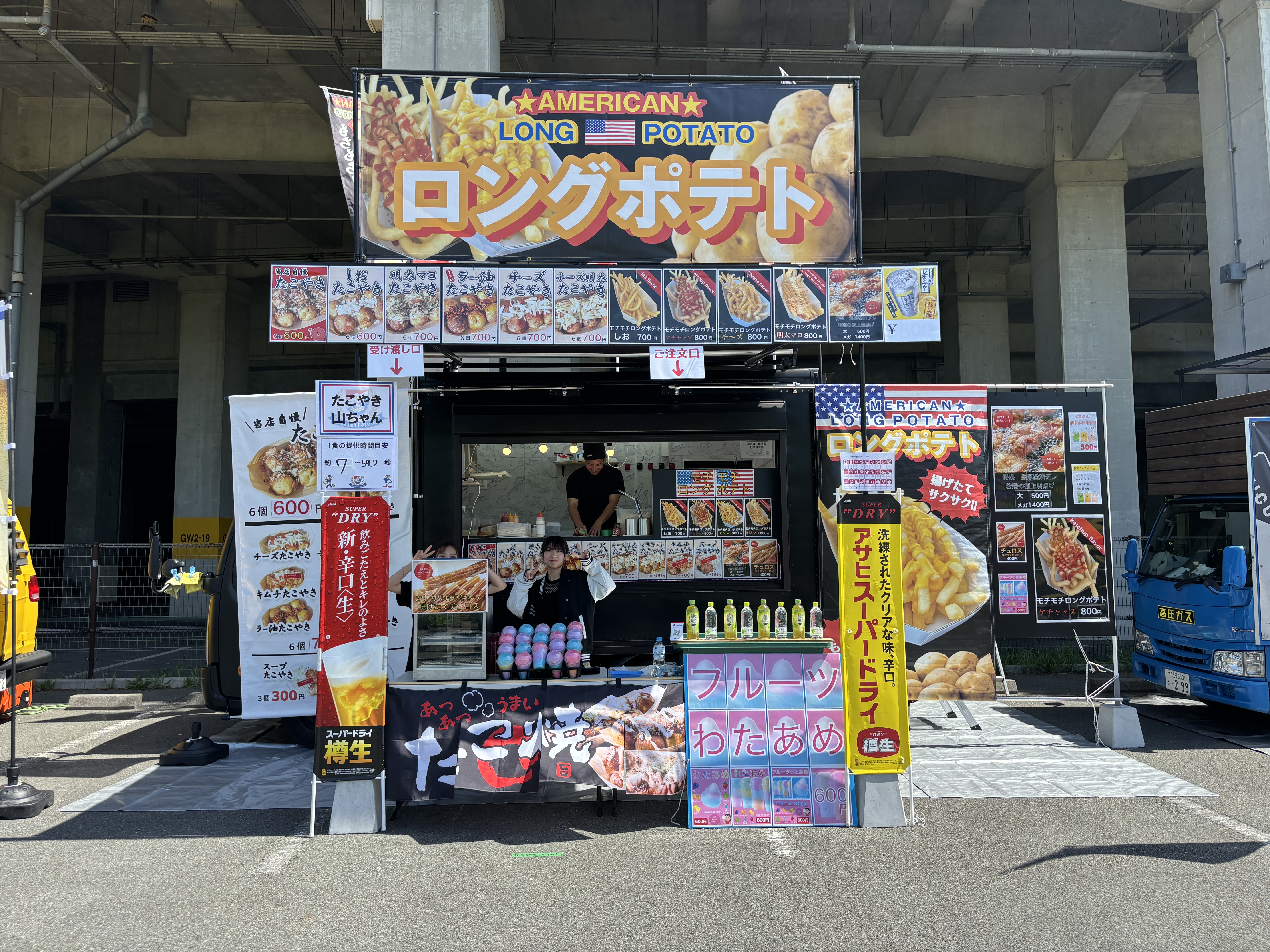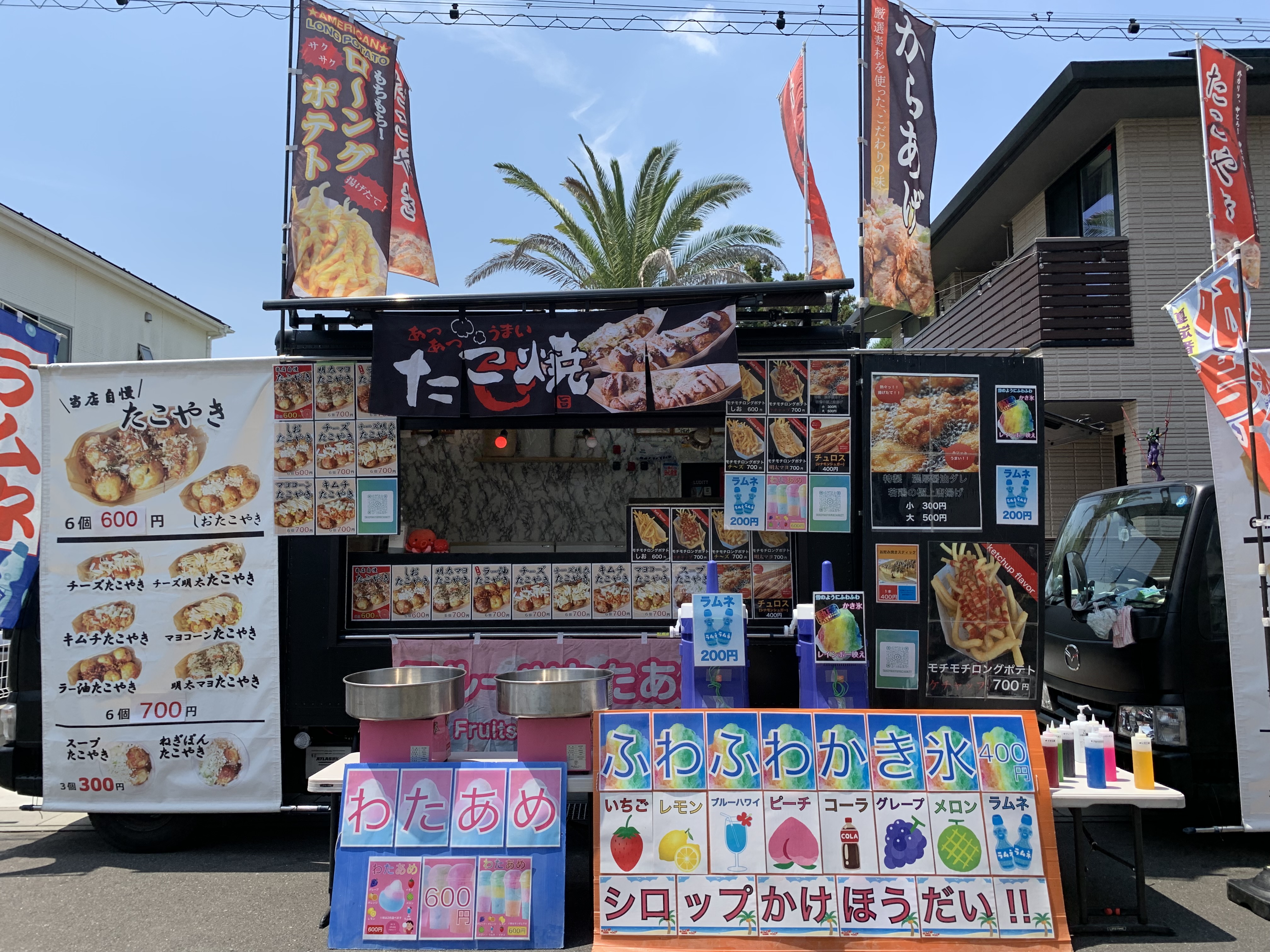 たこやき、ロングポテト、唐揚げ、チュロス、かき氷、レインボーわたあめ、いちご飴、フルーツ飴、ポップコーン、揚げ餅