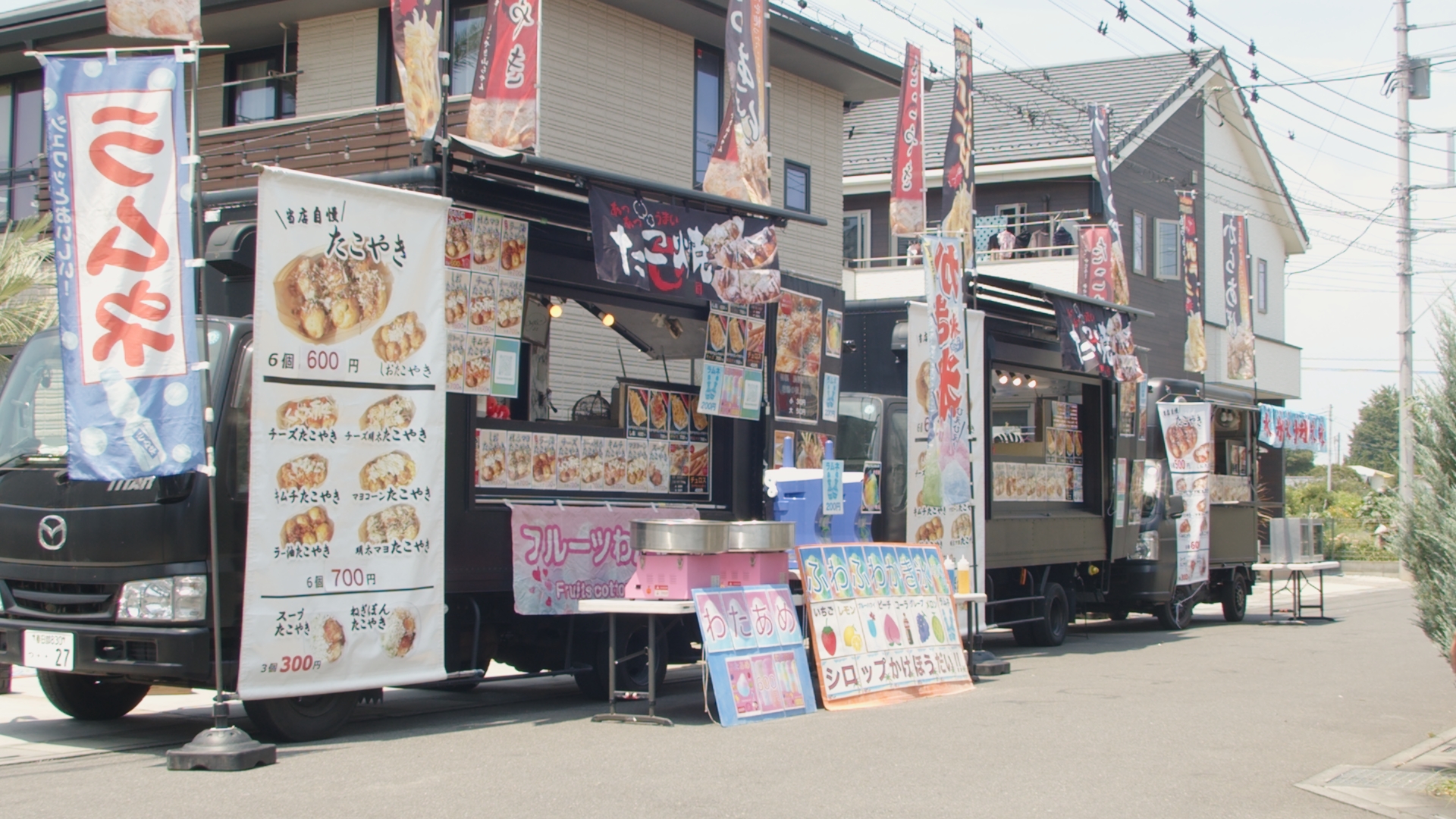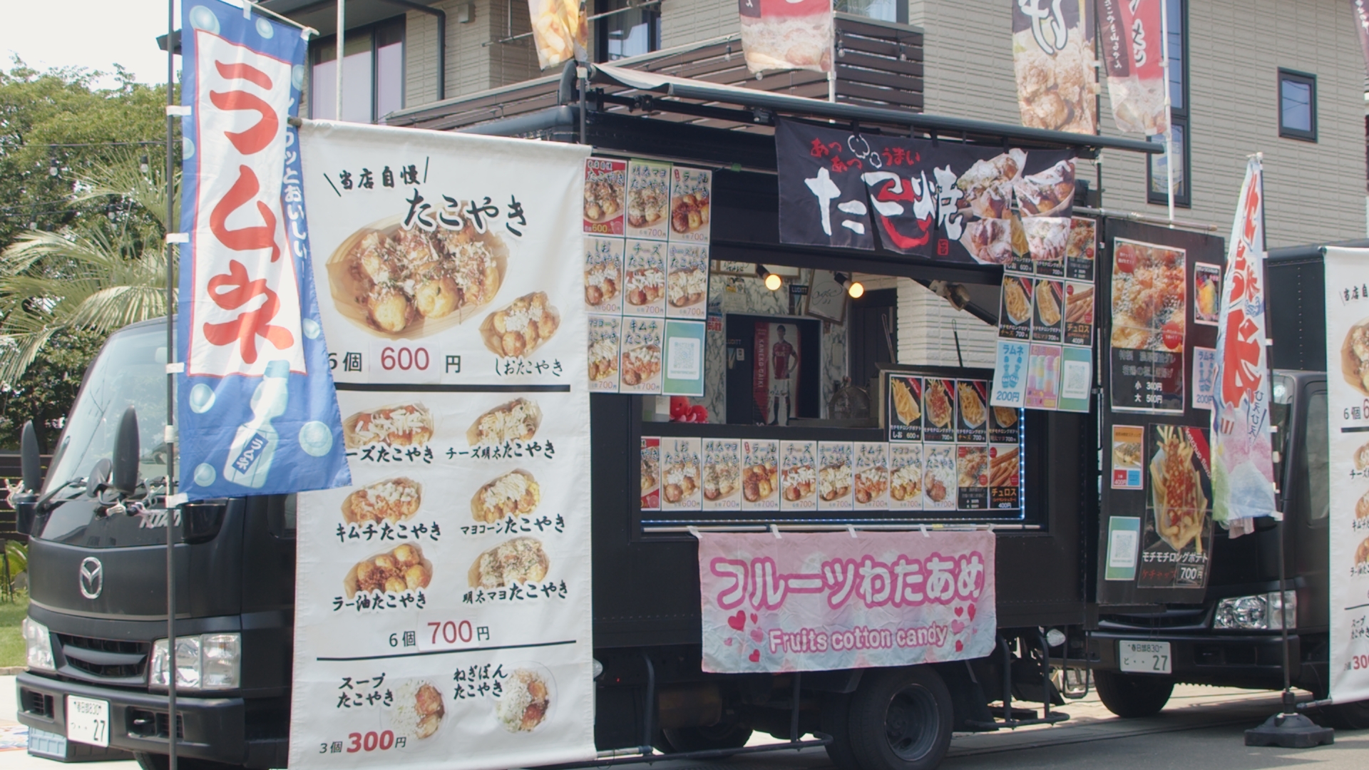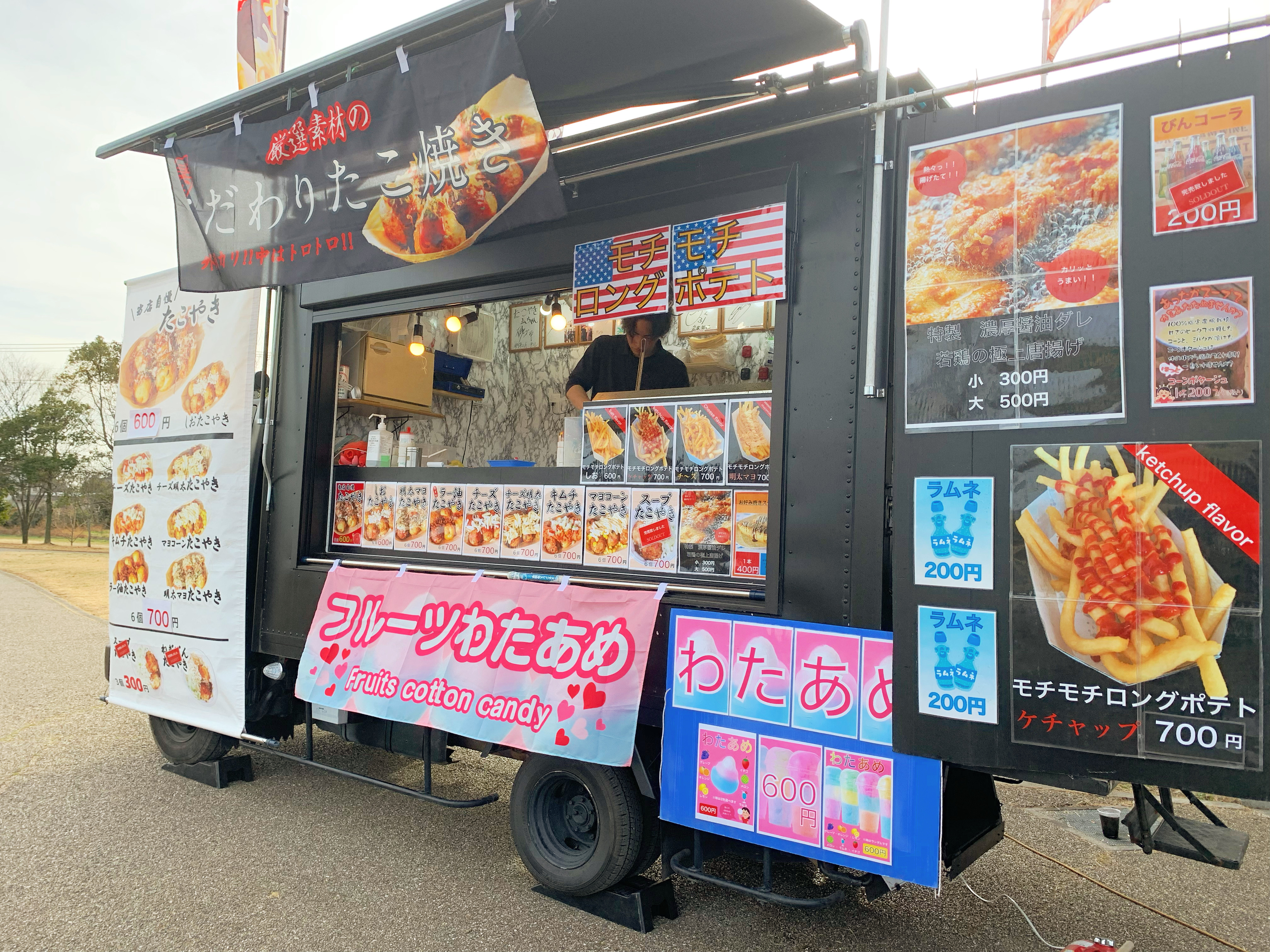 たこやき、ロングポテト、唐揚げ、チュロス、かき氷、レインボーわたあめ、いちご飴、フルーツ飴、ポップコーン、揚げ餅