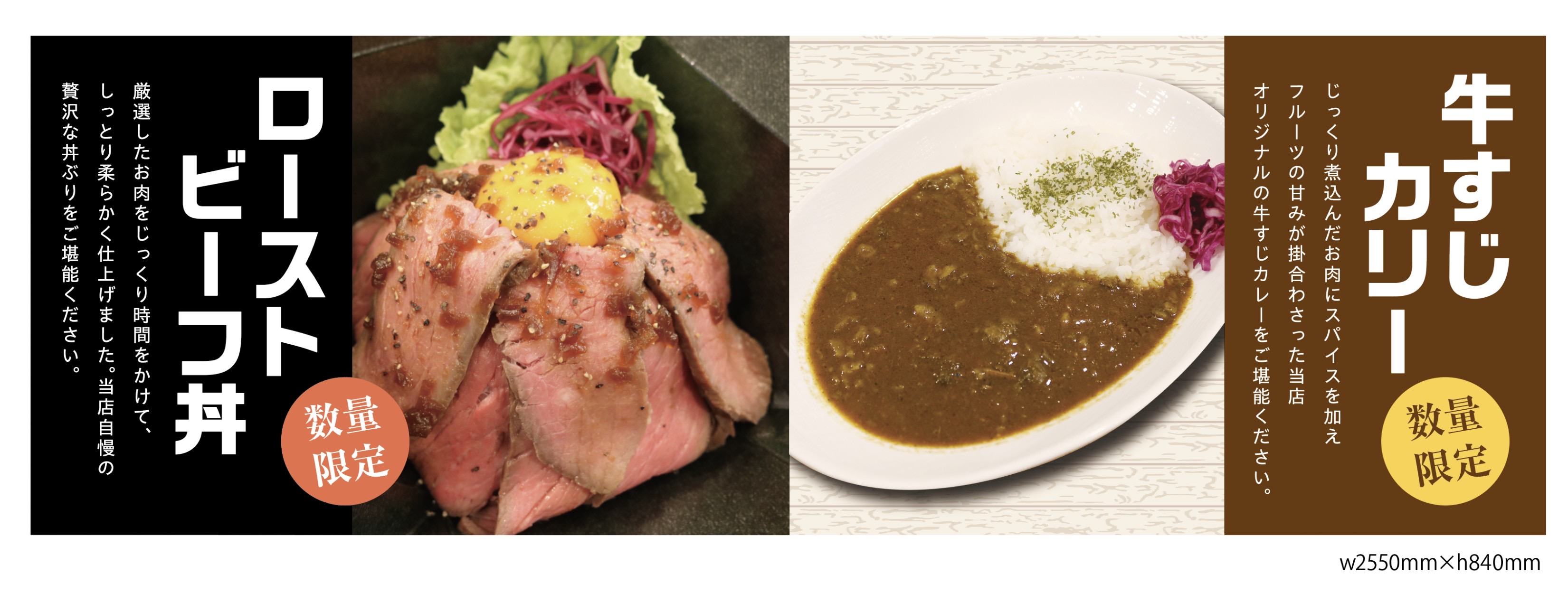 ローストビーフ丼、牛すじカレーをランチ出店しております。