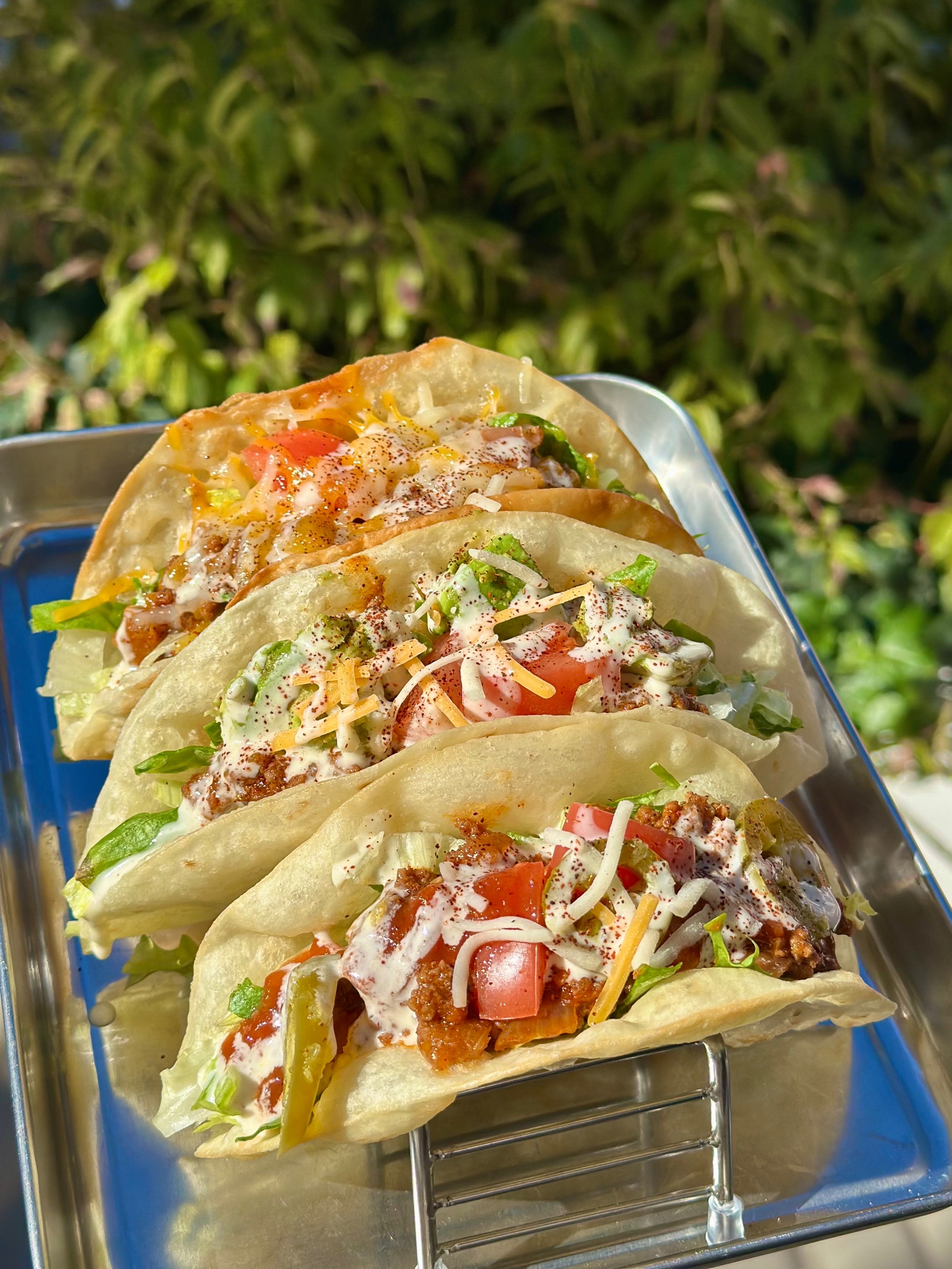 揚げた生地で作る“揚げ”タコスは当店完全オリジナル!辛さの無い特製タコミートとたっぷりの地元野菜を乗せてボリューム満点です!アボカドや炙りチーズなどトッピングも多数ご用意。あなたのお好みのタコスを是非ご賞味ください♪