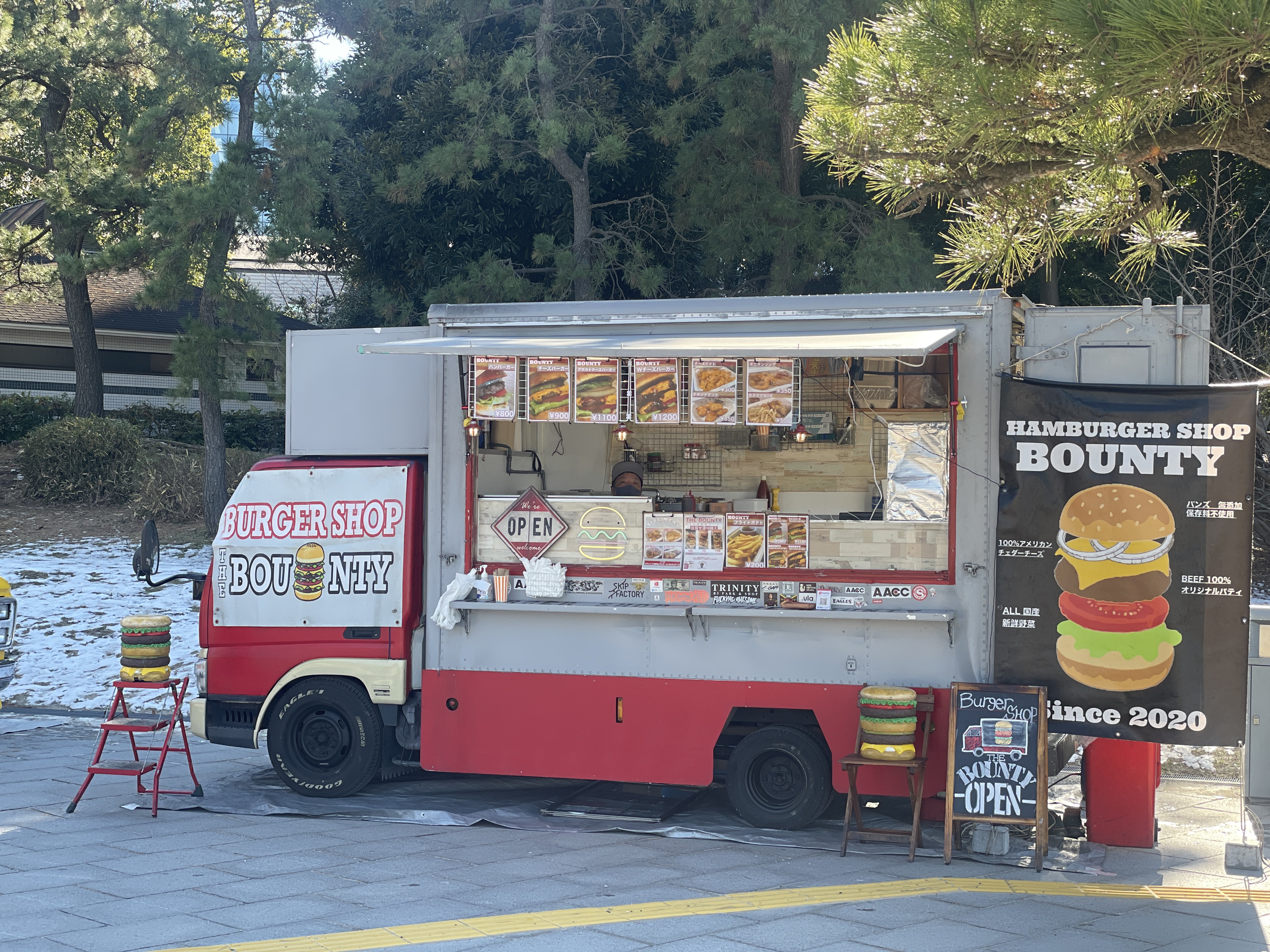 THE BOUNTY のキッチンカーは赤とグレーのお洒落かつ可愛いキッチンカーの作りになっております。