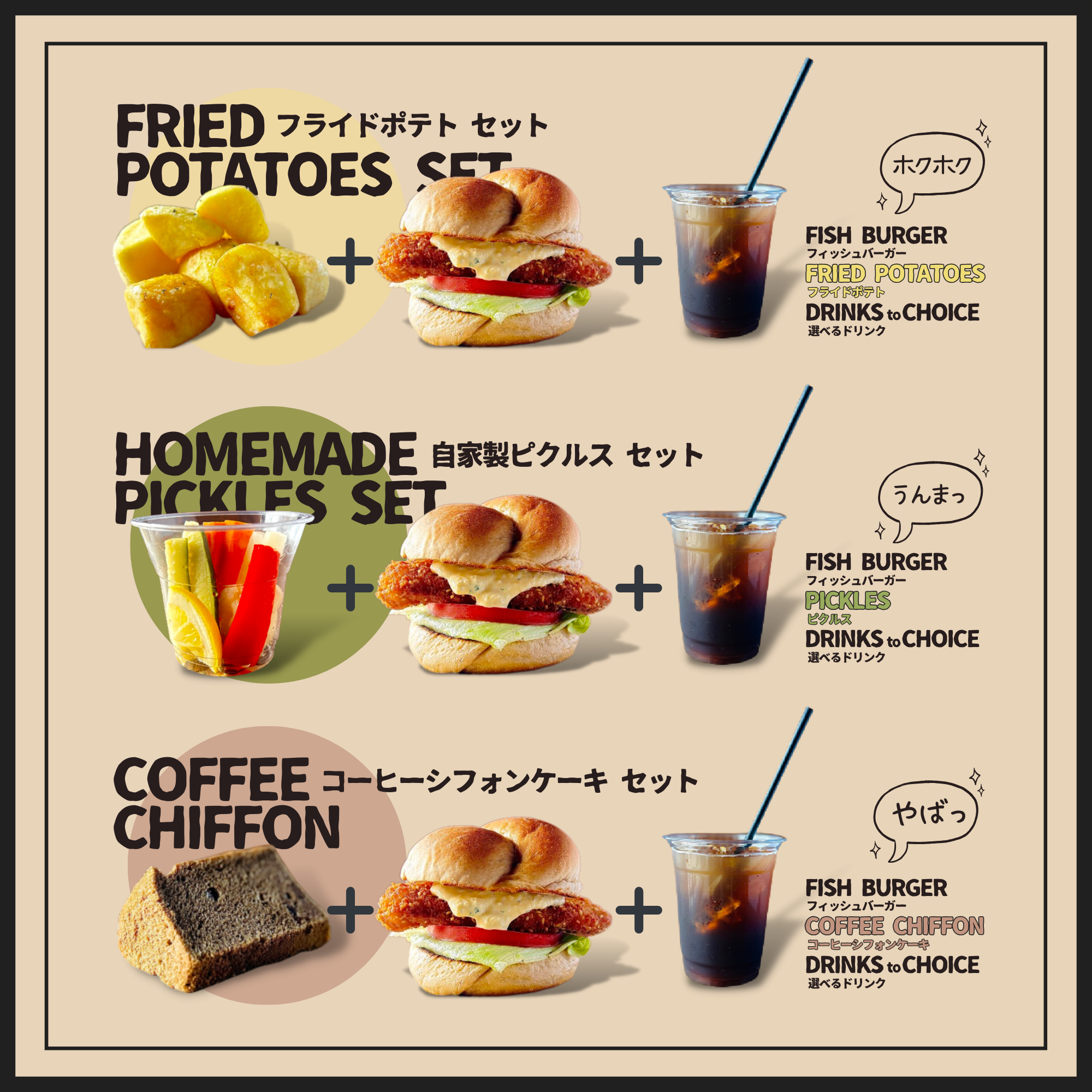 フィッシュバーガー・フライドポテト・ピクルス・シフォンケーキ・コーヒー・その他ドリンク類