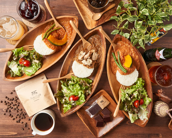マフェ(セネガル料理)、スープカンジャ(セネガル料理)、カフェのカレー、チャイ、ハイビスカスジュース、自家焙煎コーヒー、カフェトゥーバ(セネガル珈琲)、自家焙煎チョコレート、スコーン、ソフトクリーム