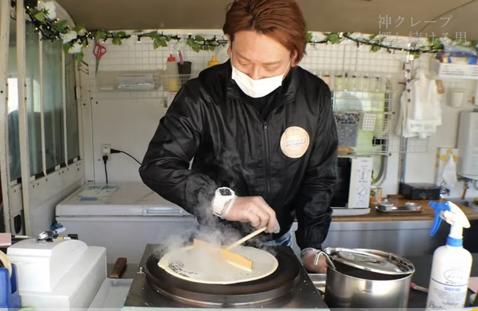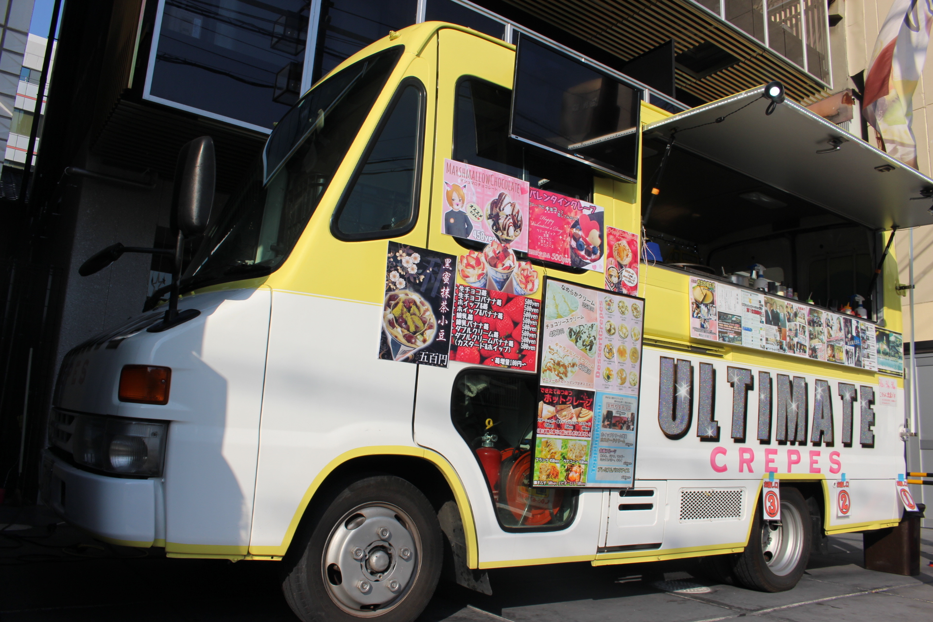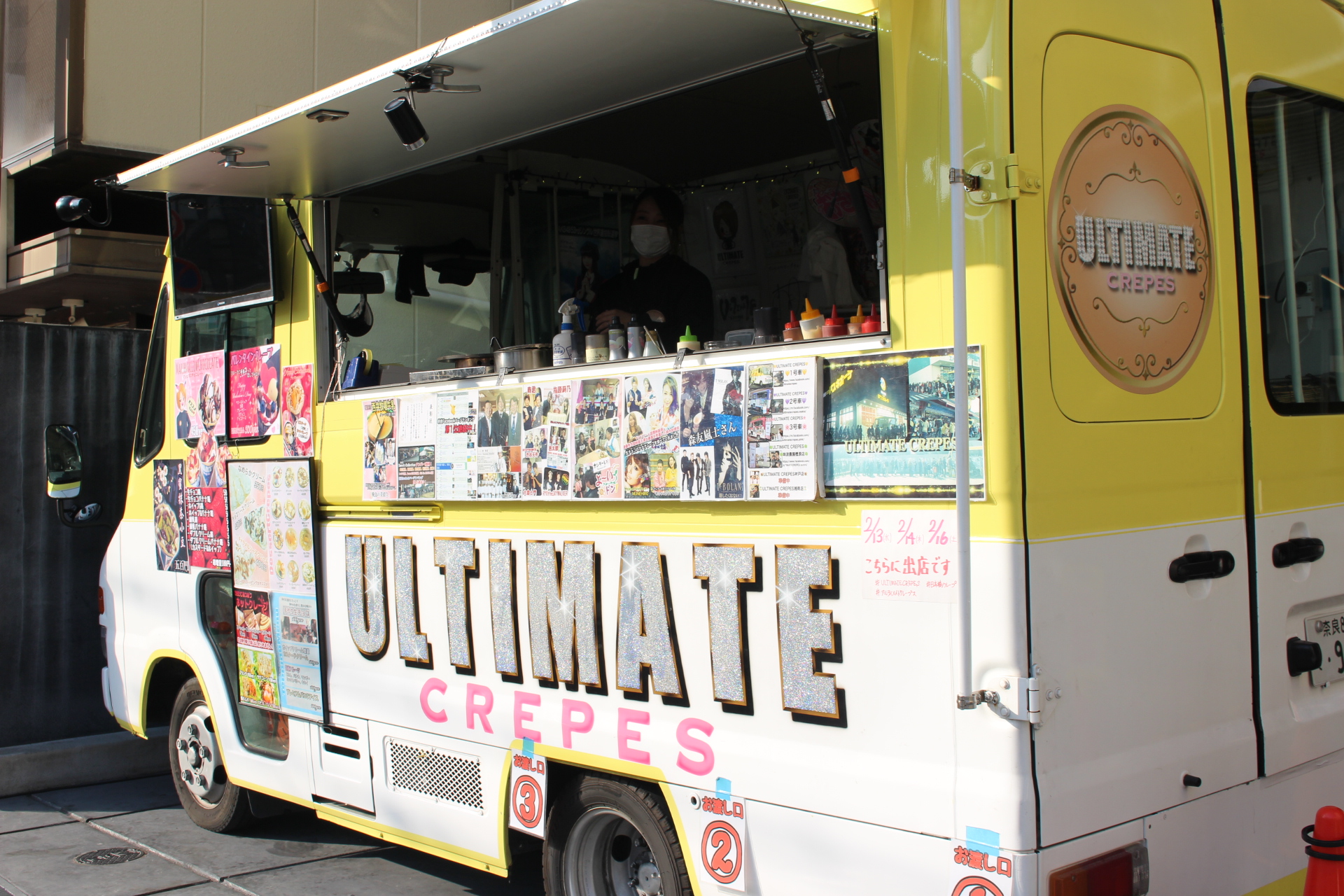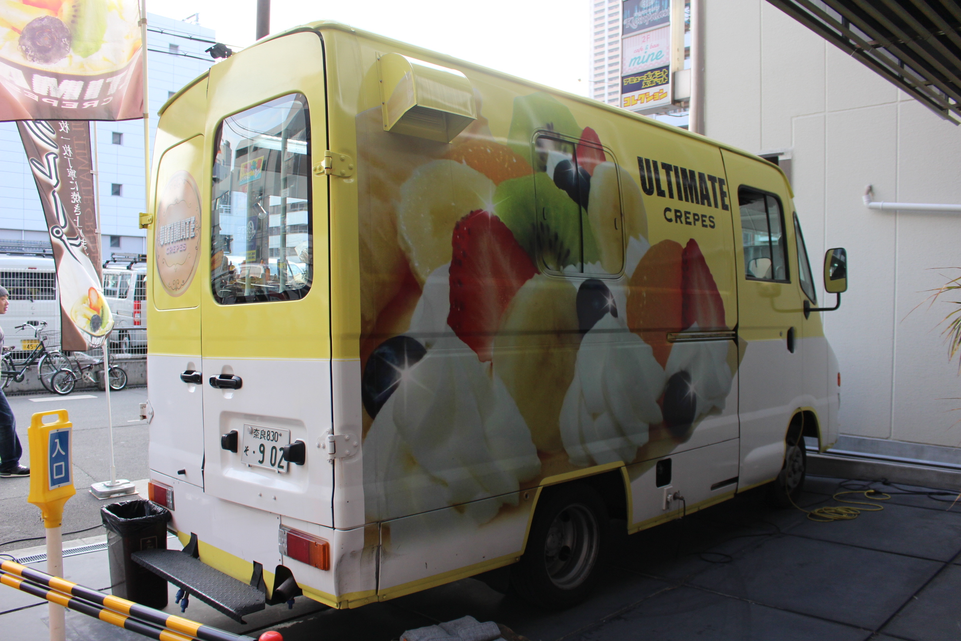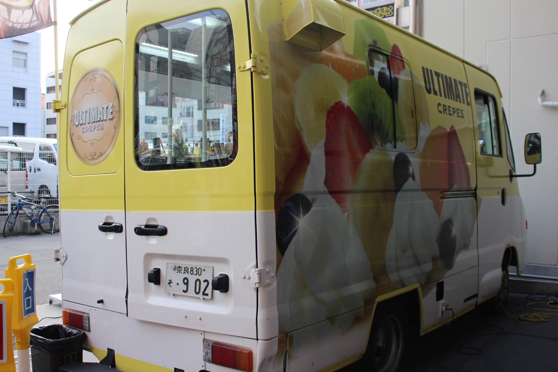 逆サイドにがっつりとクレープのデザインが施された、黄色い奇抜なキッチンカーアルティメイトクレープス。奈良、大阪、和歌山を中心に営業中。フランチャイズで店舗も急増中です!