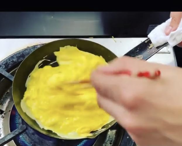鉄のフライパン使用、強火でふわふわ感を出しつつ