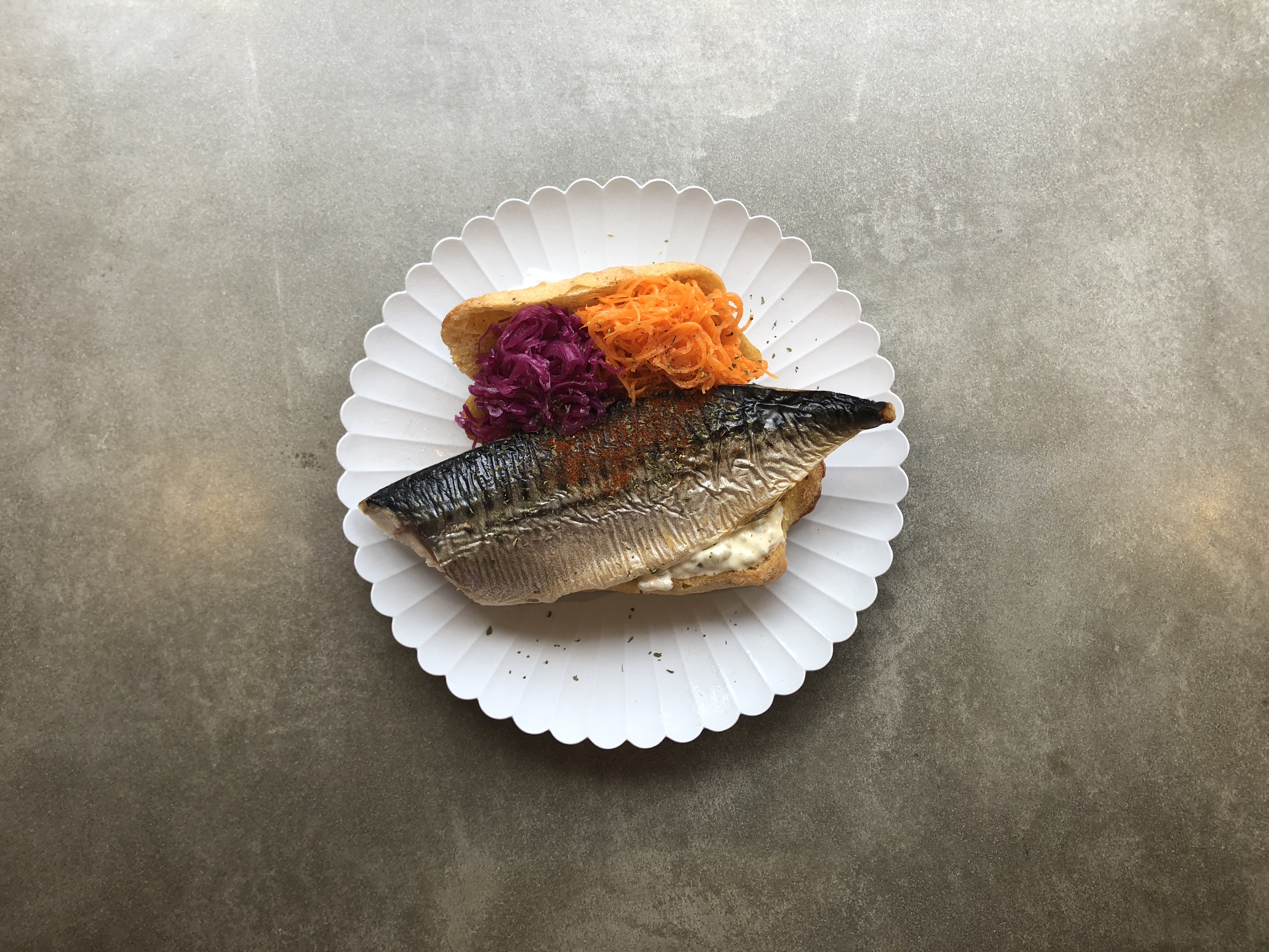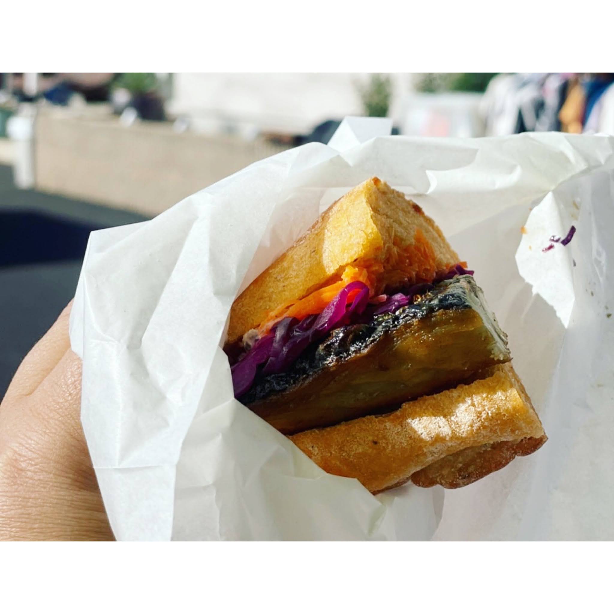 魚進鮮魚店コブ鯛号を見かけたら、サバサンドをまずはチョイス!トルコの屋台料理のサバサンドは、じわじわと人気を集めるエスニック料理です。脂のりのよいサバを香ばしく焼き上げ、有機野菜のマリネ(キャロットラペ、コールスロー)、自家製タルタルソースをトマト&ペッパー味のオリジナルパンでサンド。一度食べたら病みつきになる事間違いなし!