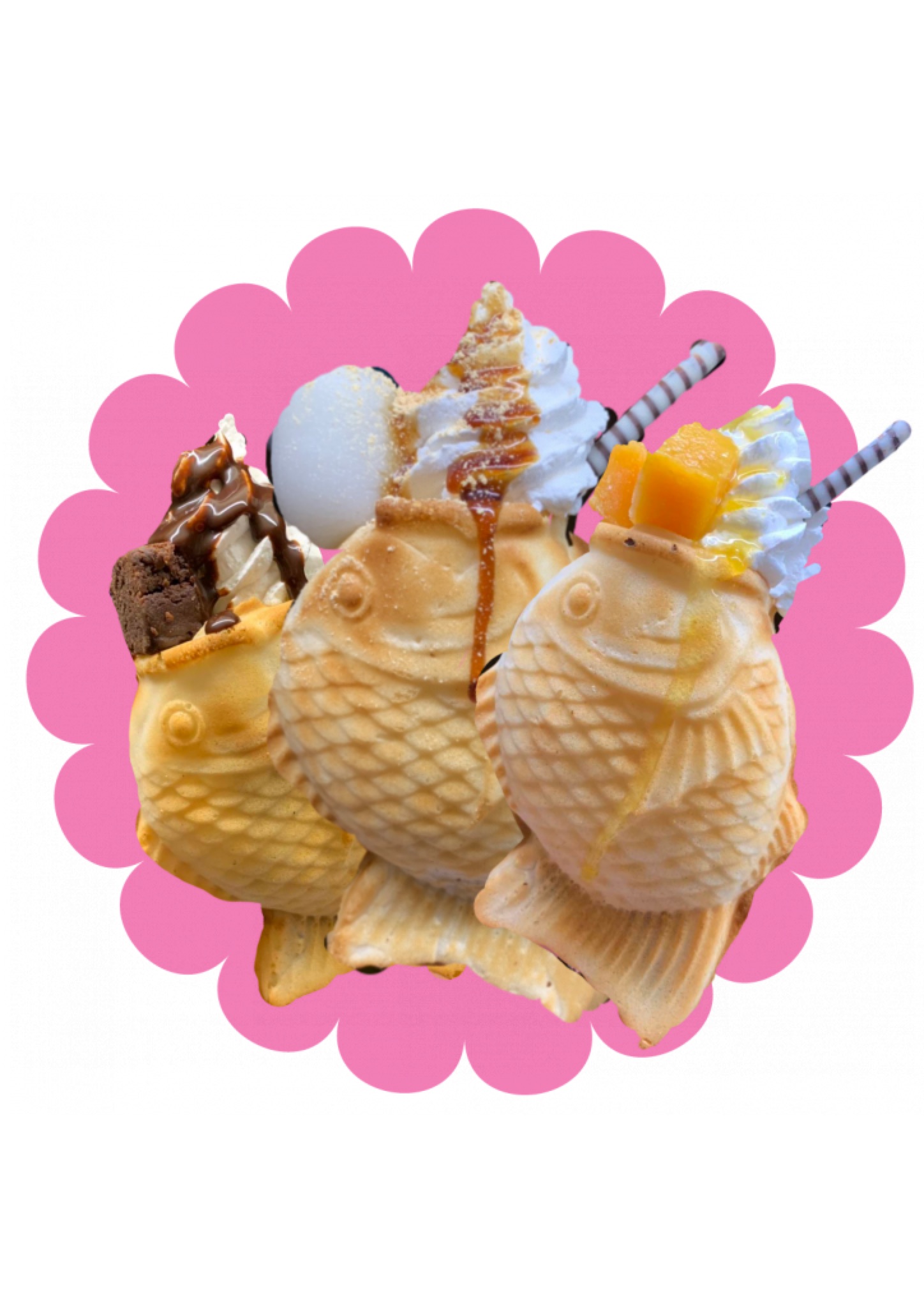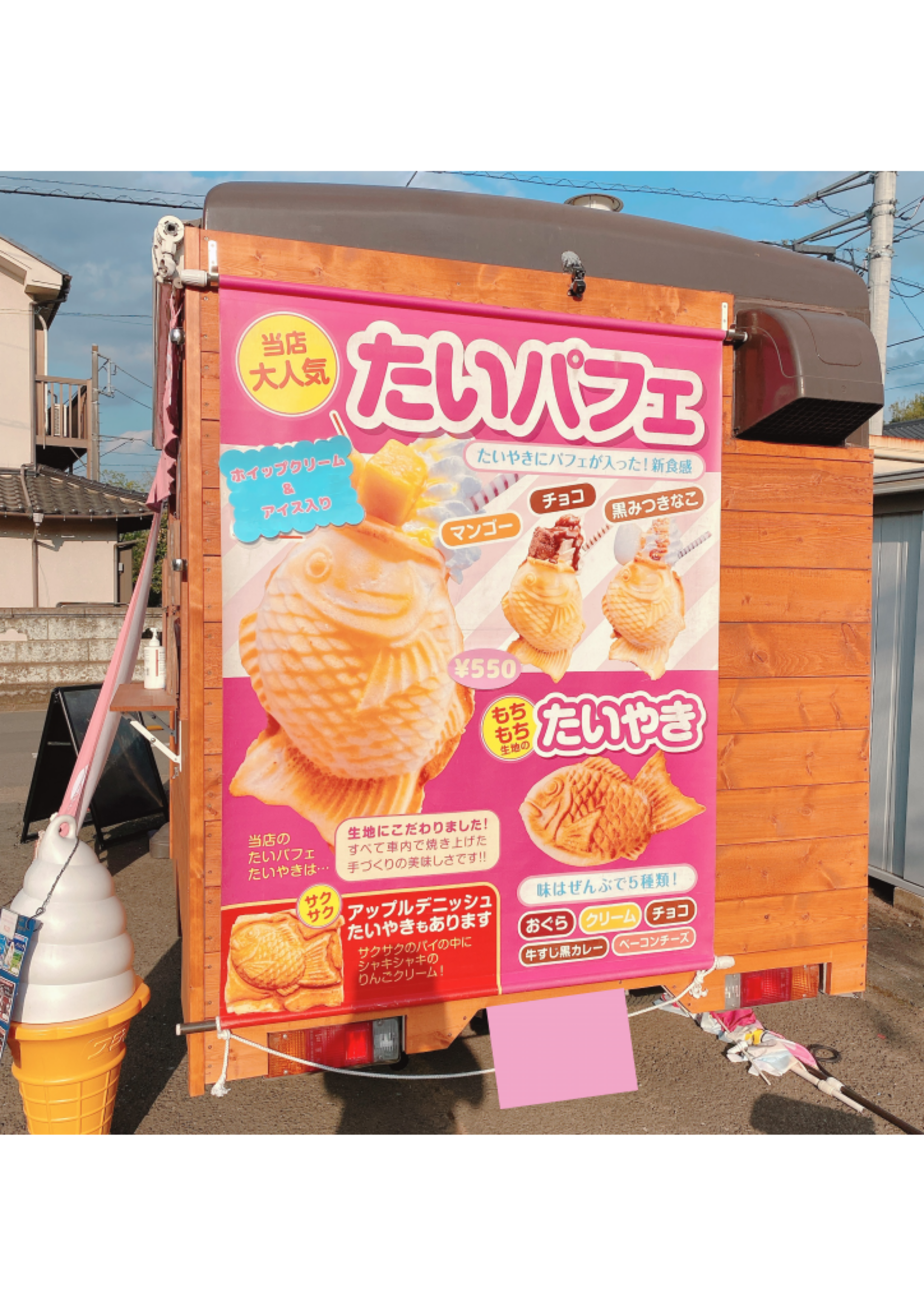 モチモチの生地にこだわって、車内で生地から手作りしております!定番のあんこは、北海道産おぐらを使用しており、お子様に人気のカスタードクリーム、チョコ、おかずたいやきでは、カマンベールチーズを使用したベーコンチーズ、牛すじ黒カレーを定番メニューとしてご用意しております。